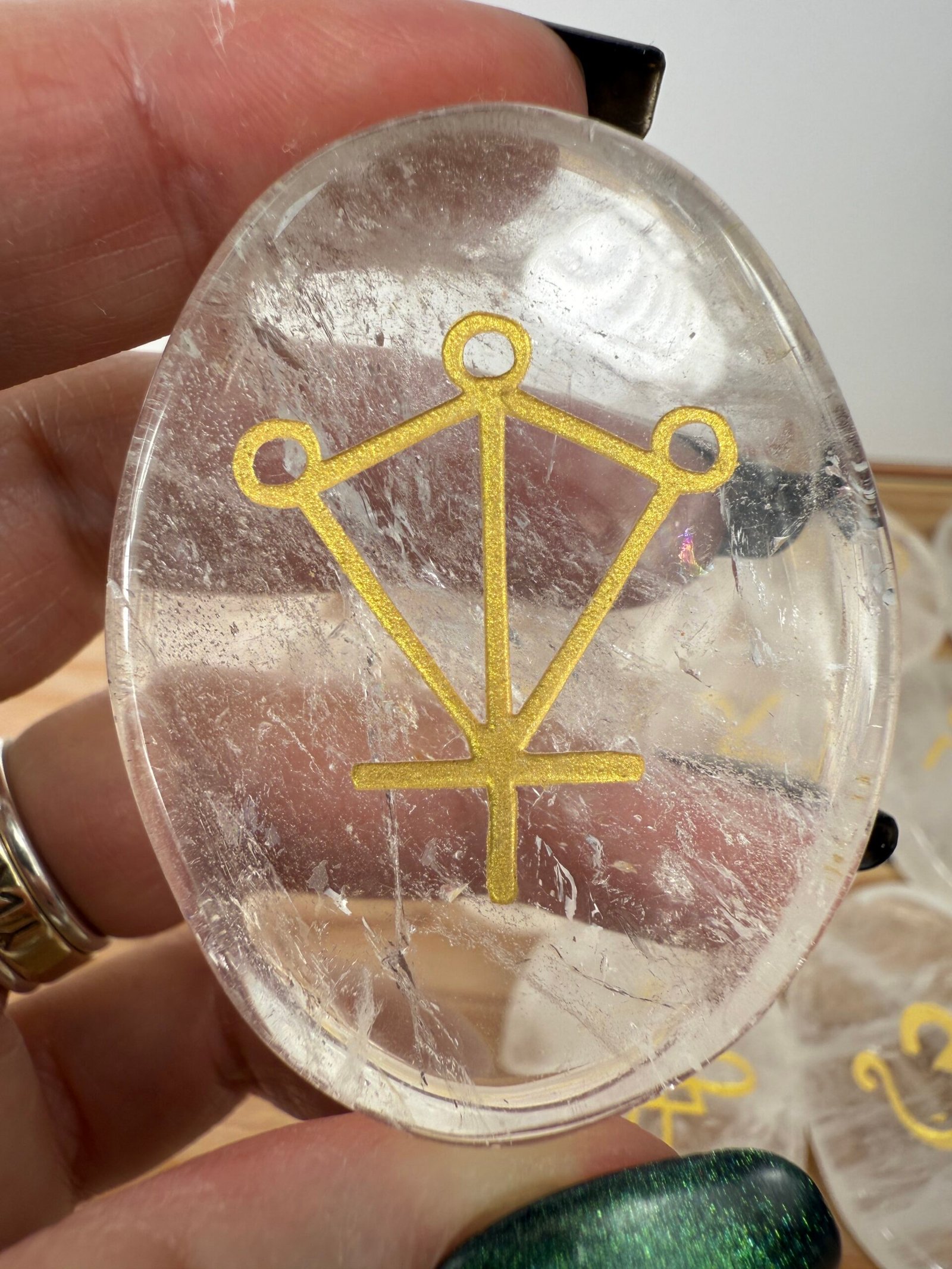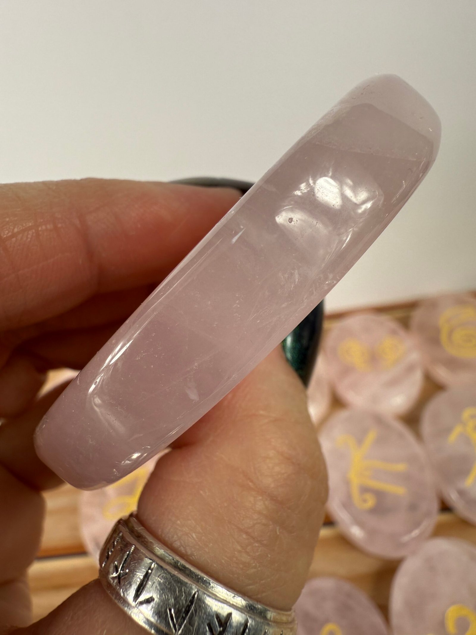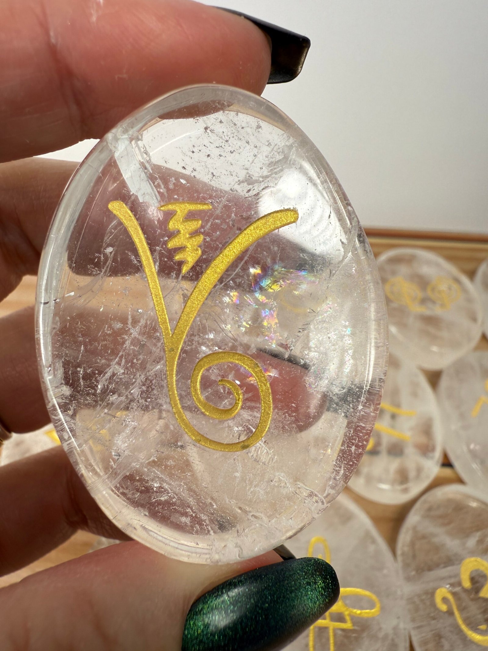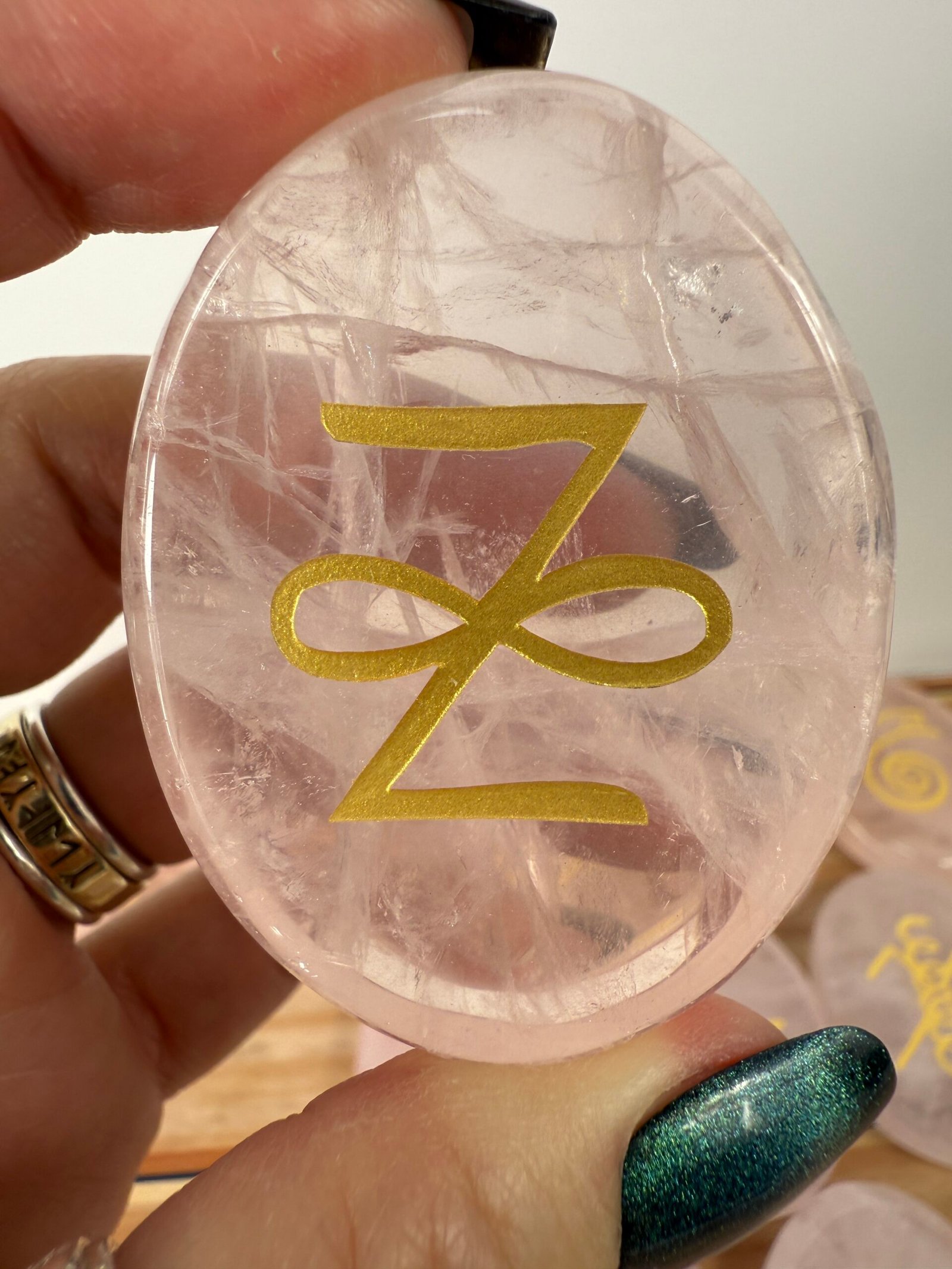 A set of 13 high quality rose quartz or high quality clear quartz flat palm stones, engraved with the Karuna reiki symbols.