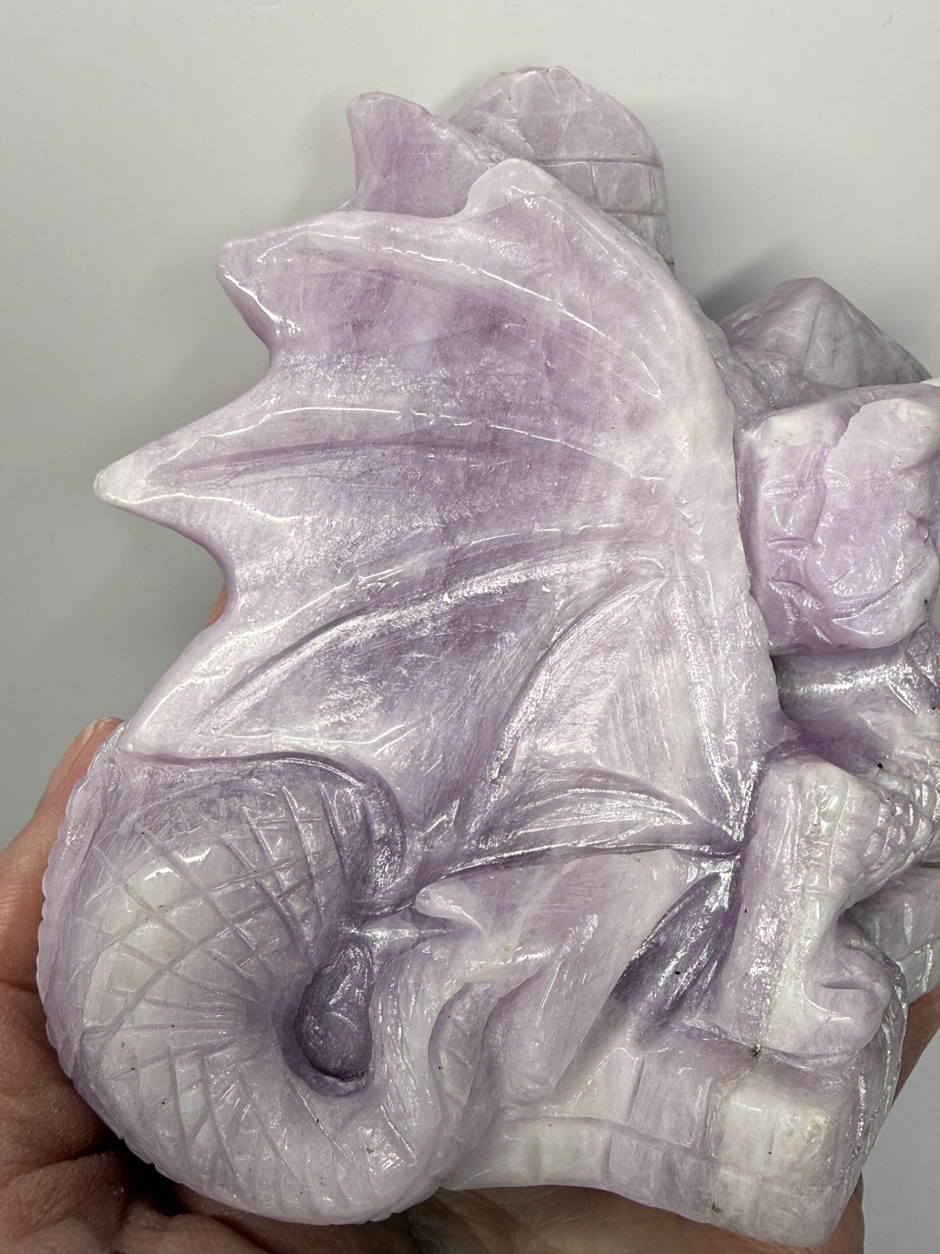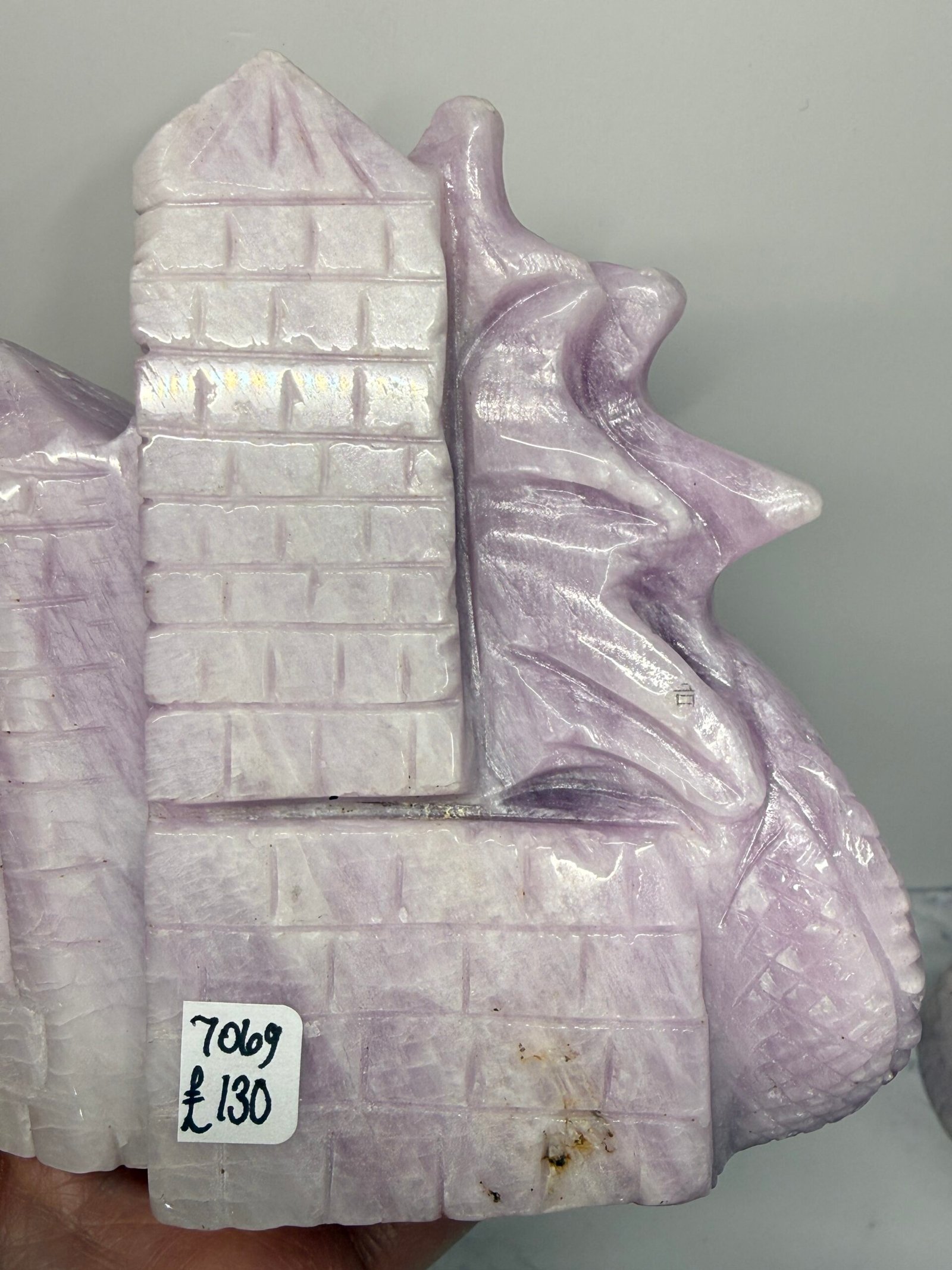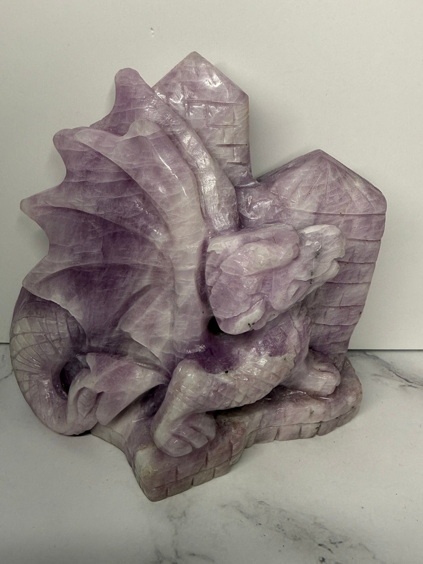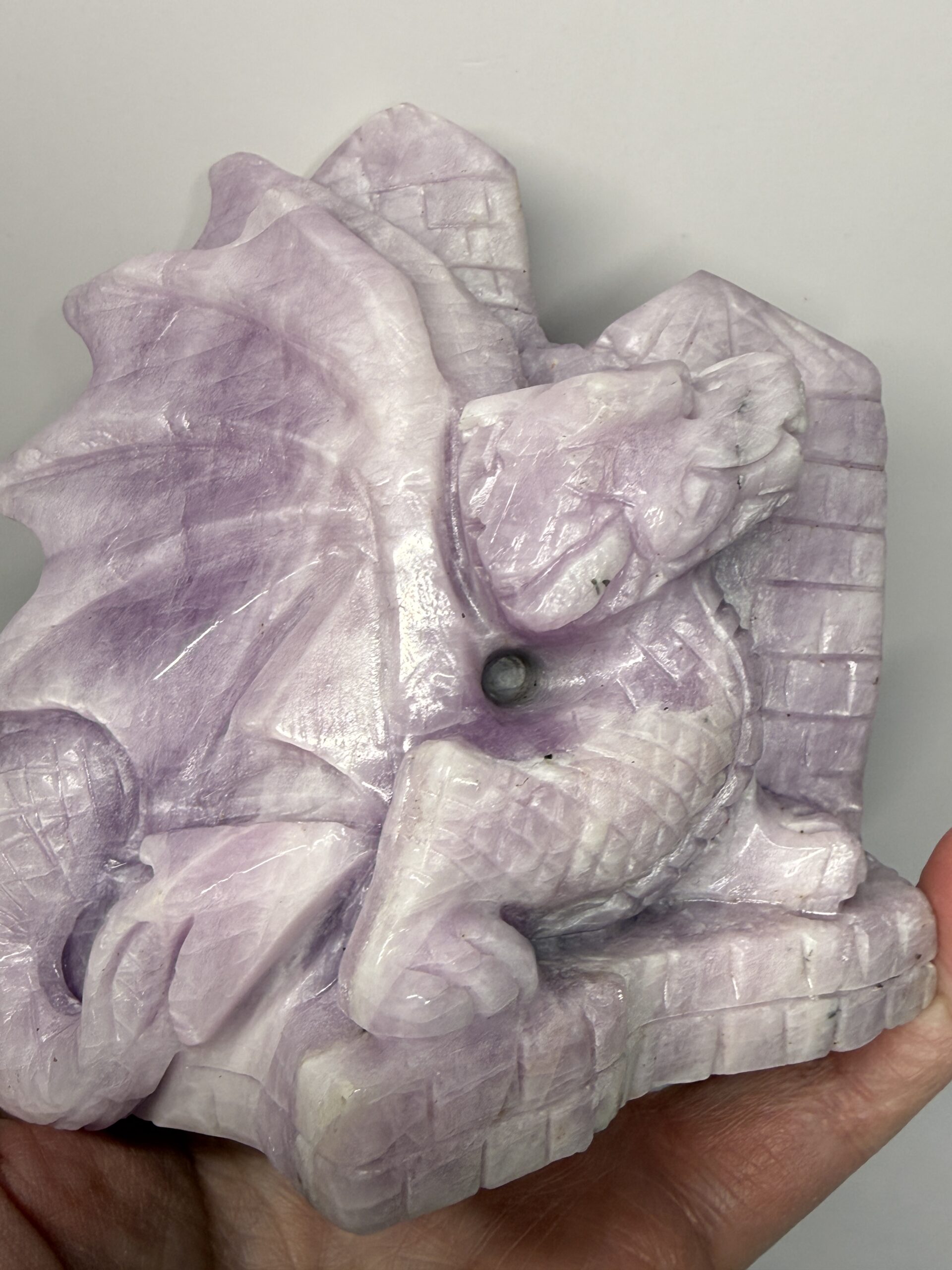 Gorgeous Kunzite dragon perched upon a castle wall. Stunning colours and shimmering scales in this hand carved dragon.