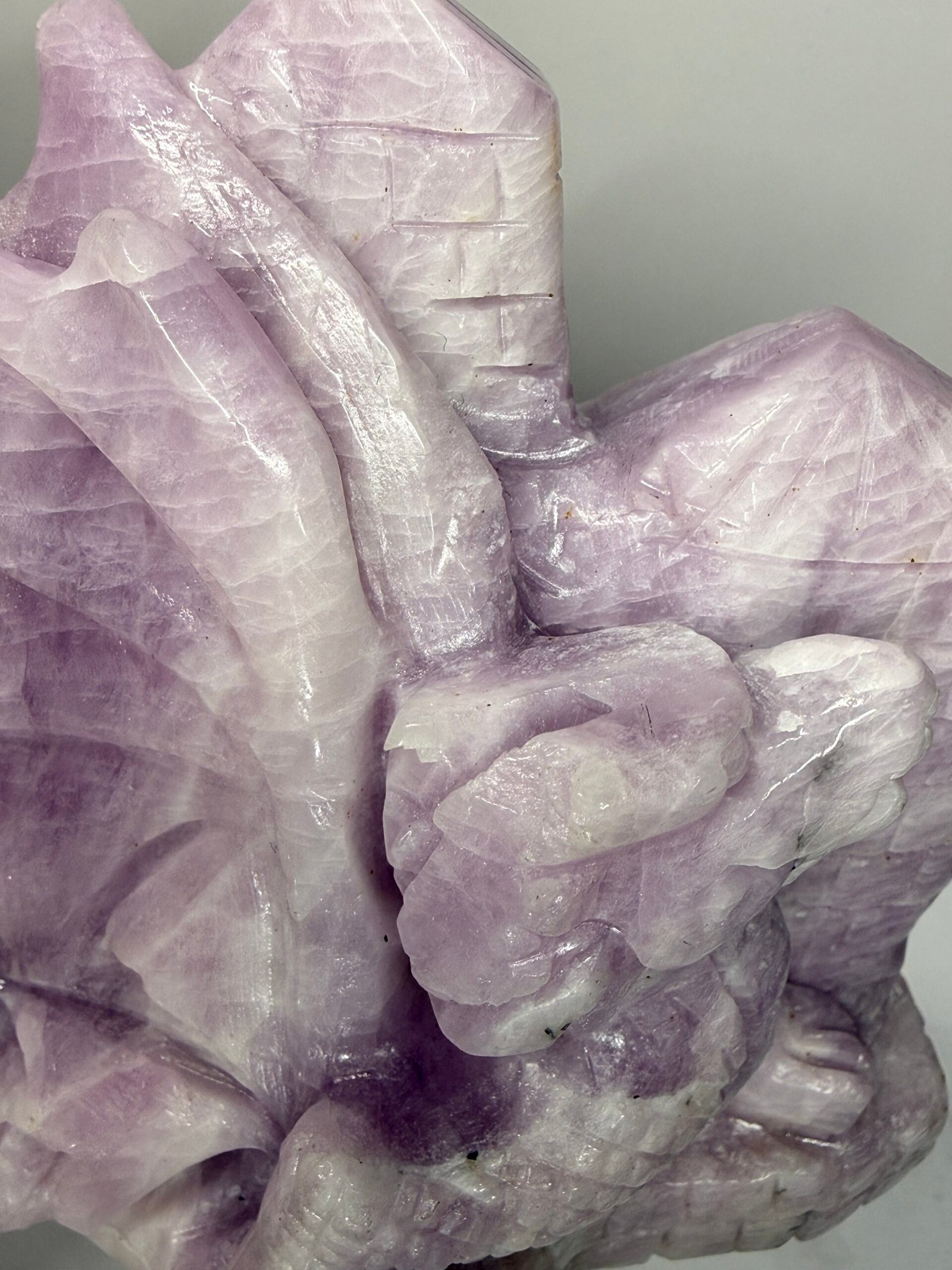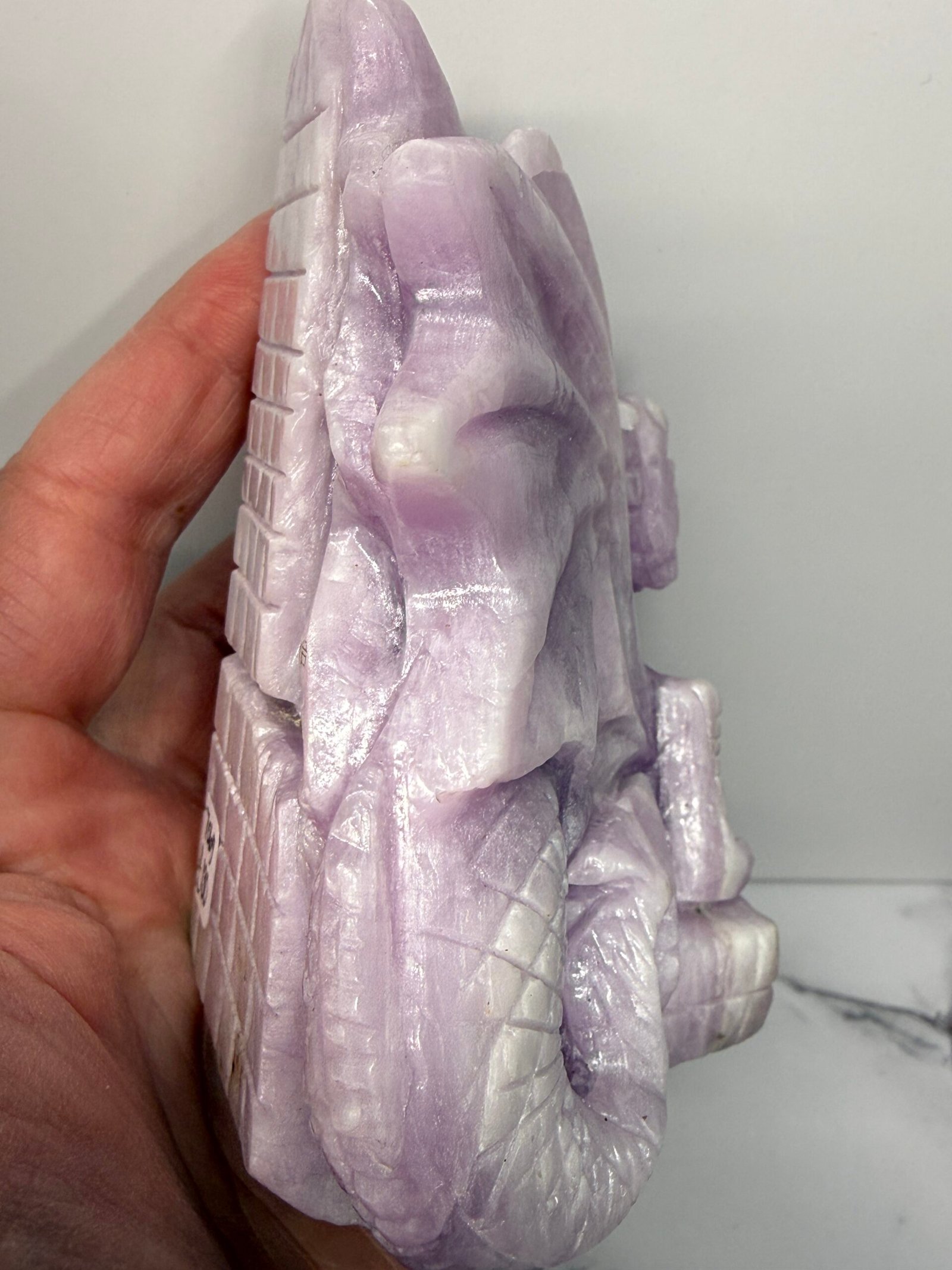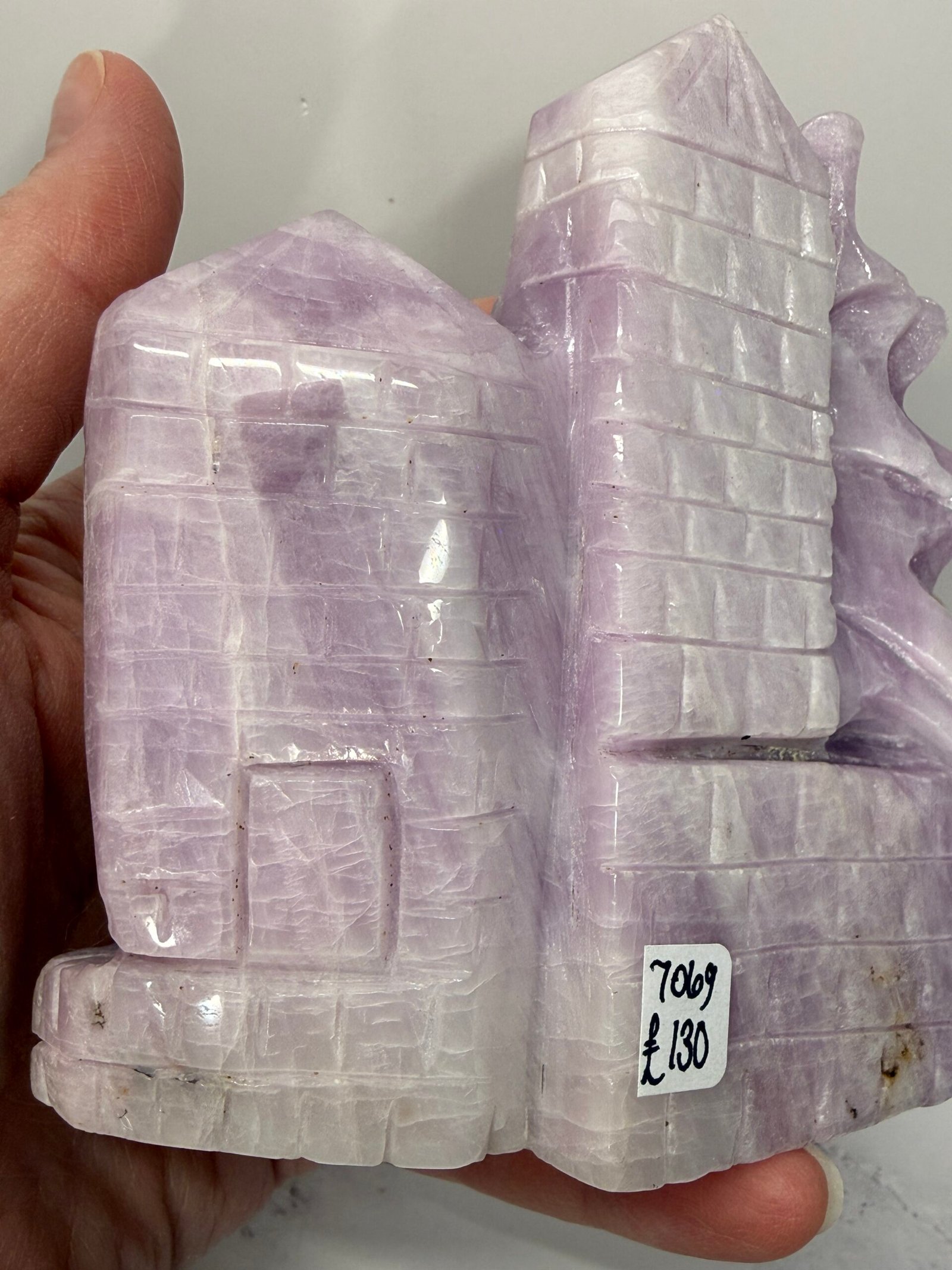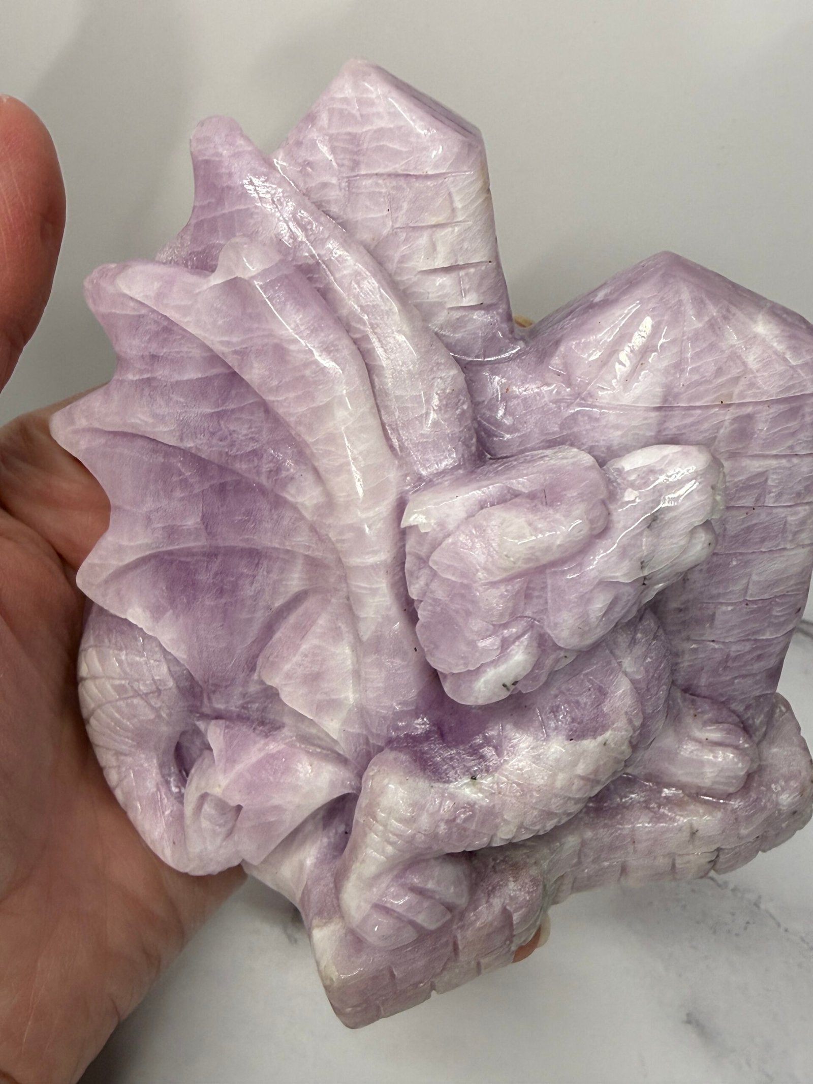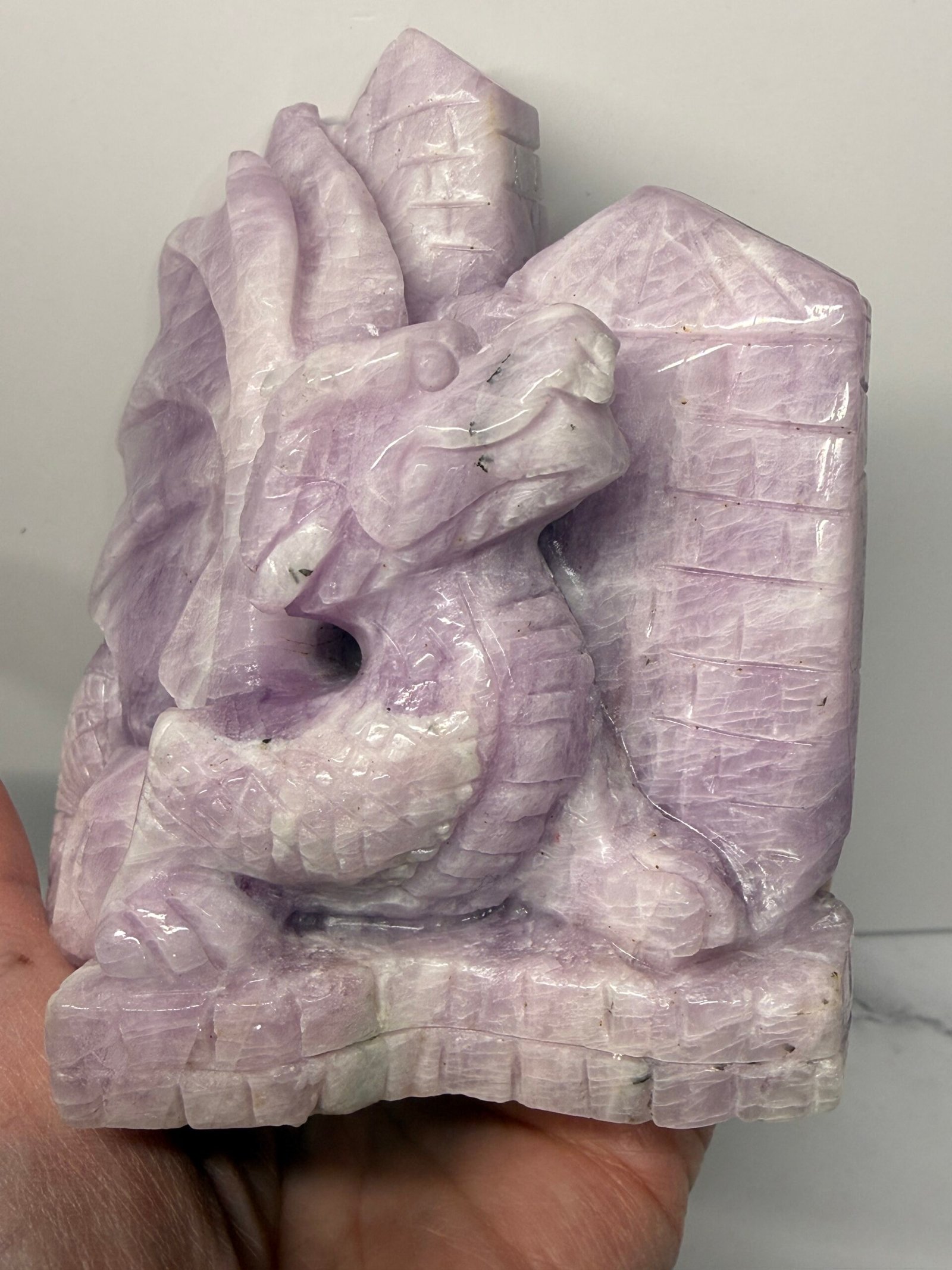 Gorgeous Kunzite dragon perched upon a castle wall. Stunning colours and shimmering scales in this hand carved dragon.