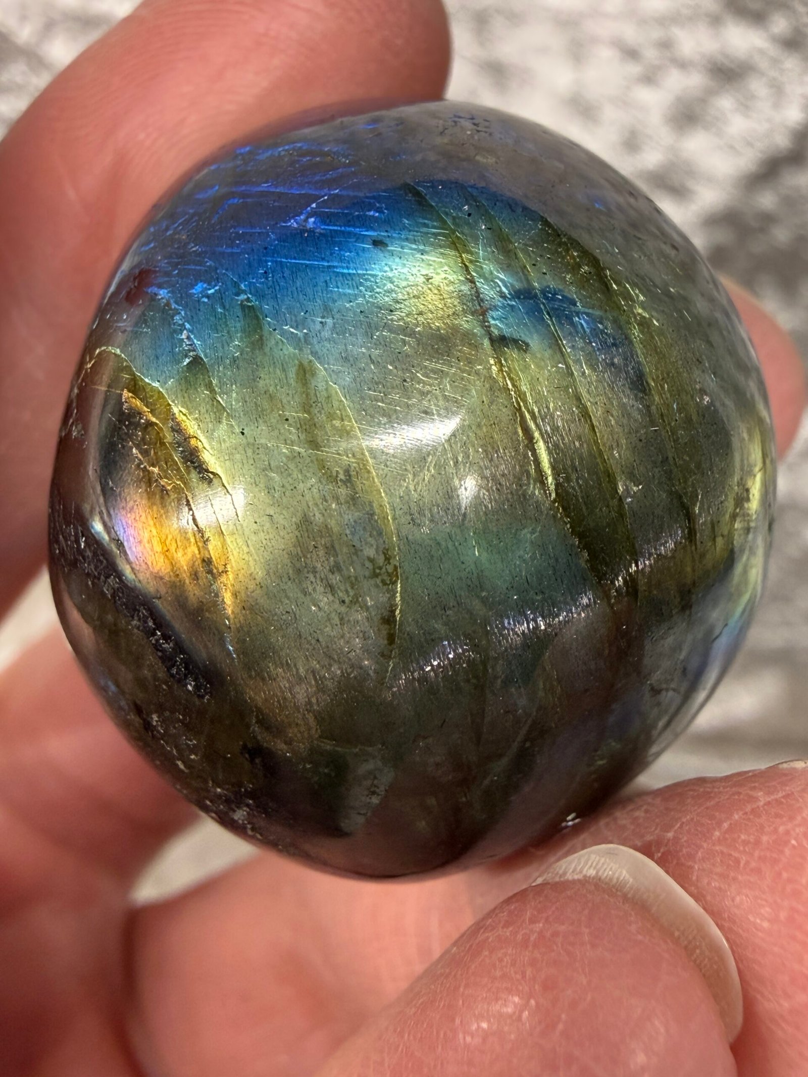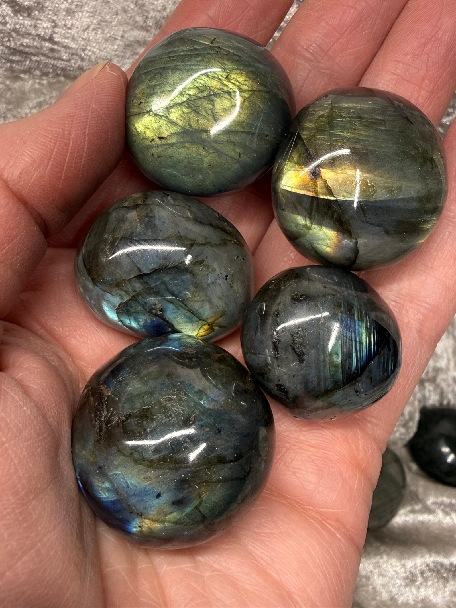 High quality, rounded labradorite tumble stones.