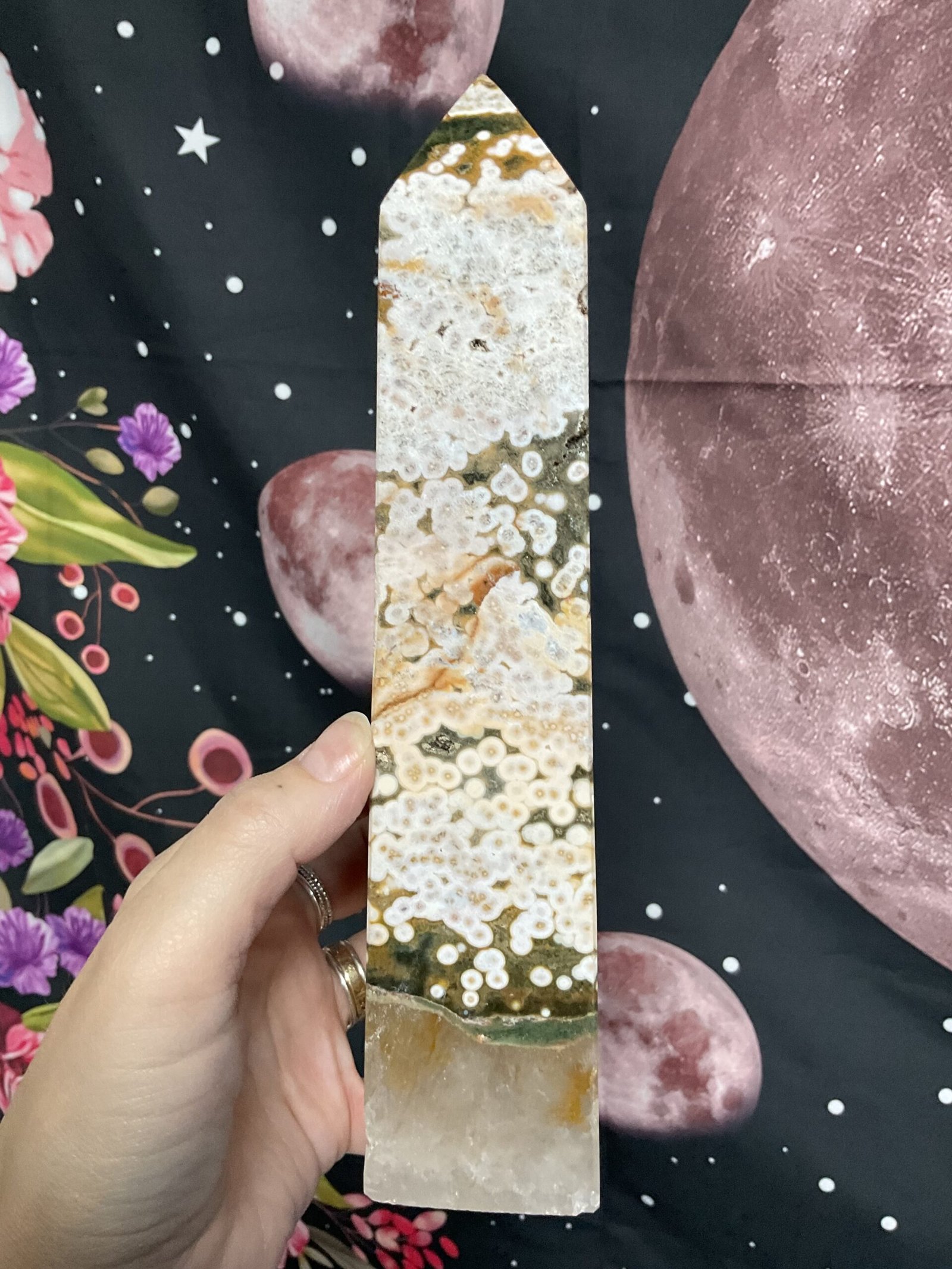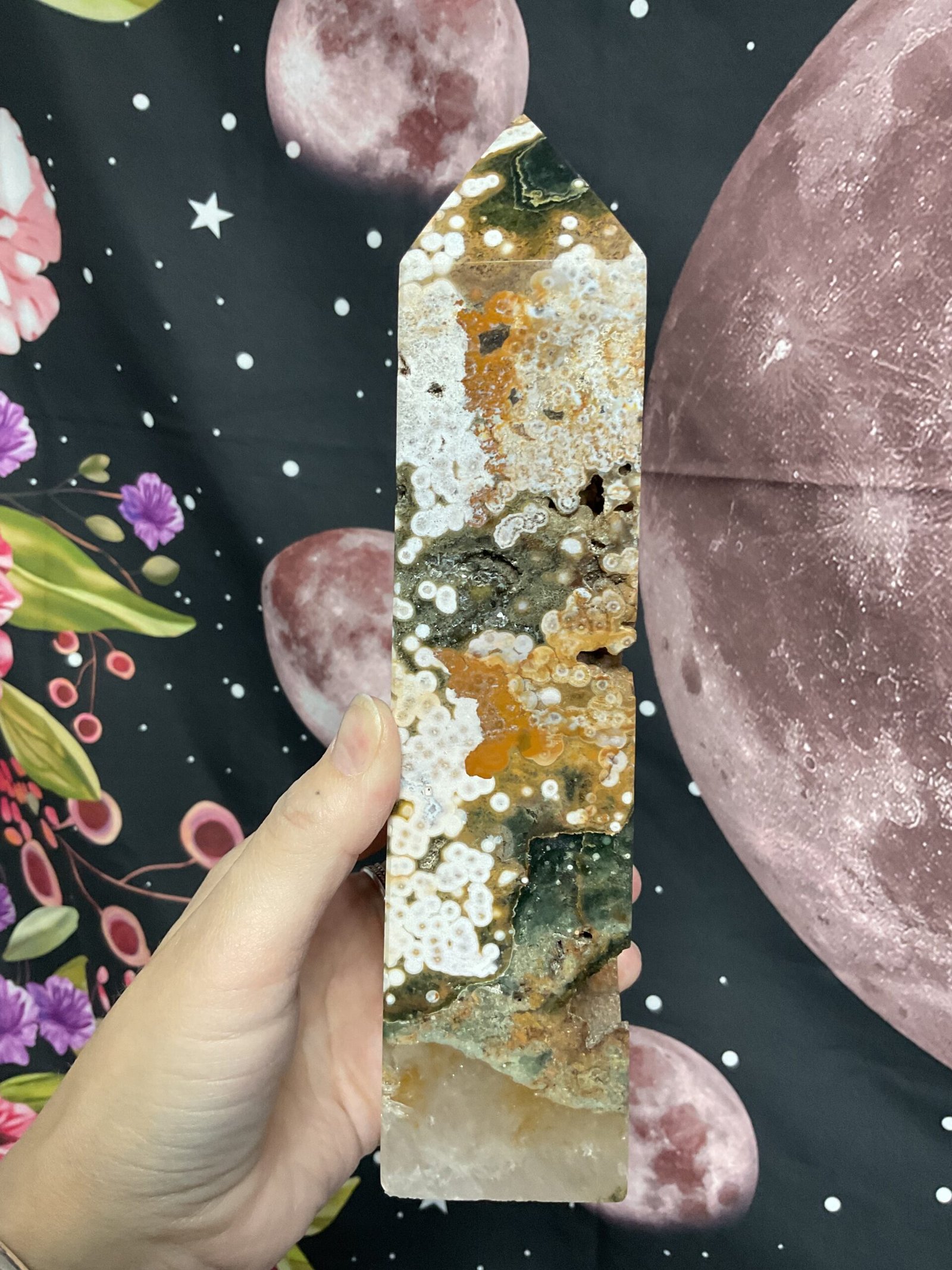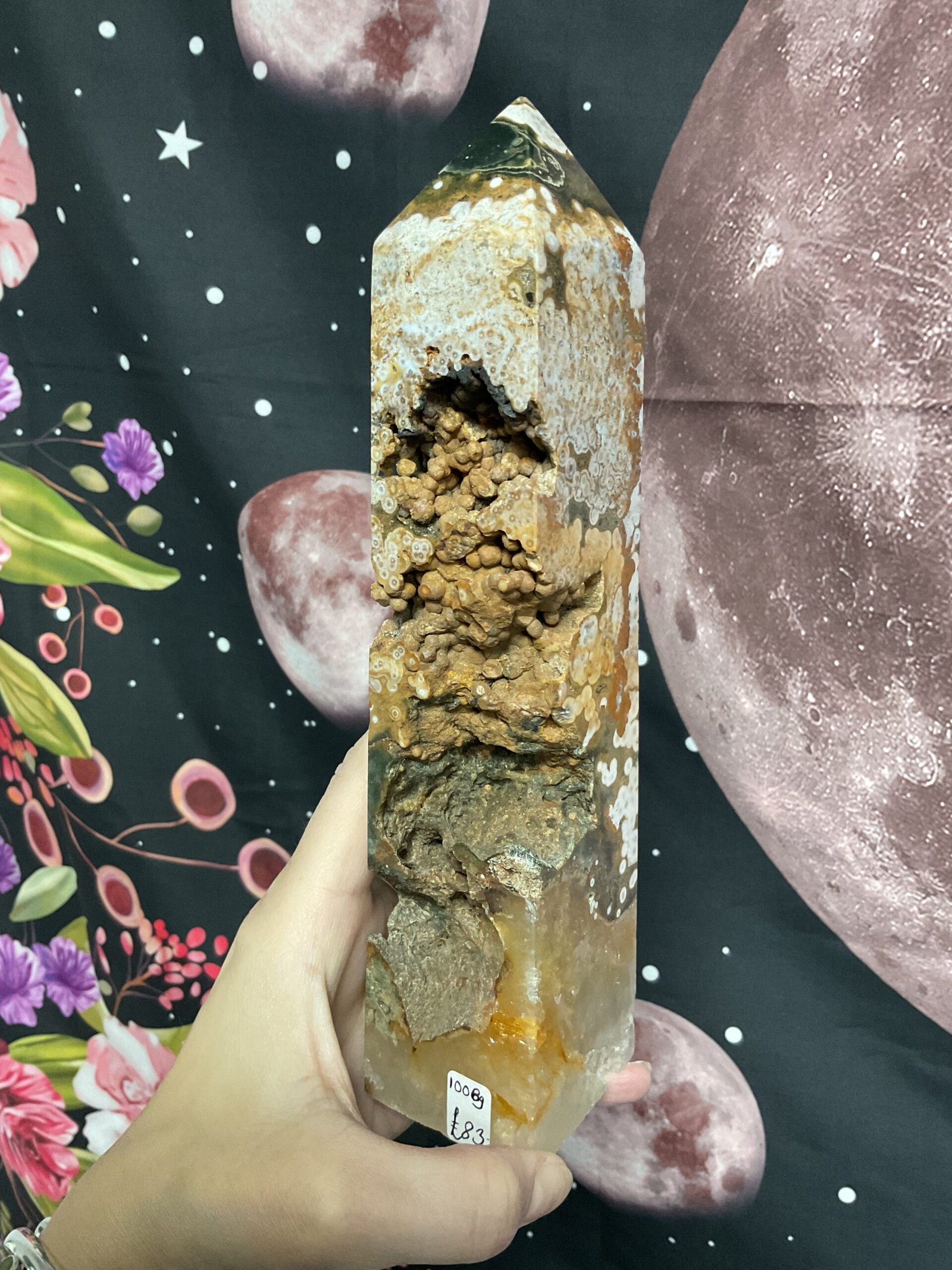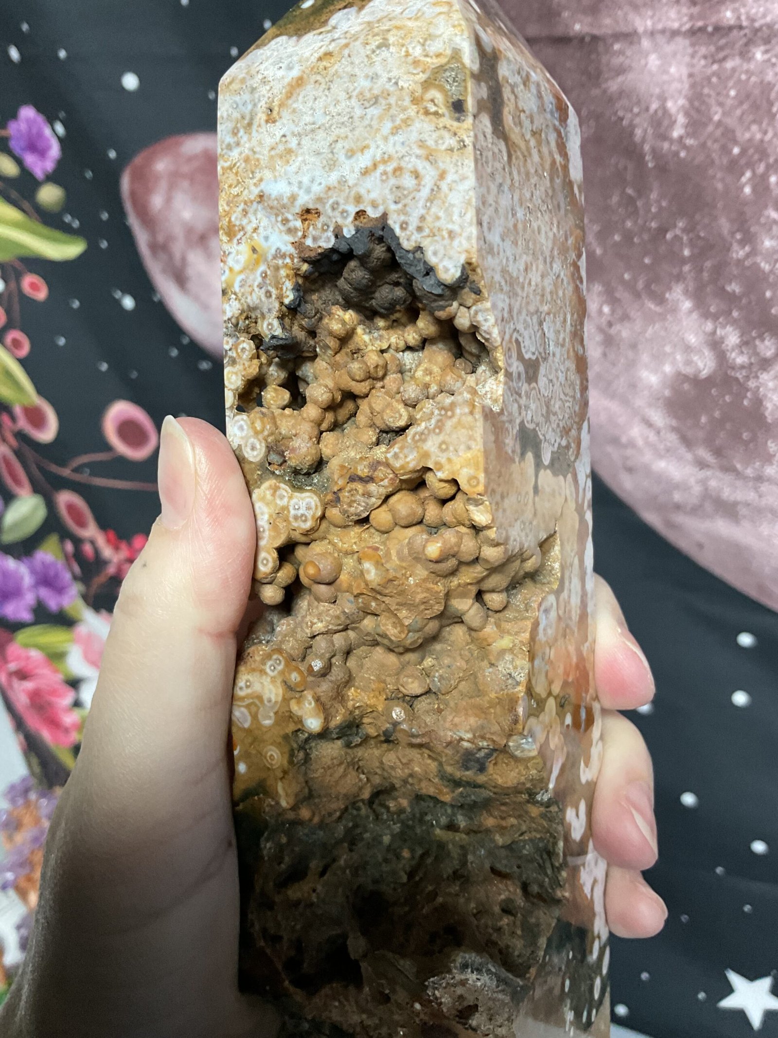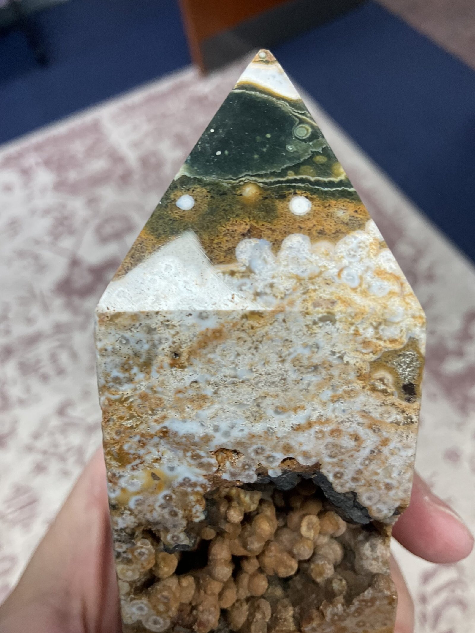 This fabulous tower has it all; druse pockets, botryoidal formation, orbicular patterning, and even golden healer quartz at the bottom. It also has a beautiful combination of colours. I love this tower!