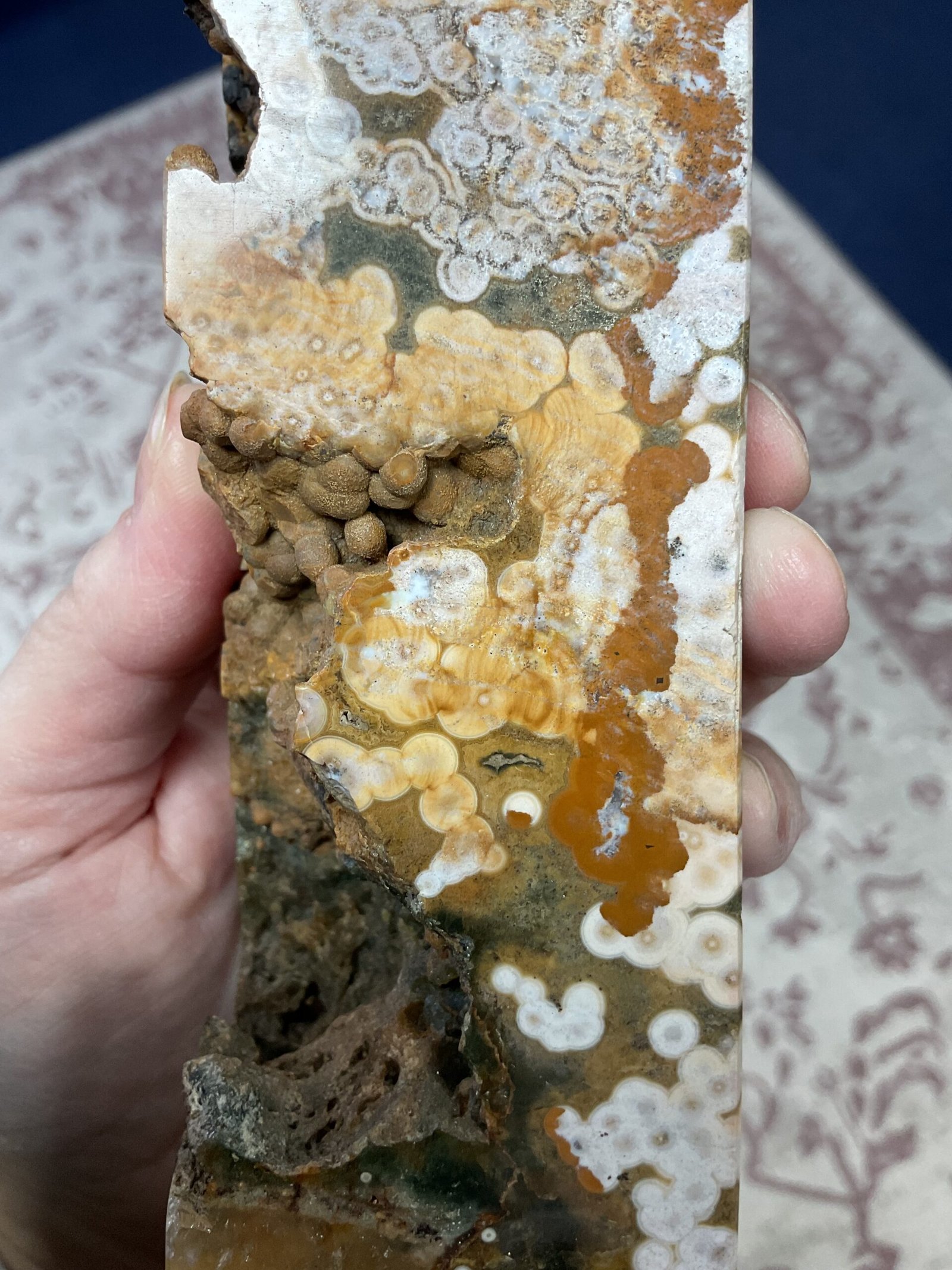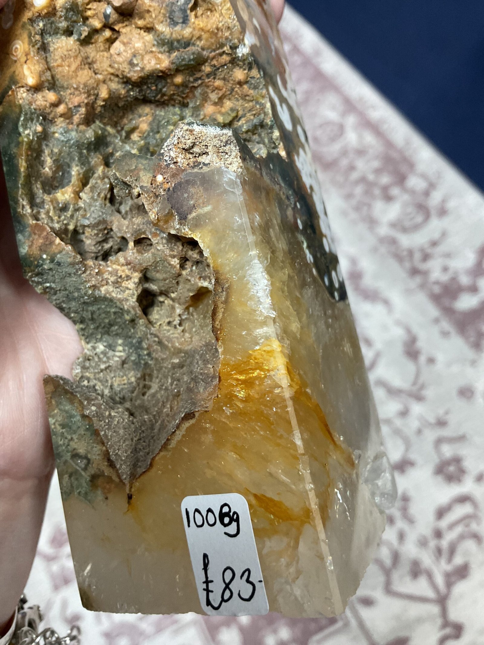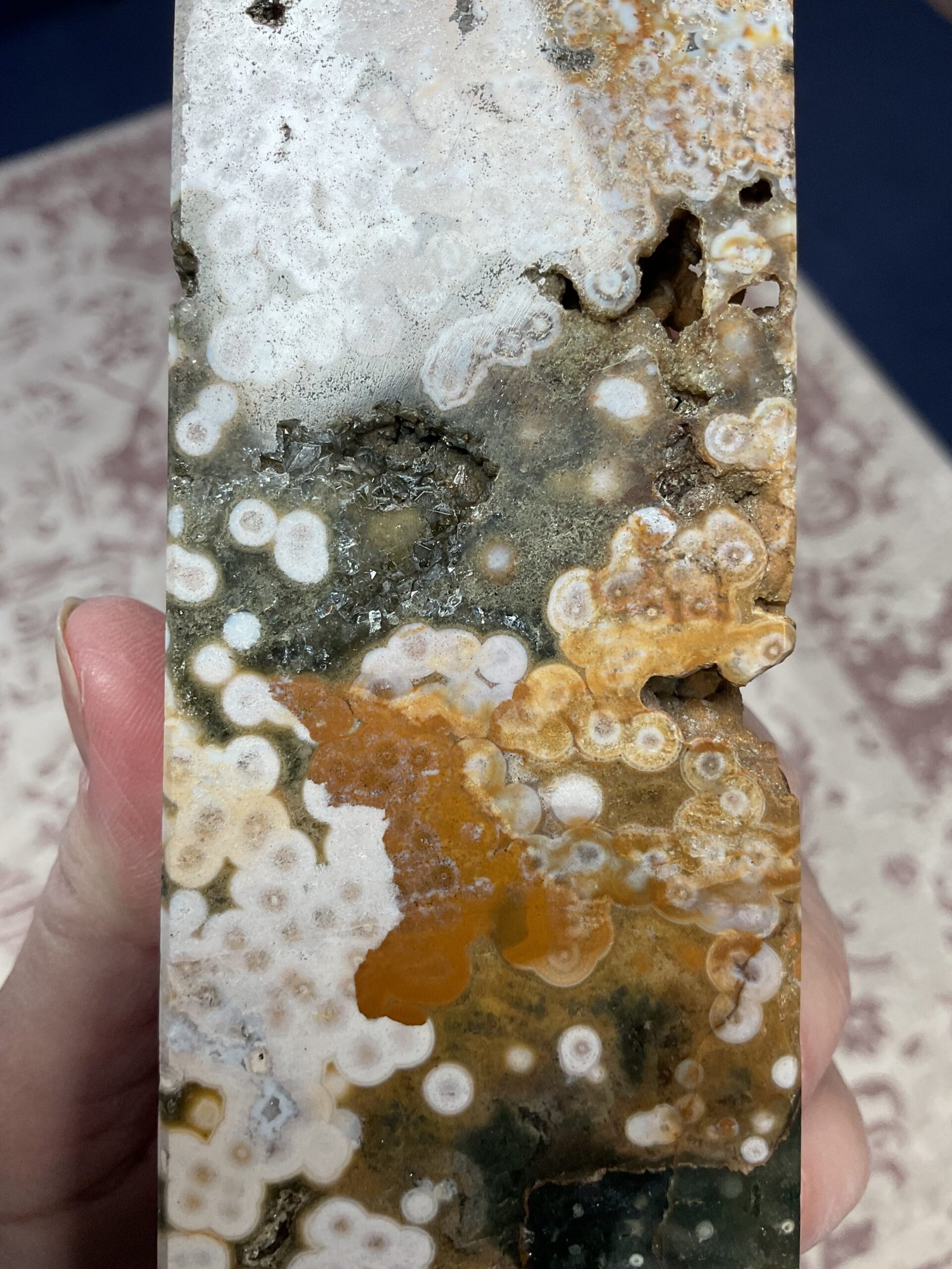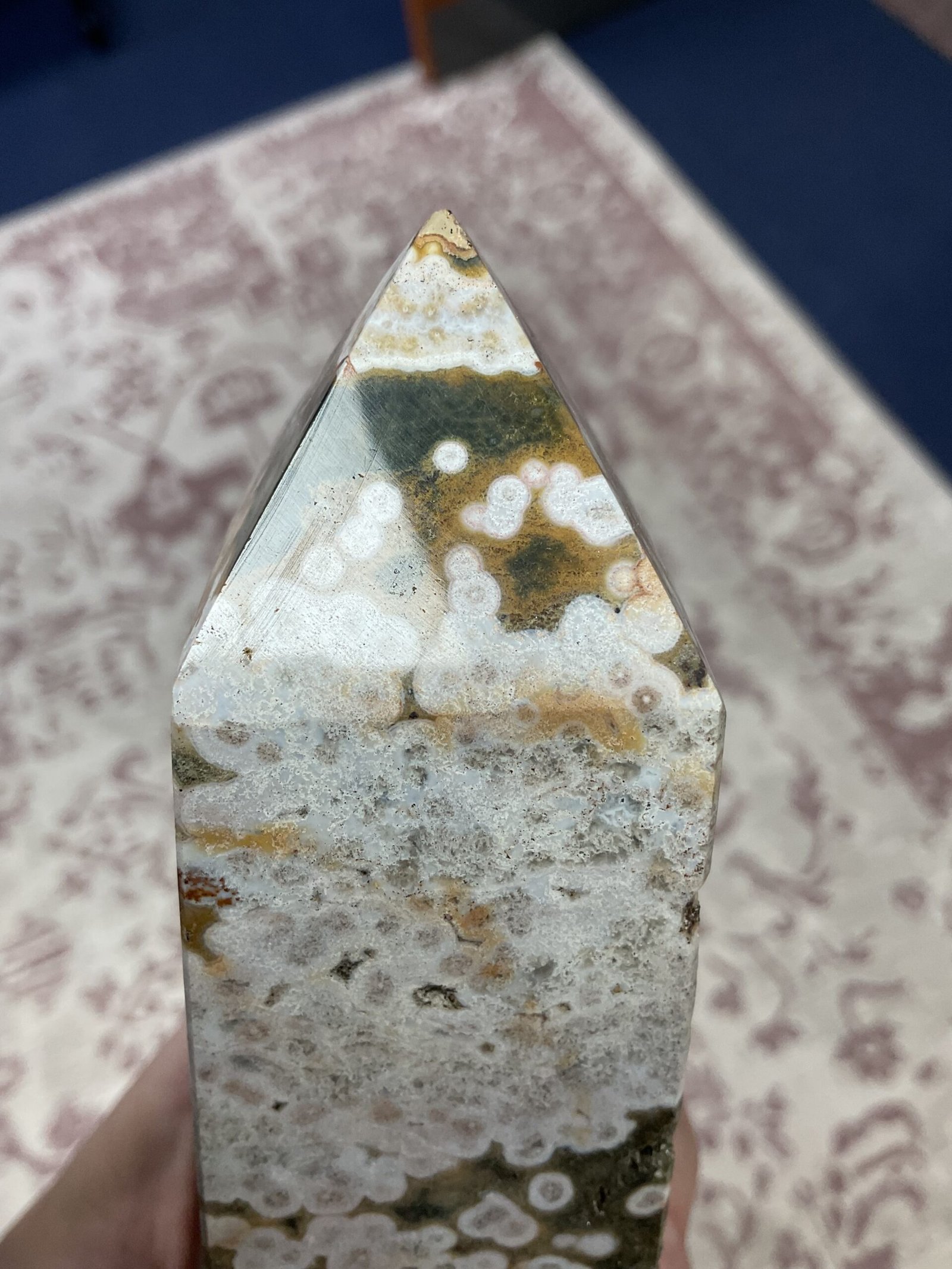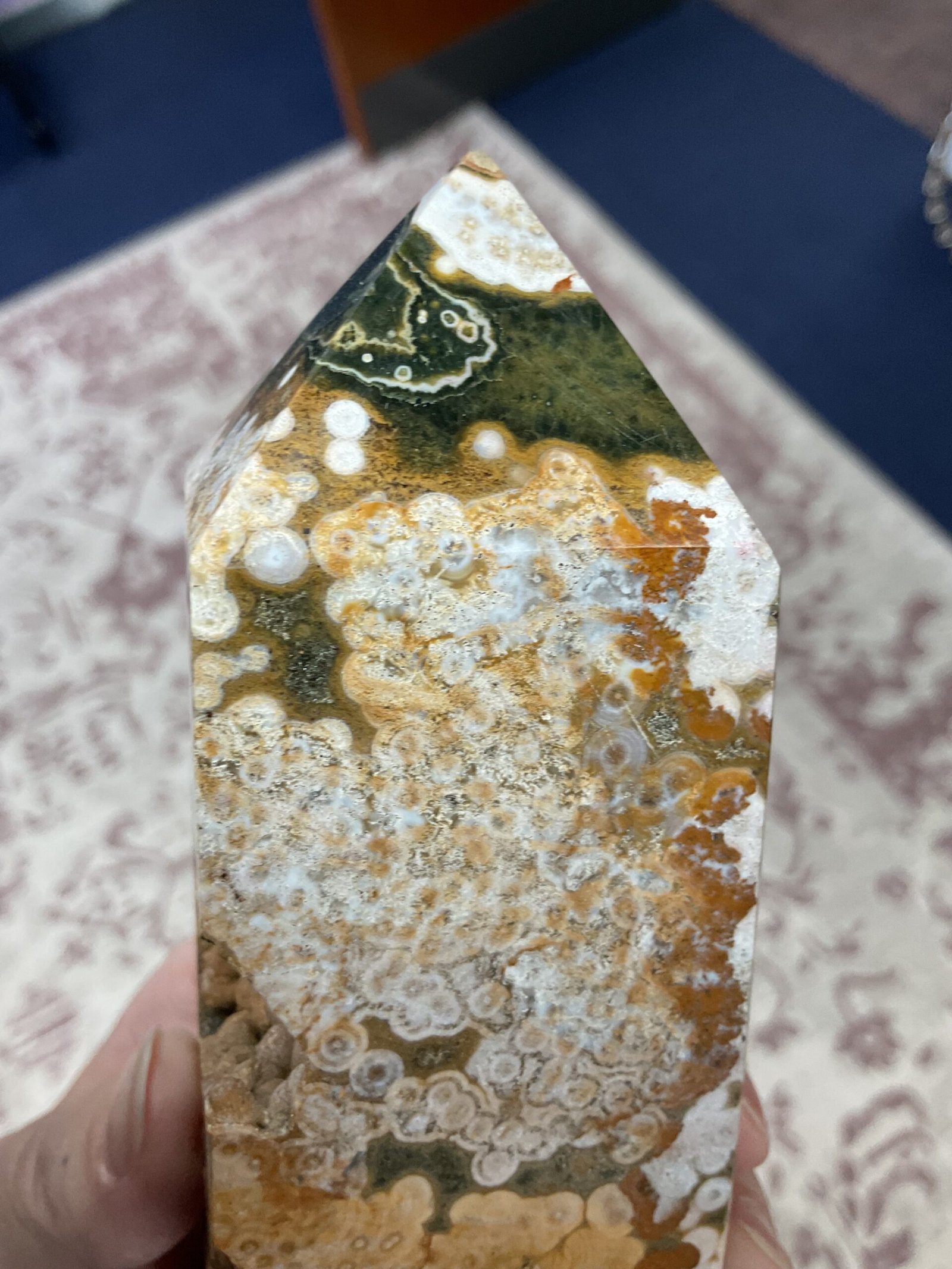 This fabulous tower has it all; druse pockets, botryoidal formation, orbicular patterning, and even golden healer quartz at the bottom. It also has a beautiful combination of colours. I love this tower!