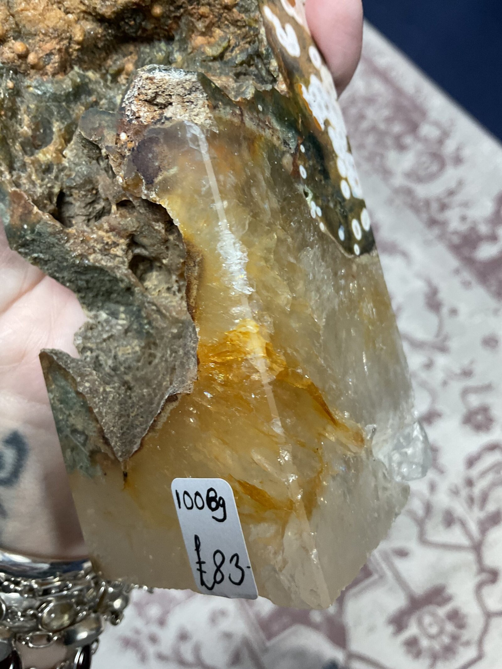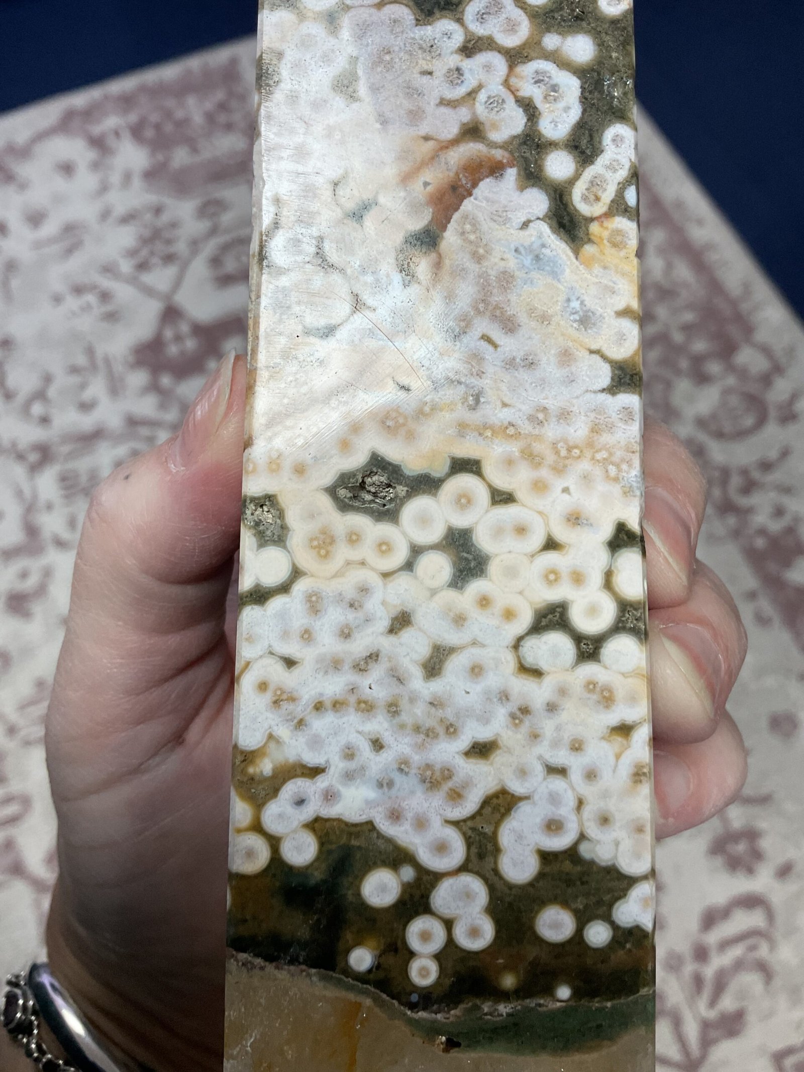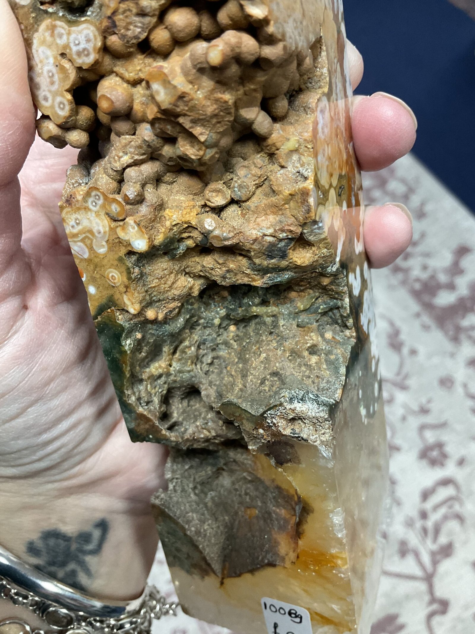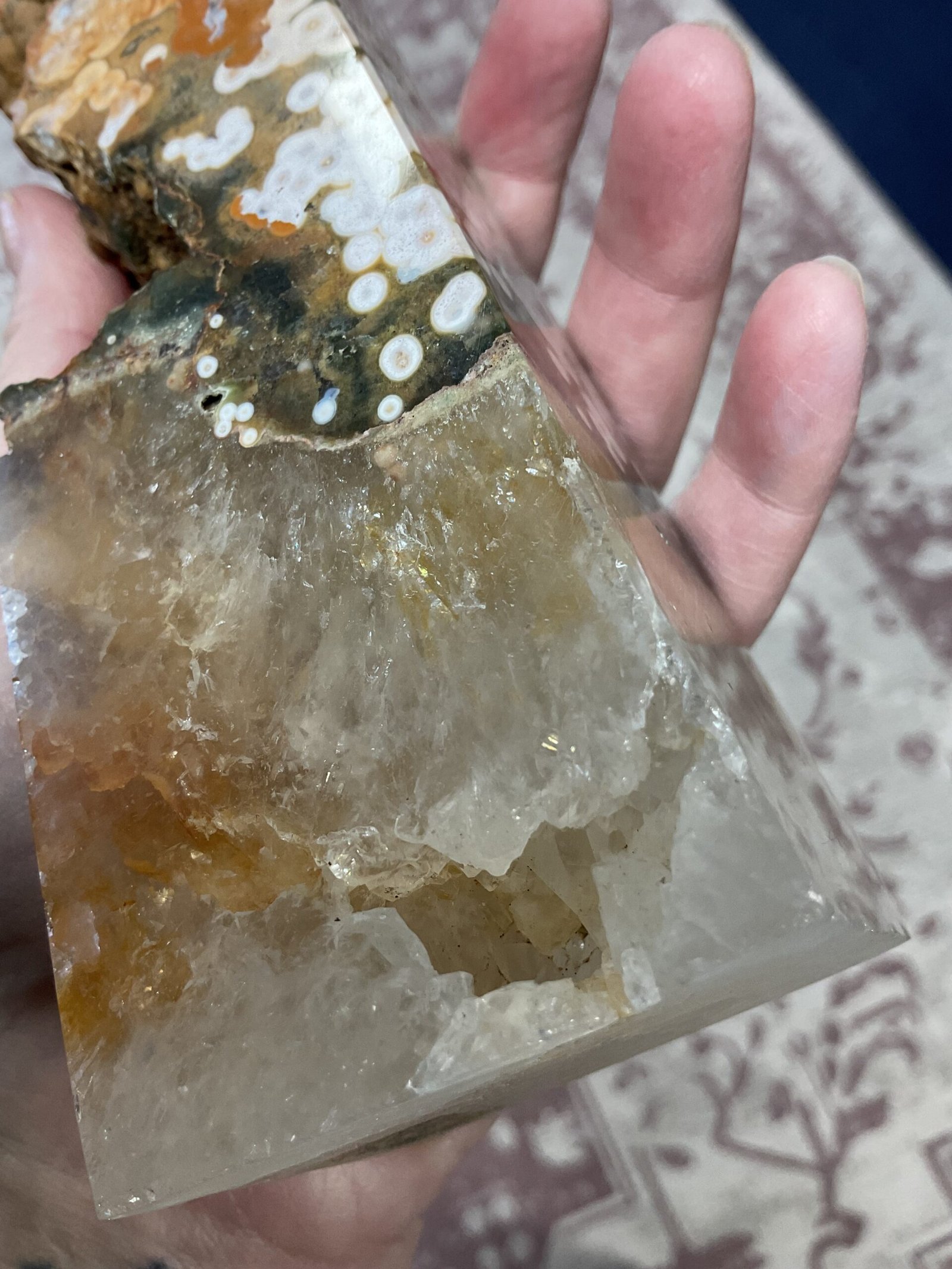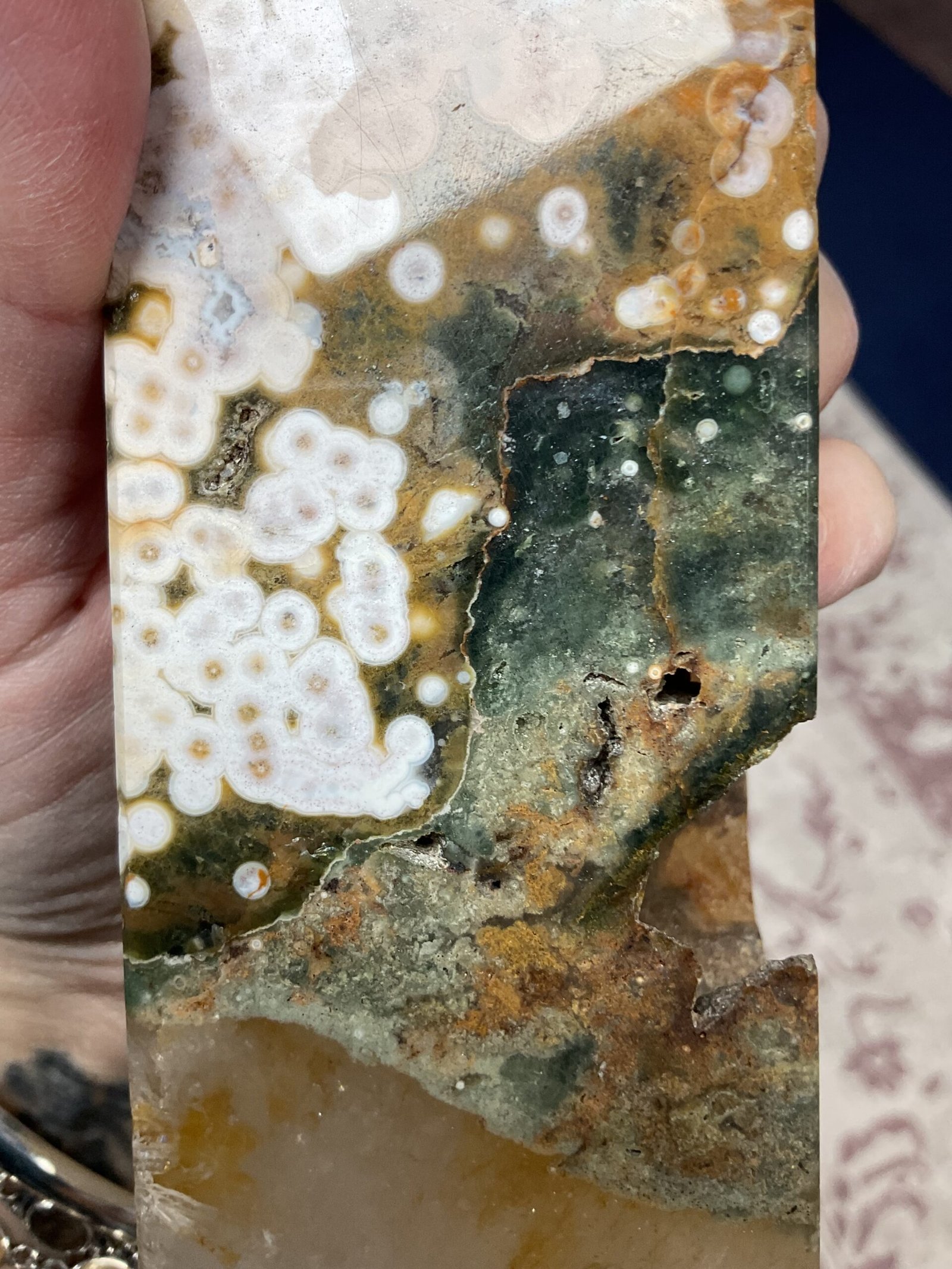 This fabulous tower has it all; druse pockets, botryoidal formation, orbicular patterning, and even golden healer quartz at the bottom. It also has a beautiful combination of colours. I love this tower!