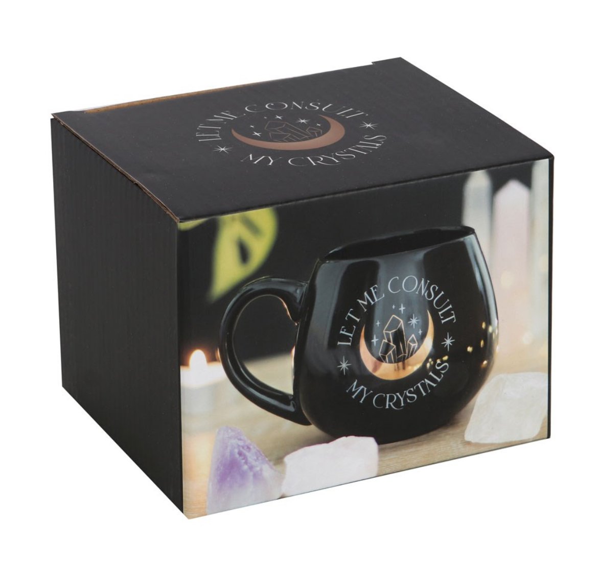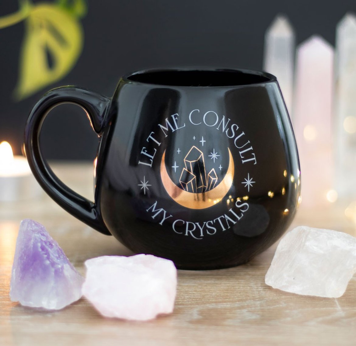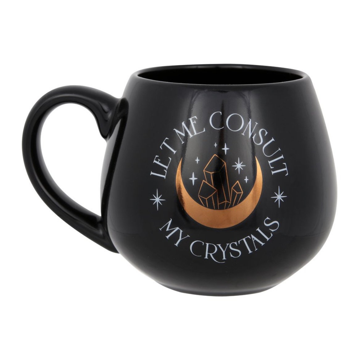 This trendy black mug features ‘Let me consult my crystals’ text accented by a gold foil crescent moon and crystal design.