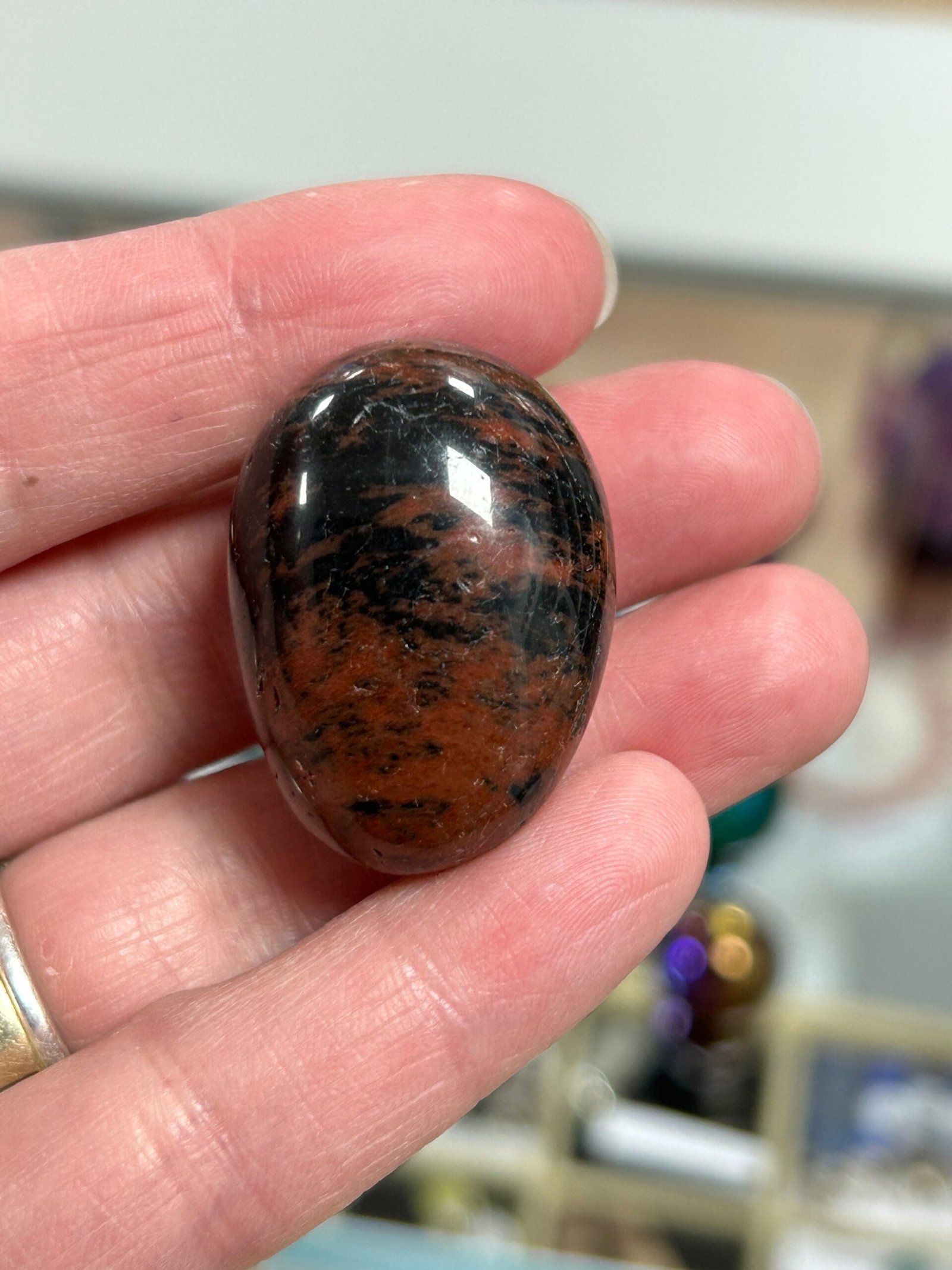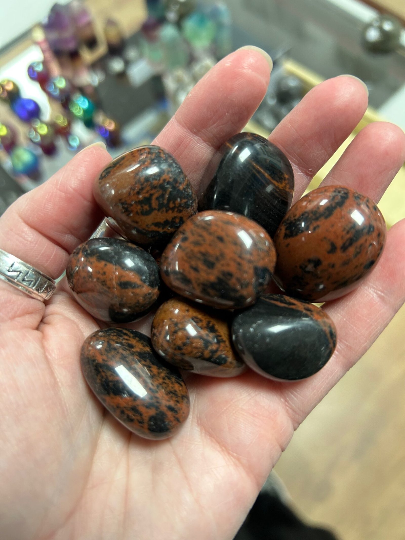 Mahogany Obsidian is a unique form of Obsidian containing small inclusions of Magnetite or Hematite. It is a deeply grounding stone that activates the lower chakras, removing any imbalances and blockages from