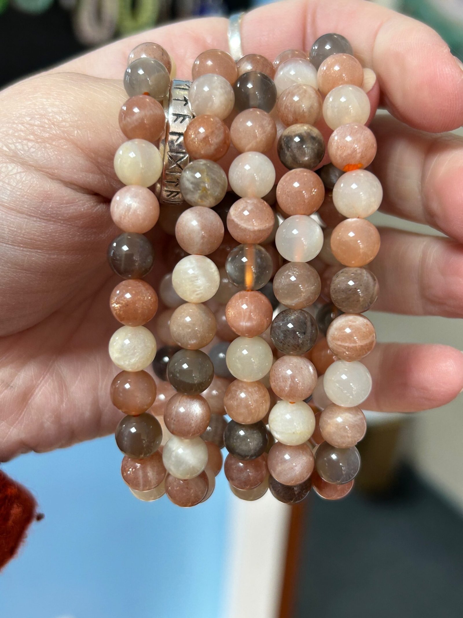 Beautiful bracelet with a mix of black moonstone, peach moonstone and moonstone 8mm beads.