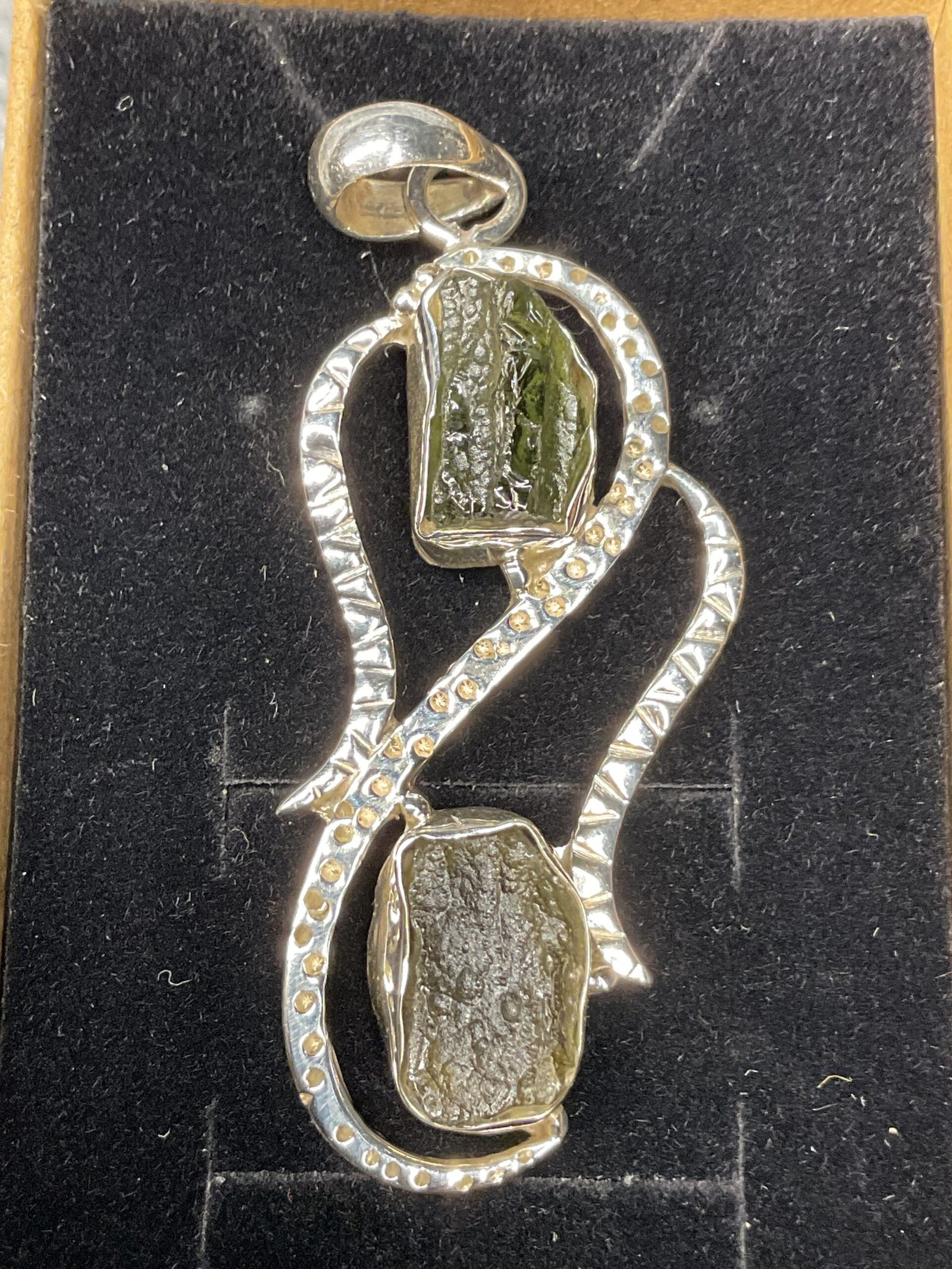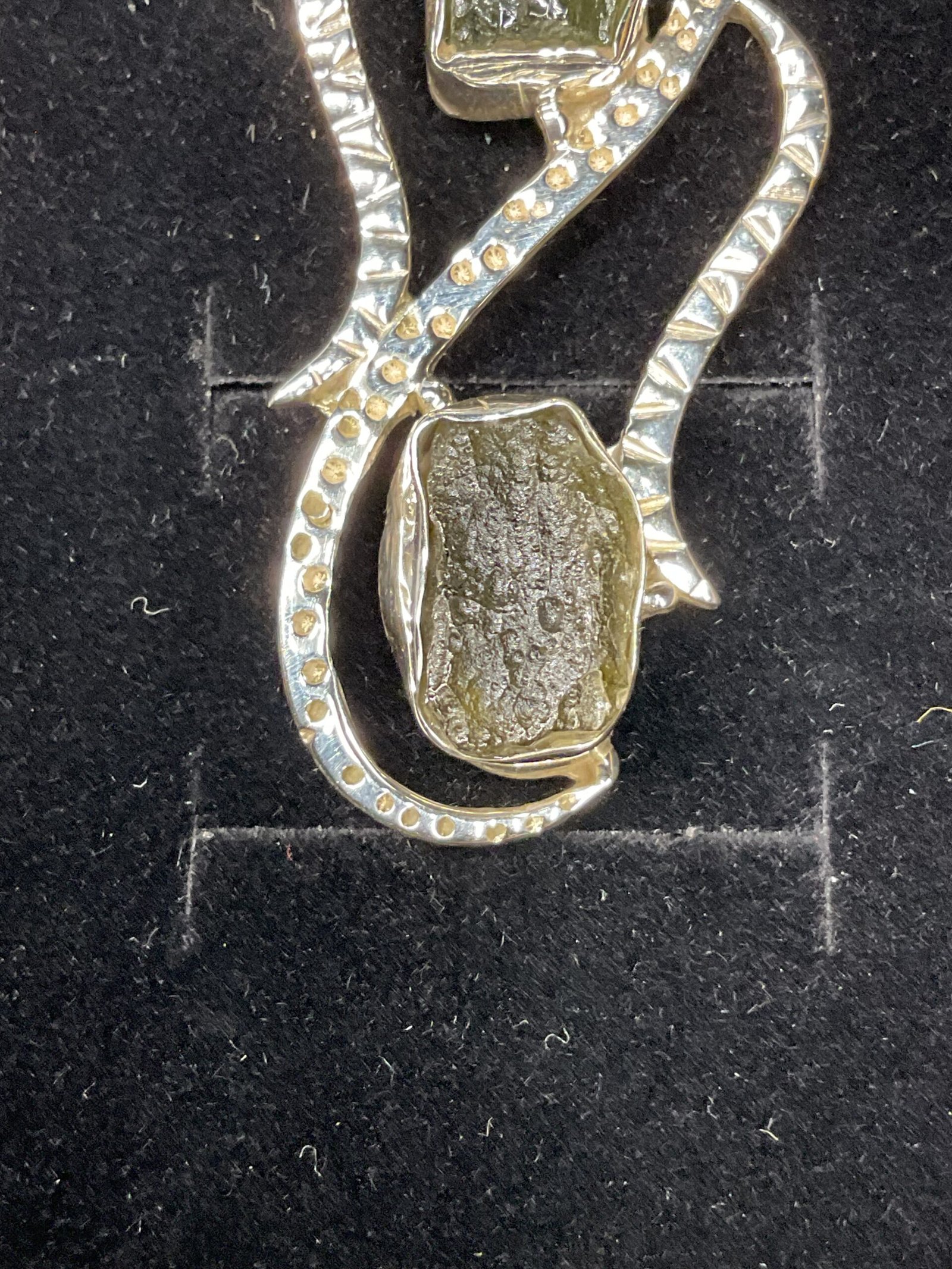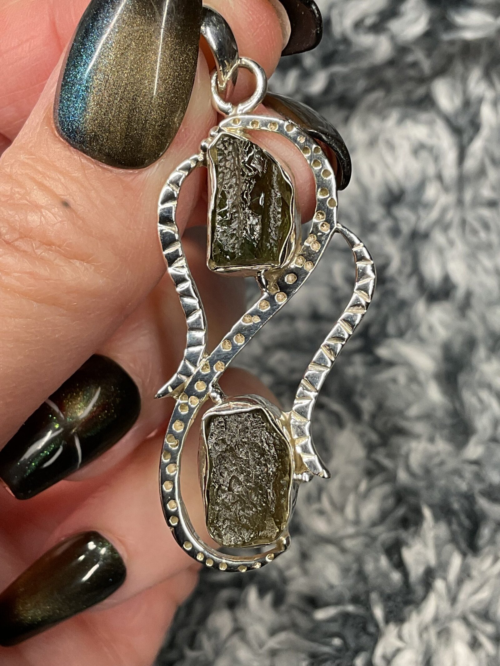 2 genuine Moldavite pieces set in a handmade sterling silver pendant.