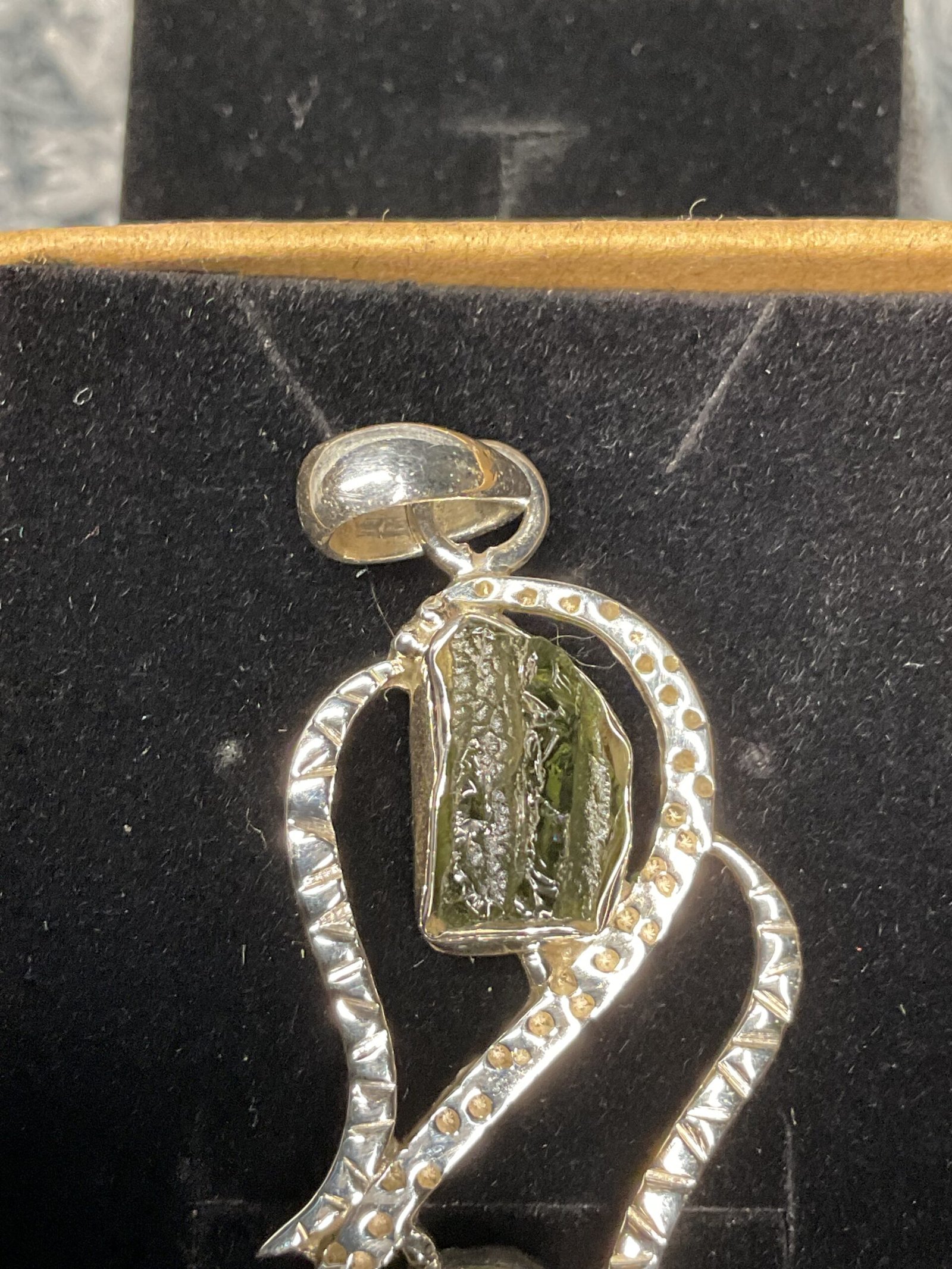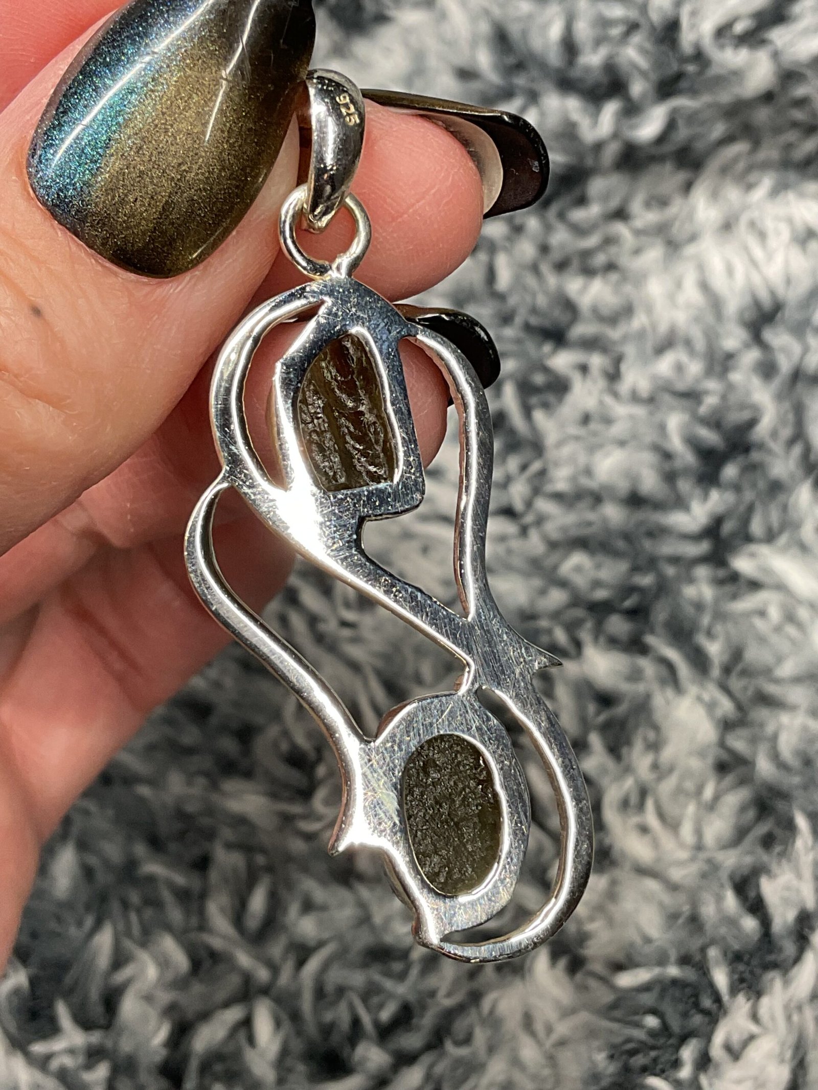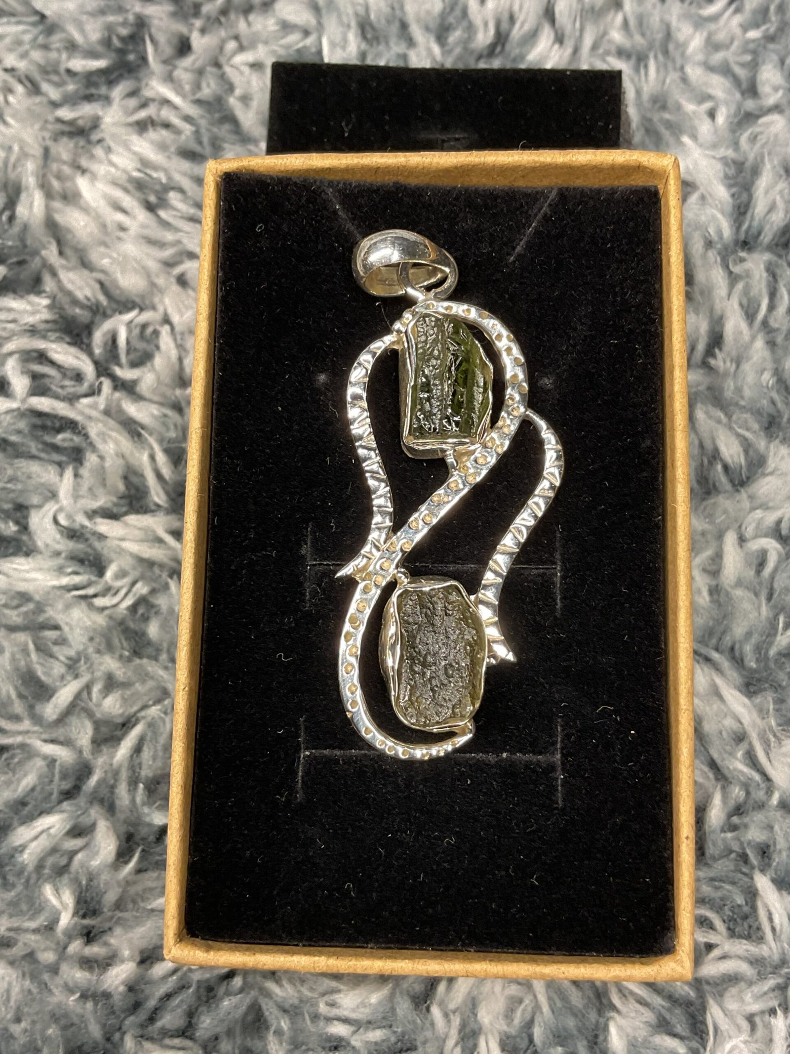 2 genuine Moldavite pieces set in a handmade sterling silver pendant.