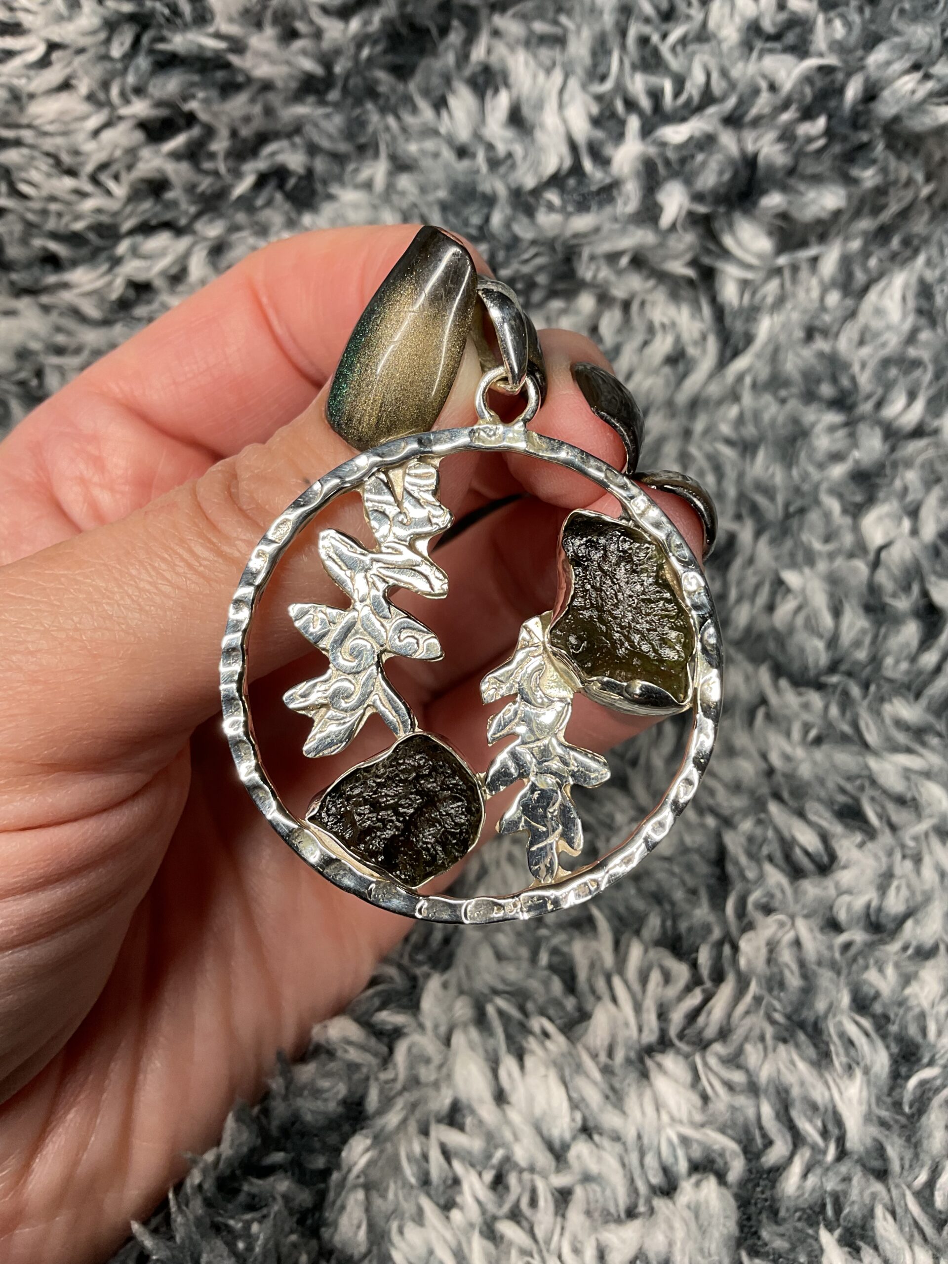 2 genuine Moldavite pieces set in a handmade sterling silver pendant.