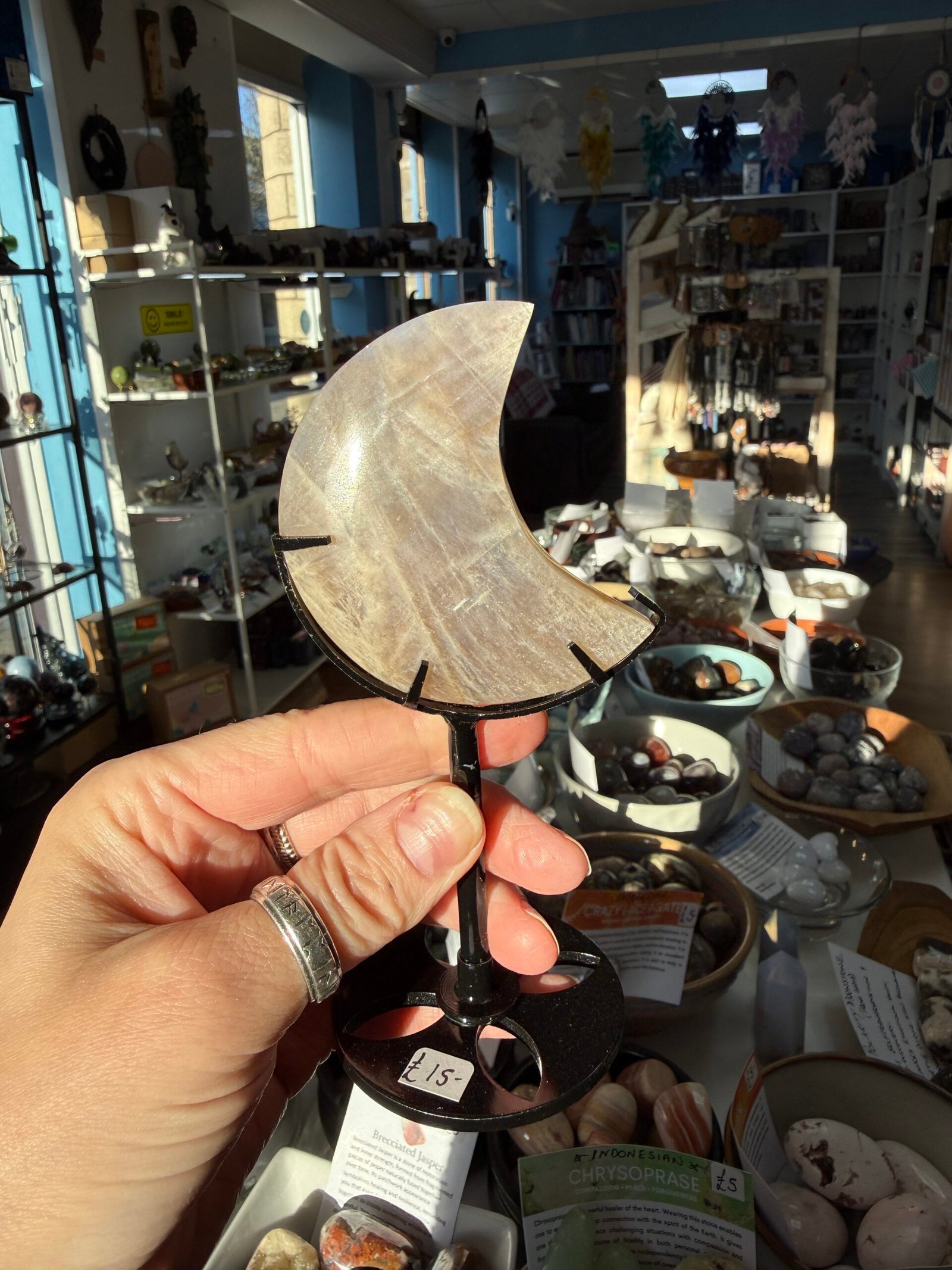 Moonstone is a stone of new beginnings and helps one connect to the energy of the Divine Feminine. It carries a gentle, nurturing vibration and is recommended to be used during pregnancy. It enhances patience for others and improves emotional regulation. It promotes sensitivity and empathy, and is a powerful stone for developing psychic and intuitive awareness. It is also believed to be beneficial in treating PMS symptoms.