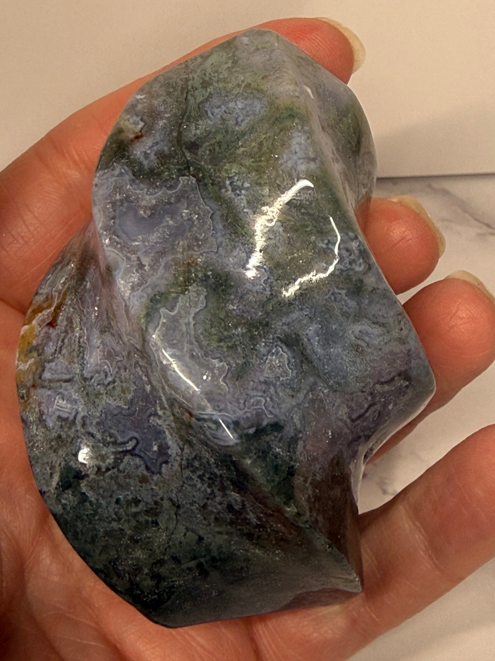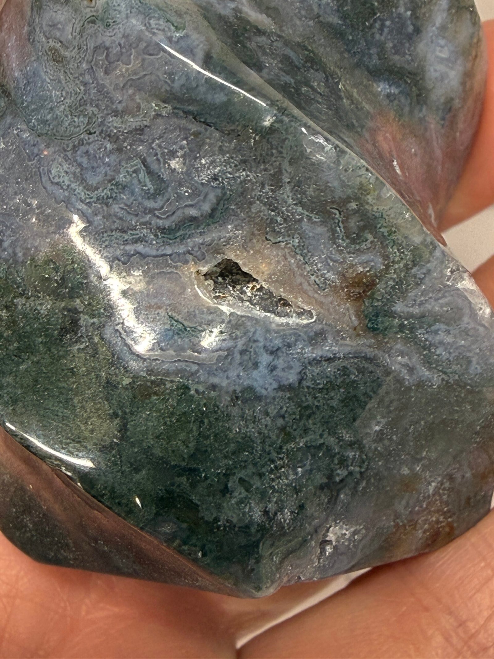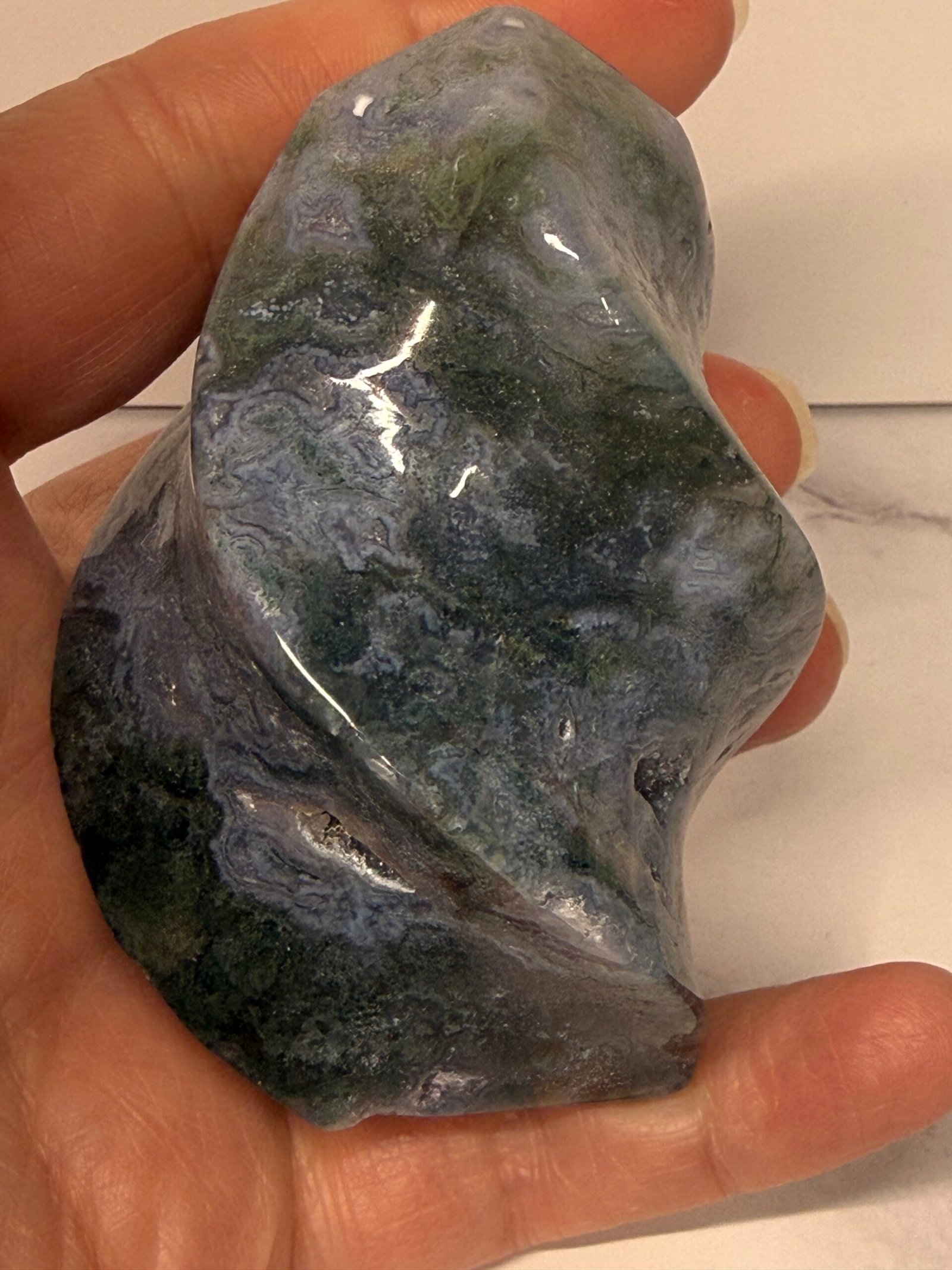 Moss Agate helps correct imbalances between the left and right side of the brain. It boosts mental function and is beneficial for those who lack creativity. It is a powerful aid for those who experience frequent mood swings due to its stabilising properties. It speeds up recovery from illness by strengthening the immune system. It helps one feel secure, safe, and grounded due to its strong connection with Mother Earth.