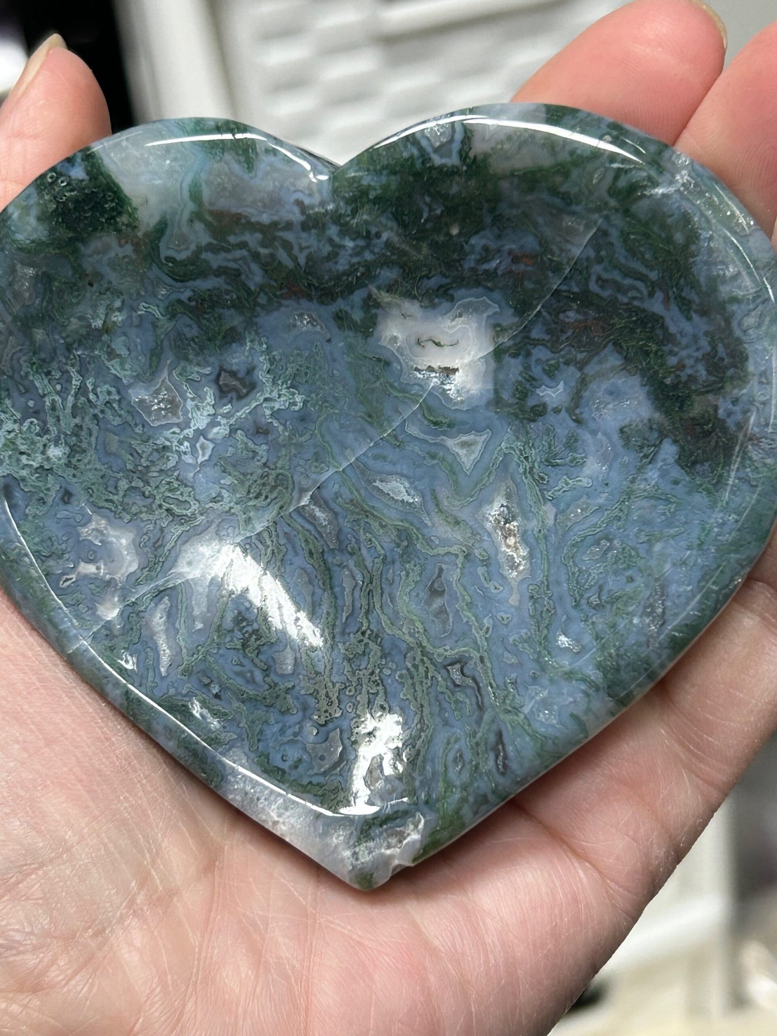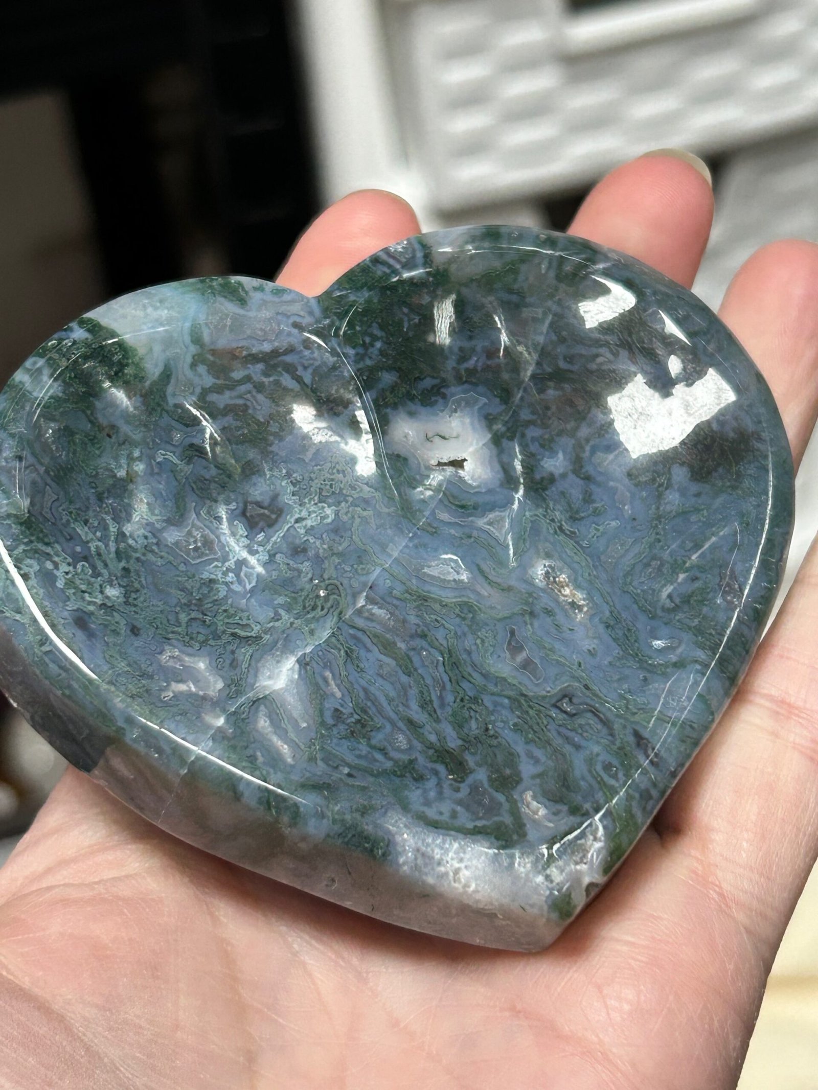 A beautiful moss agate heart bowl, ideal for jewellery or your favourite tumble stones.