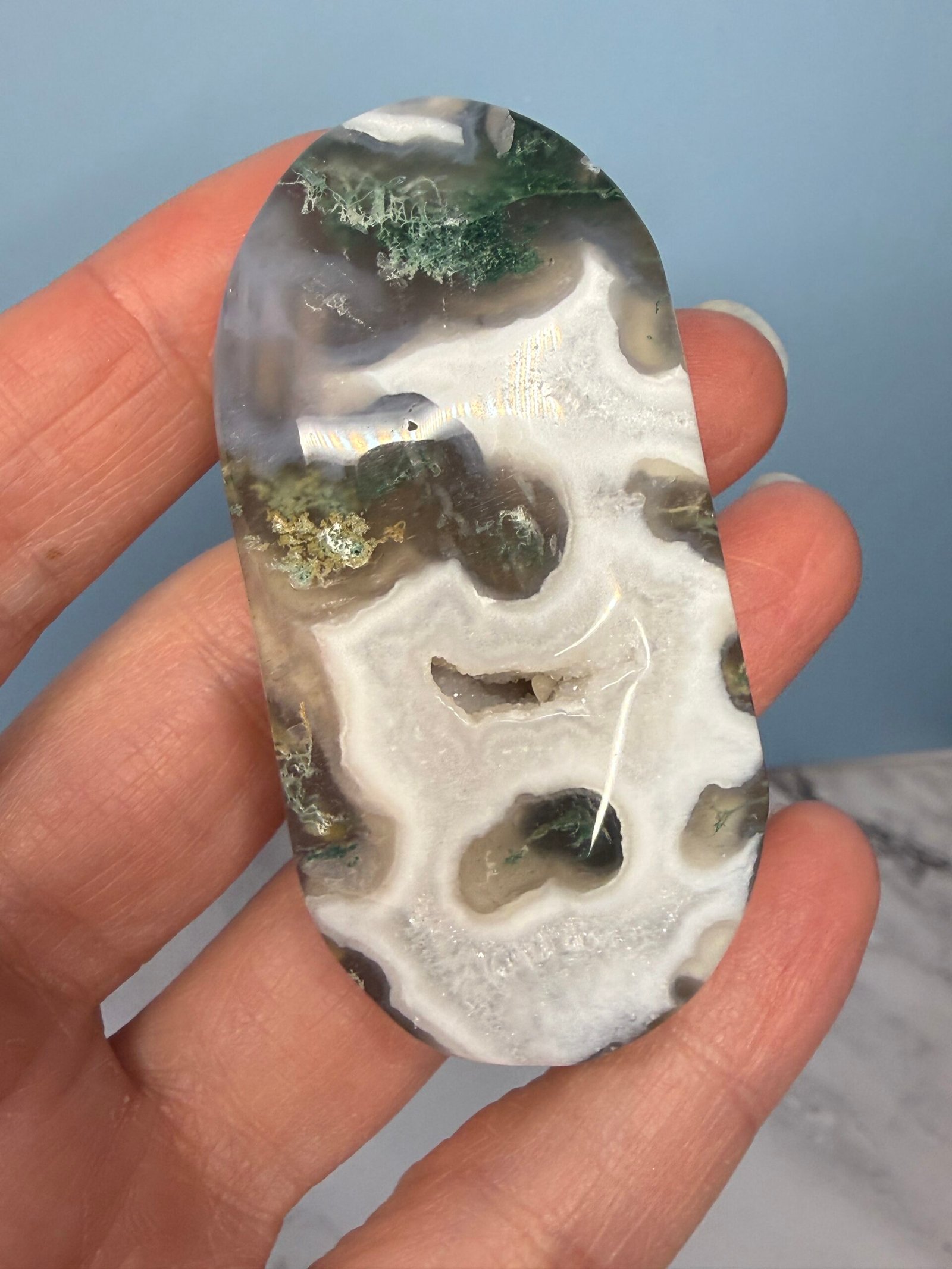 Moss Agate helps correct imbalances between the left and right side of the brain. It boosts mental function and is beneficial for those who lack creativity. It is a powerful aid for those who experience frequent mood swings due to its stabilising properties. It speeds up recovery from illness by strengthening the immune system. It helps one feel secure, safe, and grounded due to its strong connection with Mother Earth.