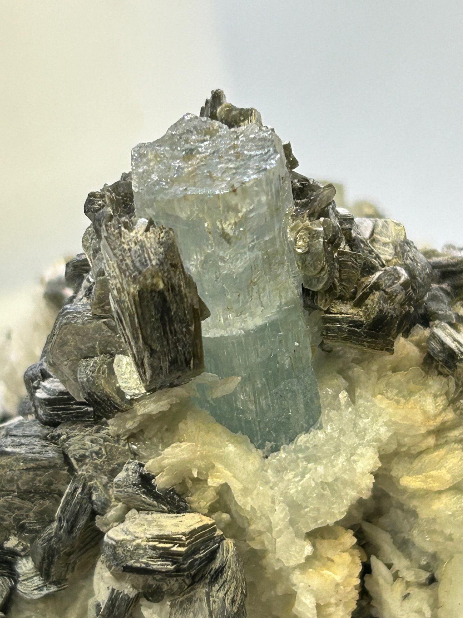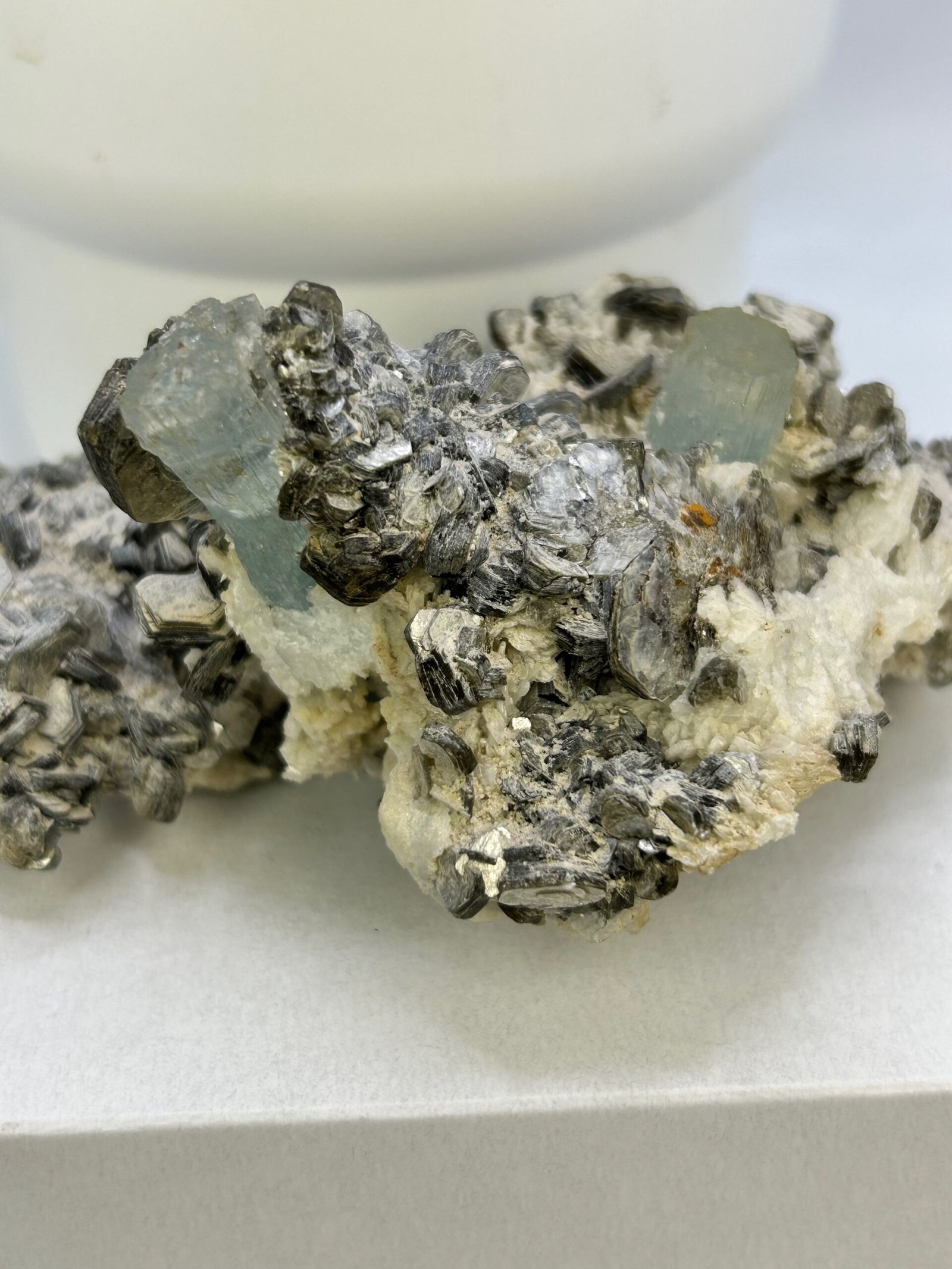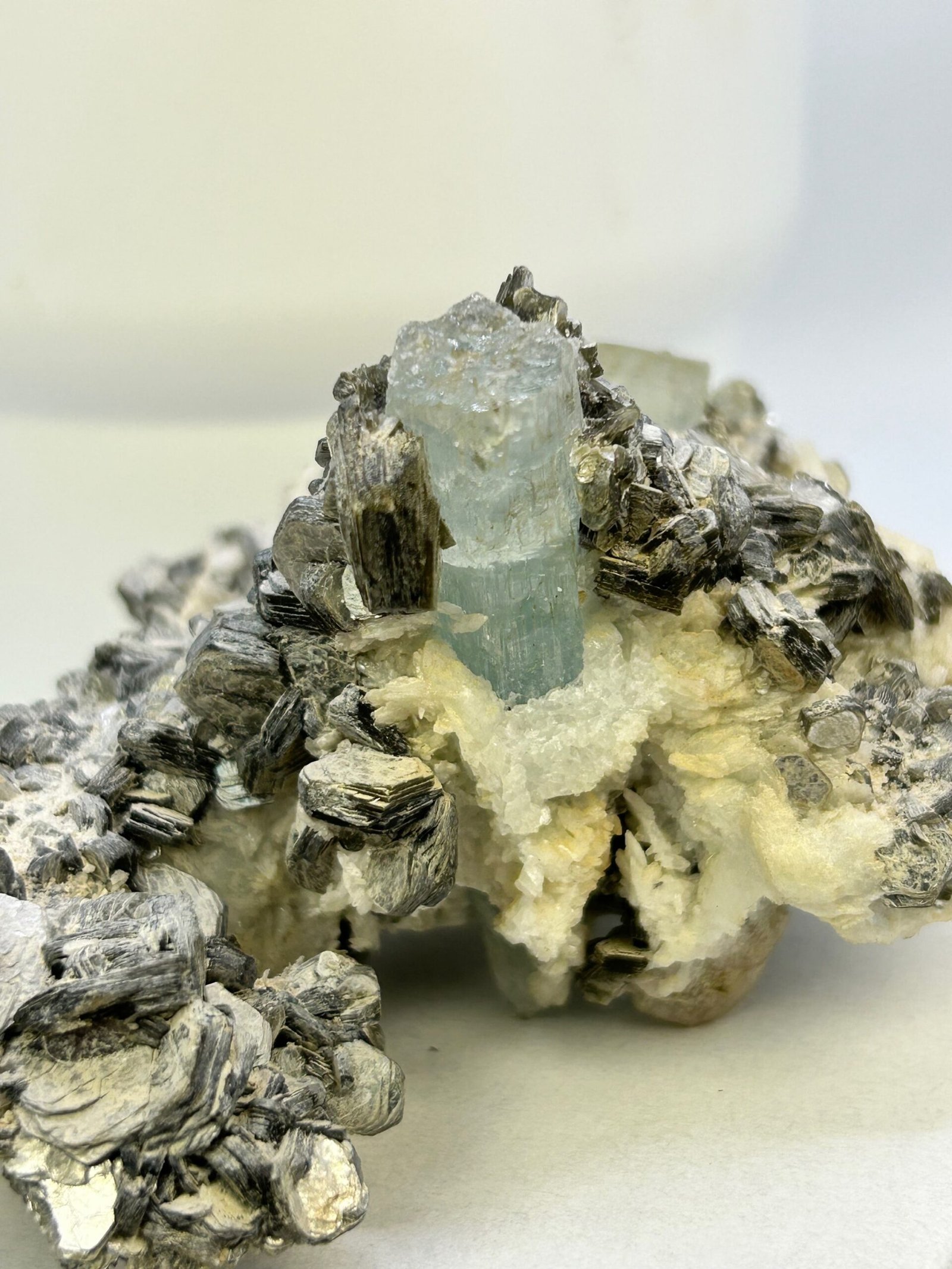 A beautiful specimen with 2 terminated natural aquamarine pieces, nestled in silvery crystalline muscovite.