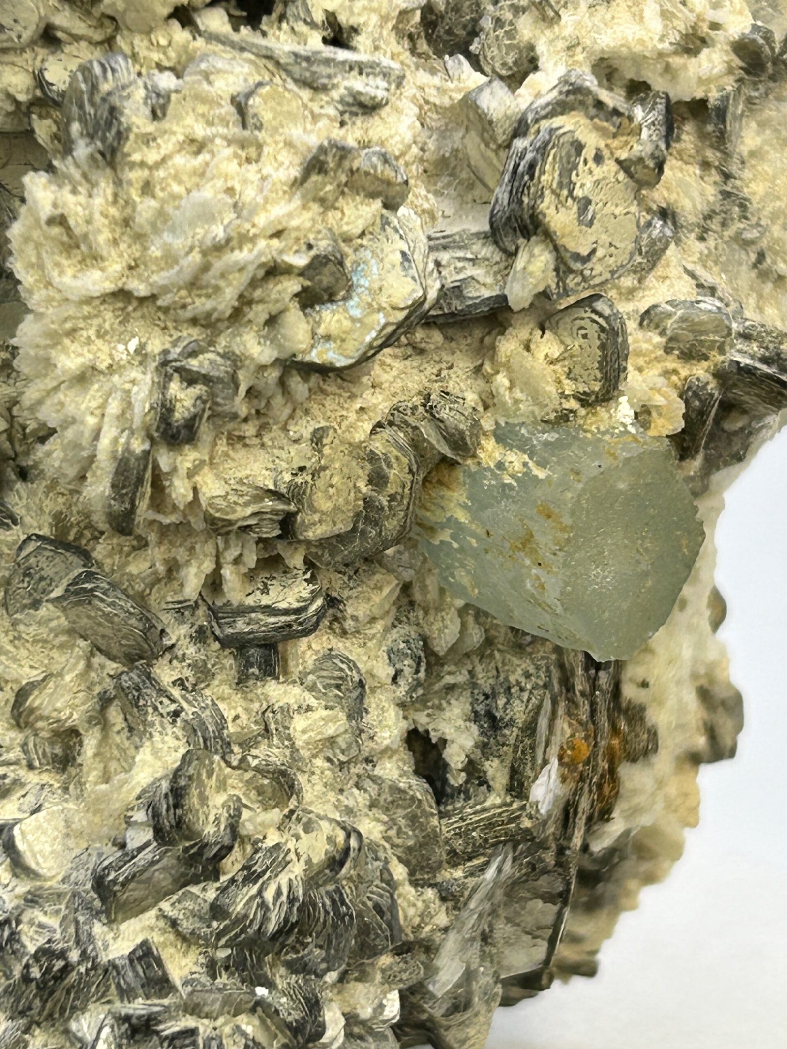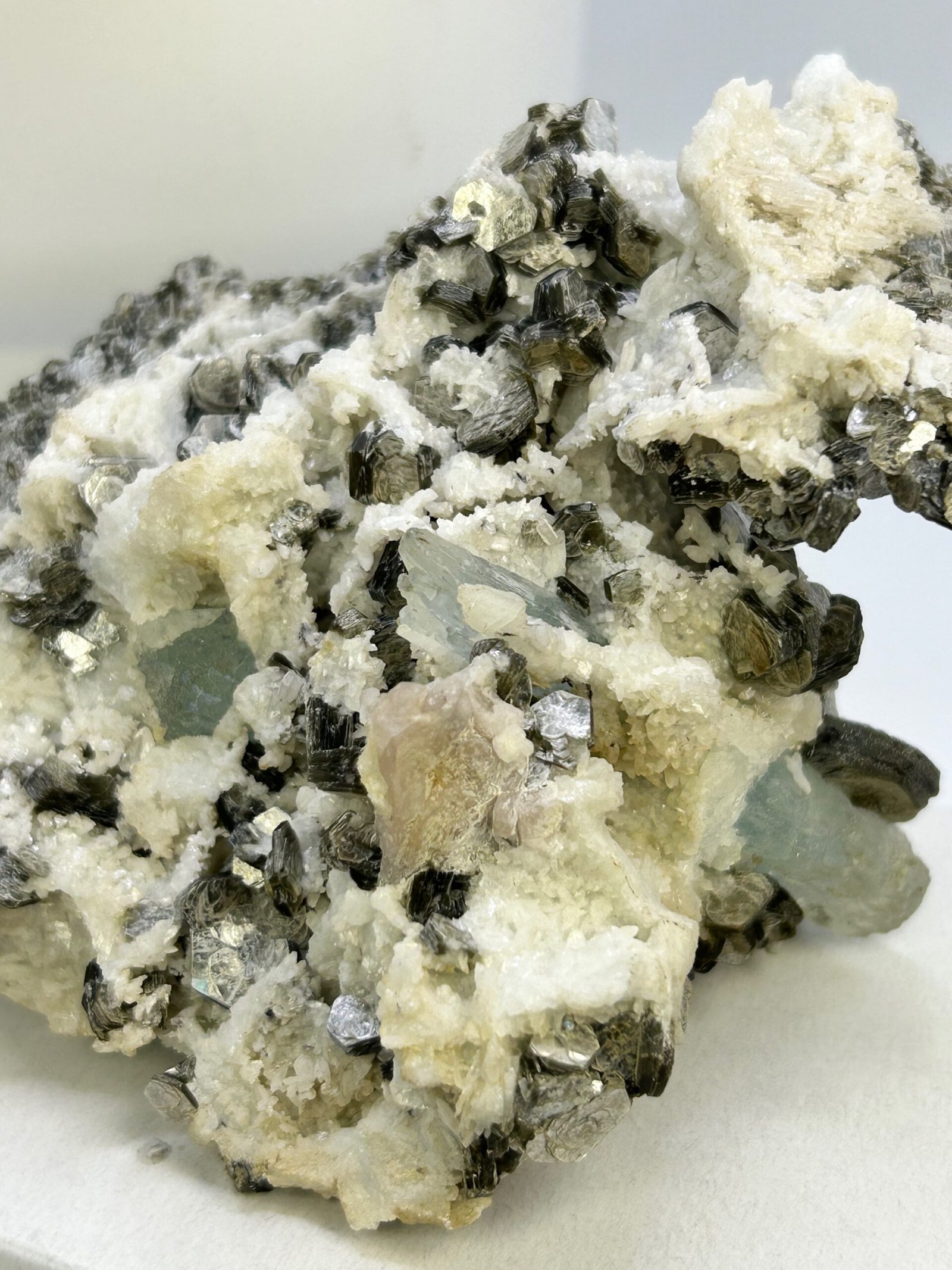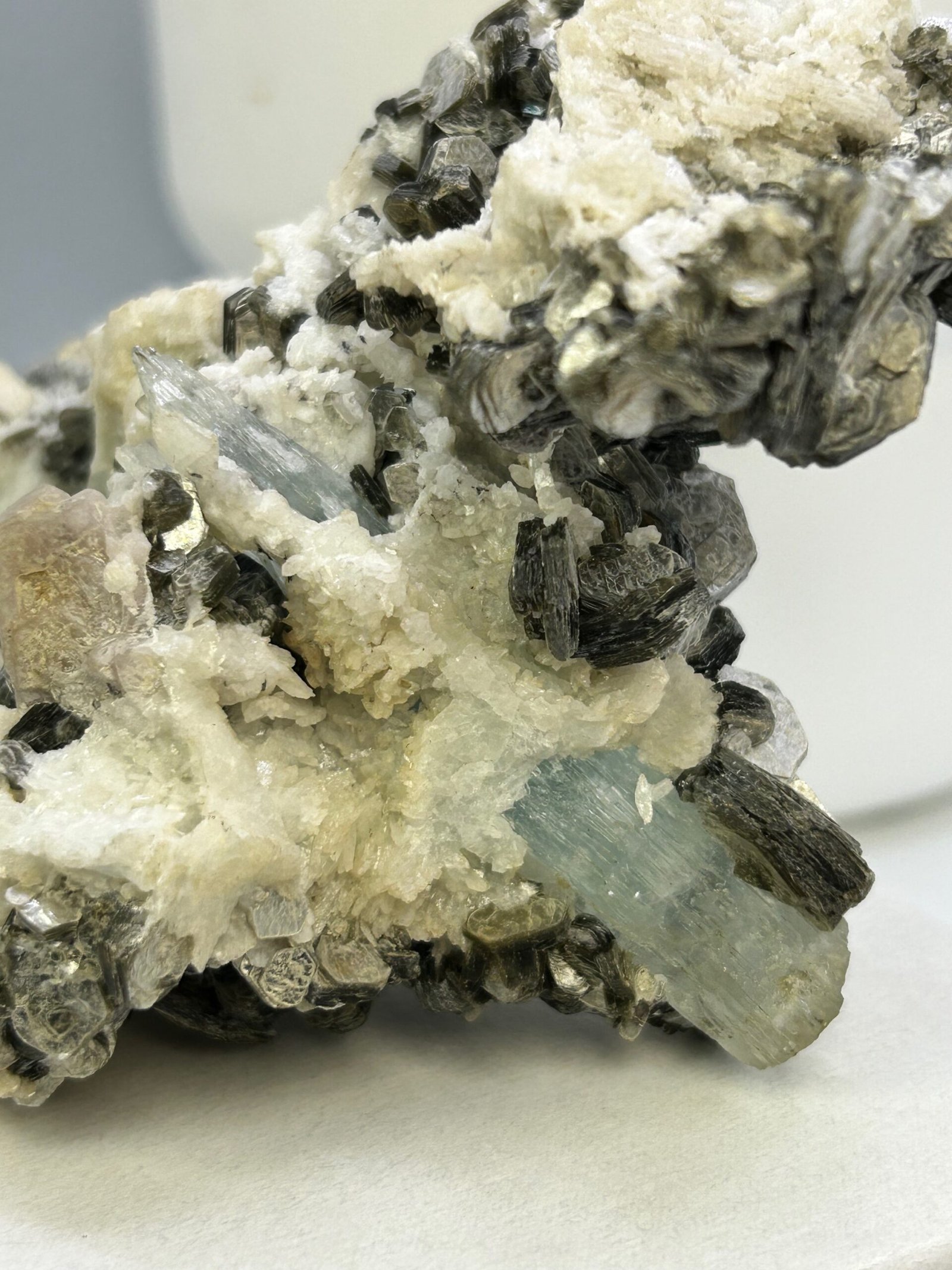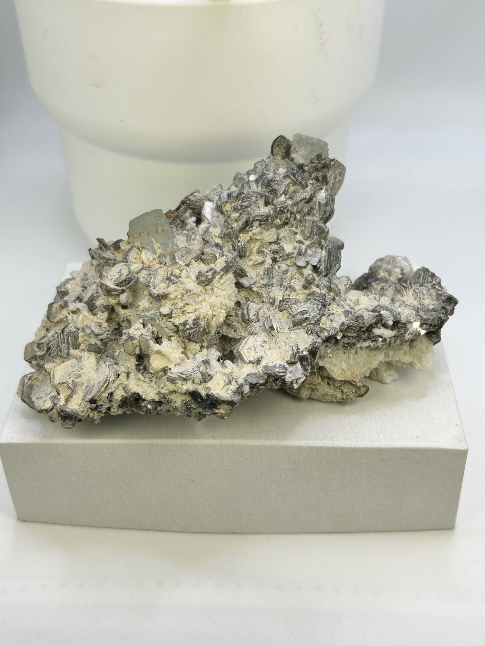 A beautiful specimen with 2 terminated natural aquamarine pieces, nestled in silvery crystalline muscovite.