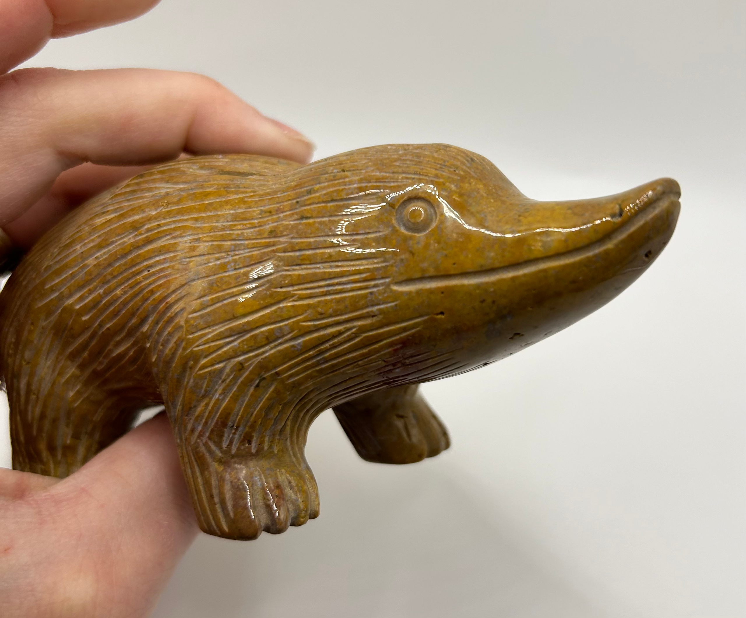 A very cute duck billed platypus carved from a wonderfully rich mustard coloured ocean jasper, with flashes of deep pink.