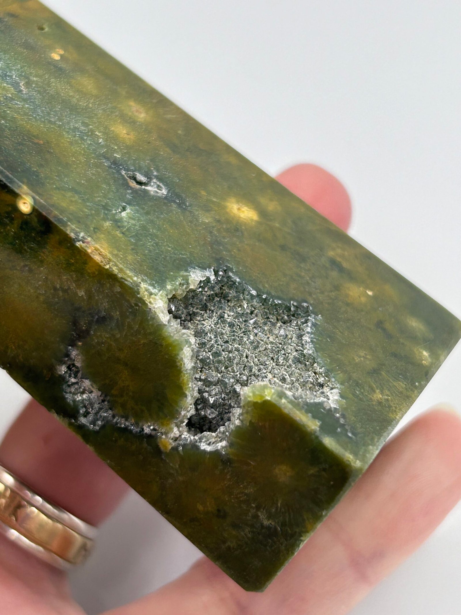 Ocean Jasper is a unique stone that carries the healing energy of the ocean. It releases suppressed emotions, bringing them to the surface to allow for transformation and healing. It opens and heals the heart chakra, and reminds one to be accepting of the cycles of life. It helps one look to the future with hope, making it beneficial for anyone suffering with