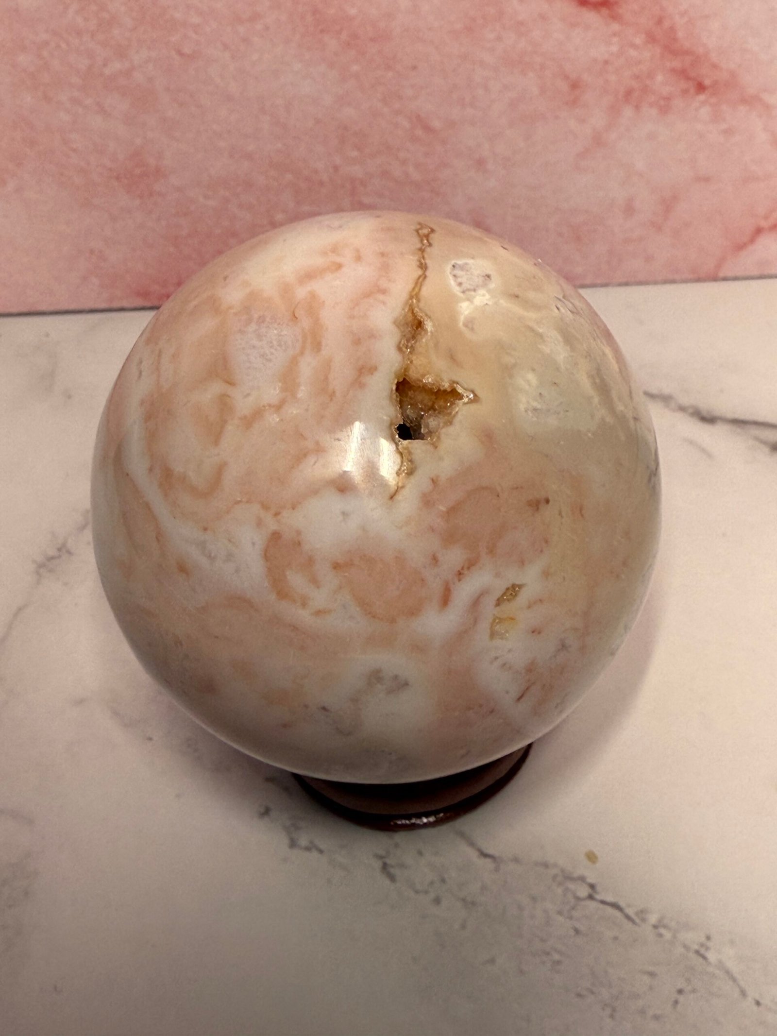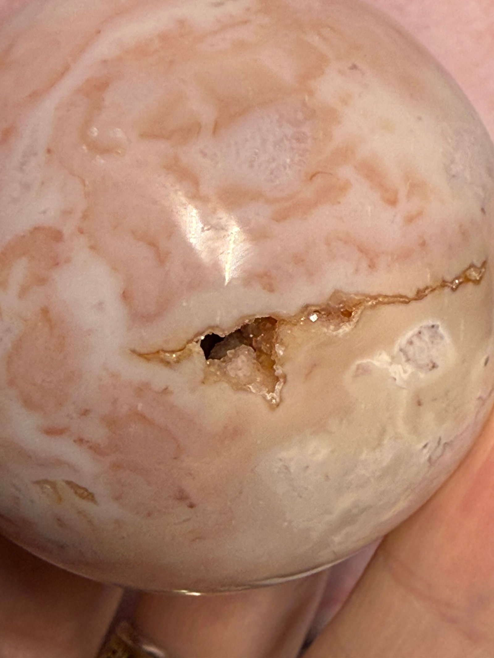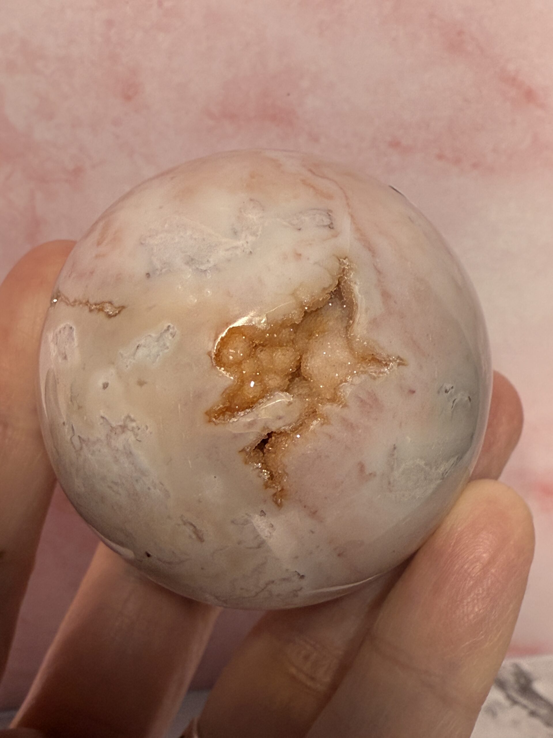 This unique pink agate from Indonesia, named pink Carnelian, has lovely soft pink tones, whites and orange druse.