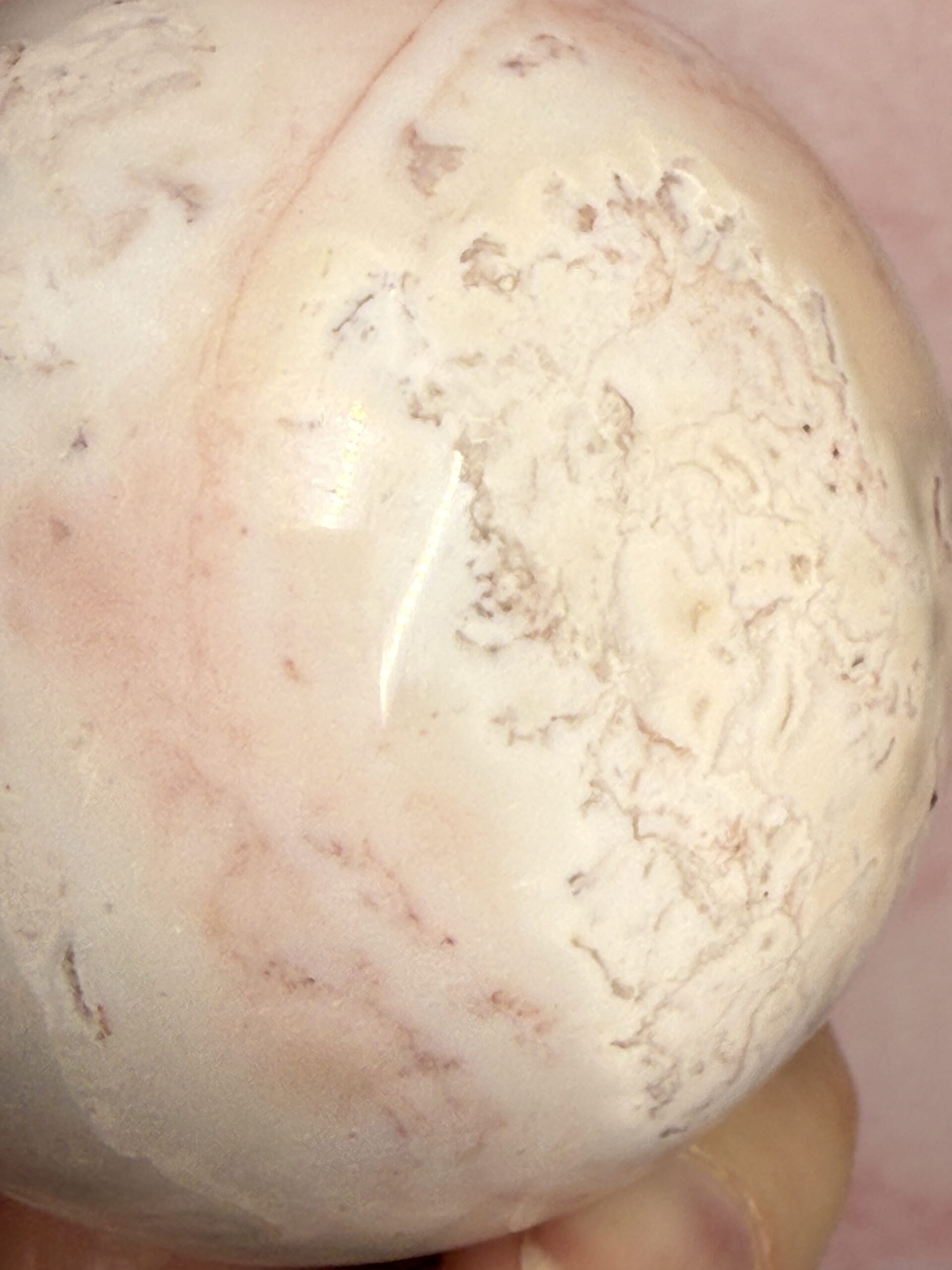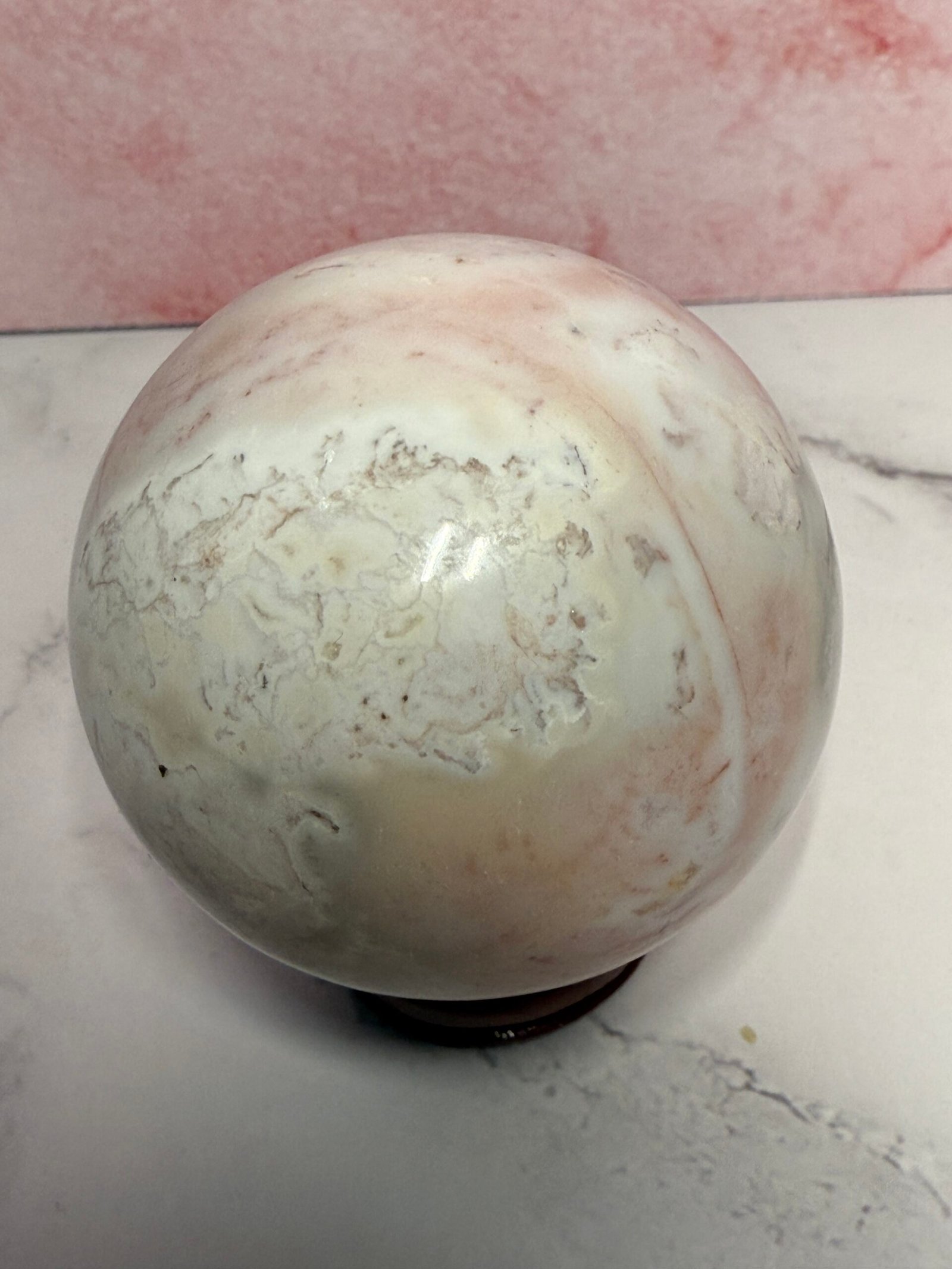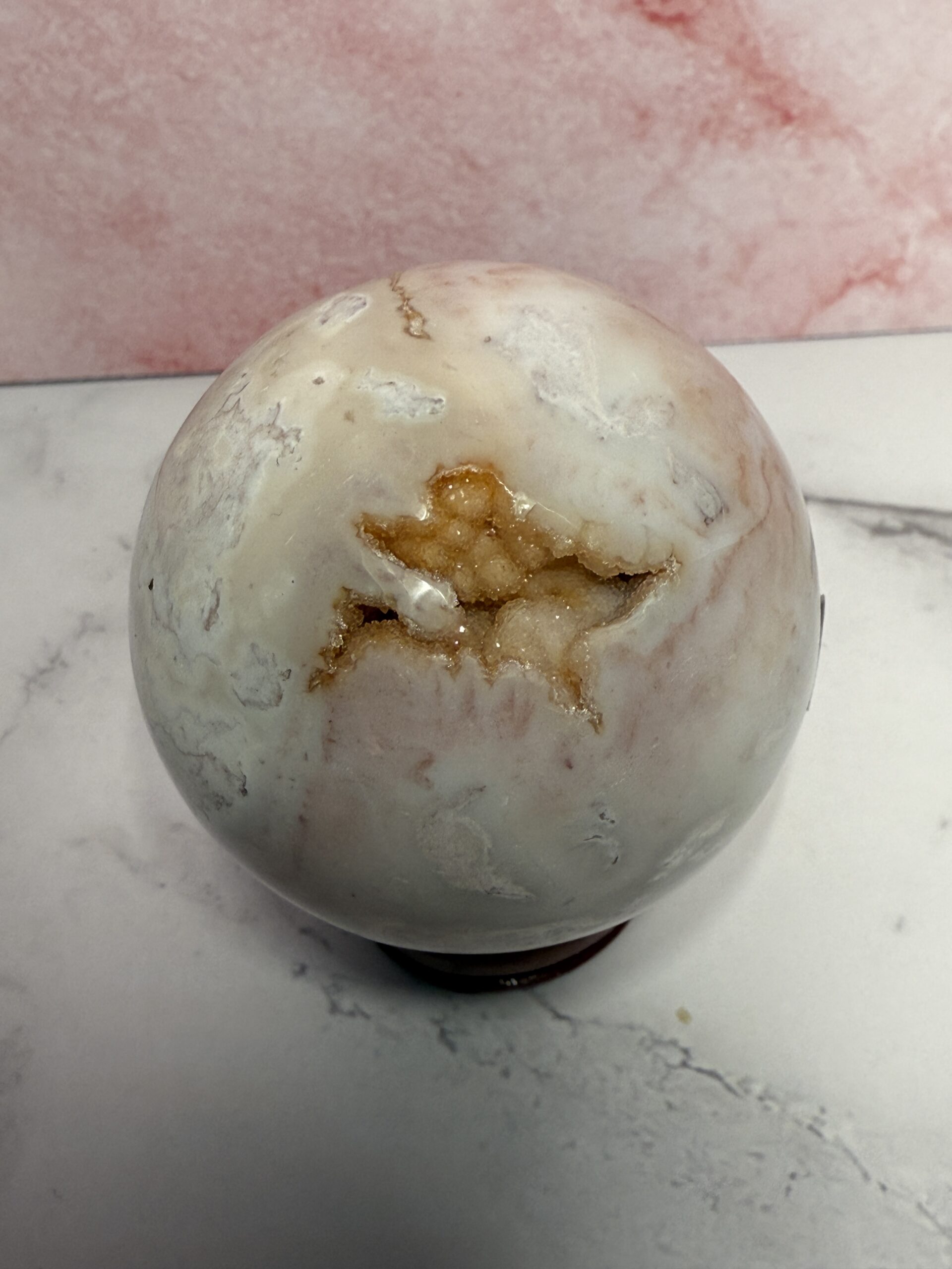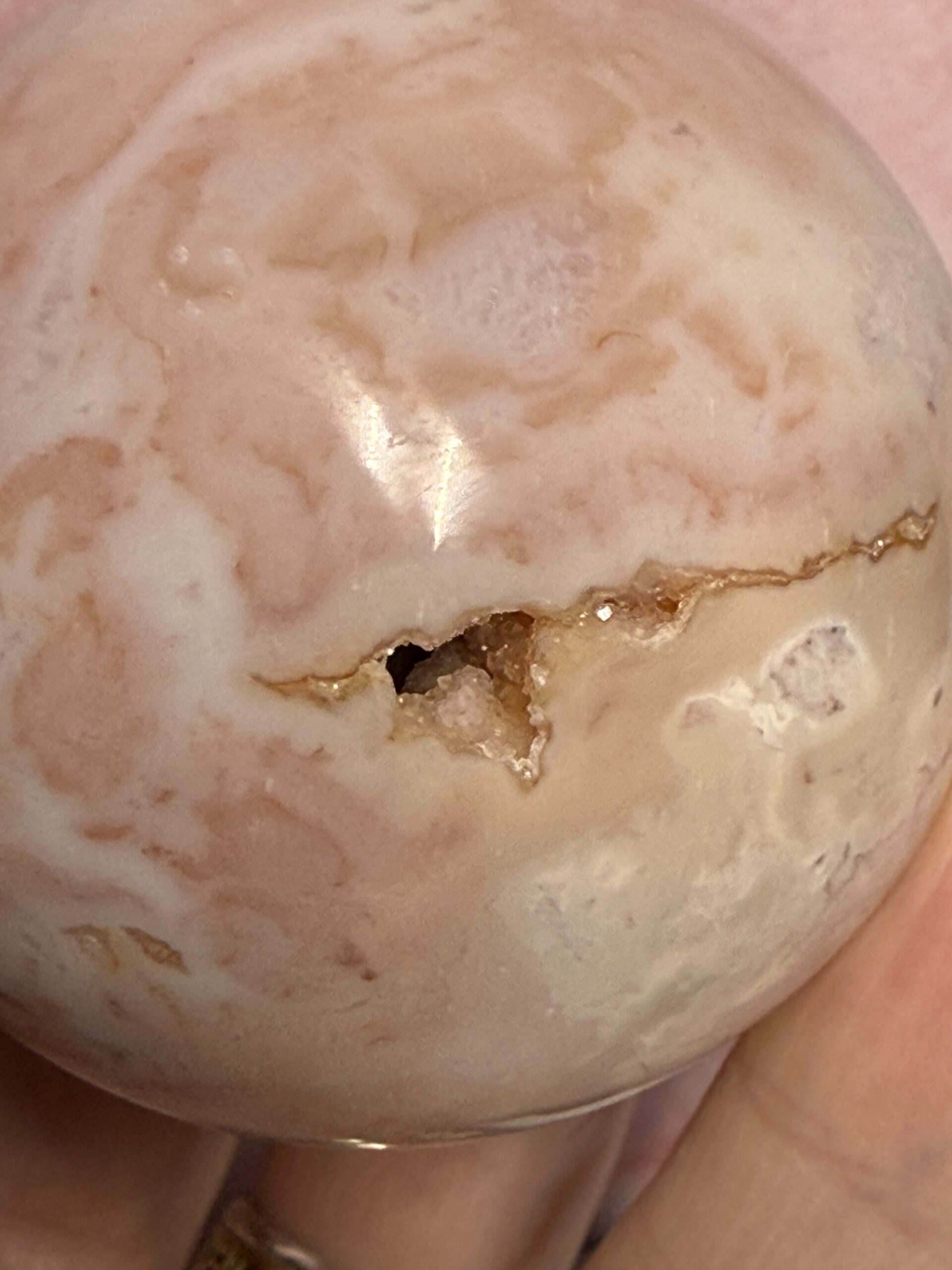 This unique pink agate from Indonesia, named pink Carnelian, has lovely soft pink tones, whites and orange druse.