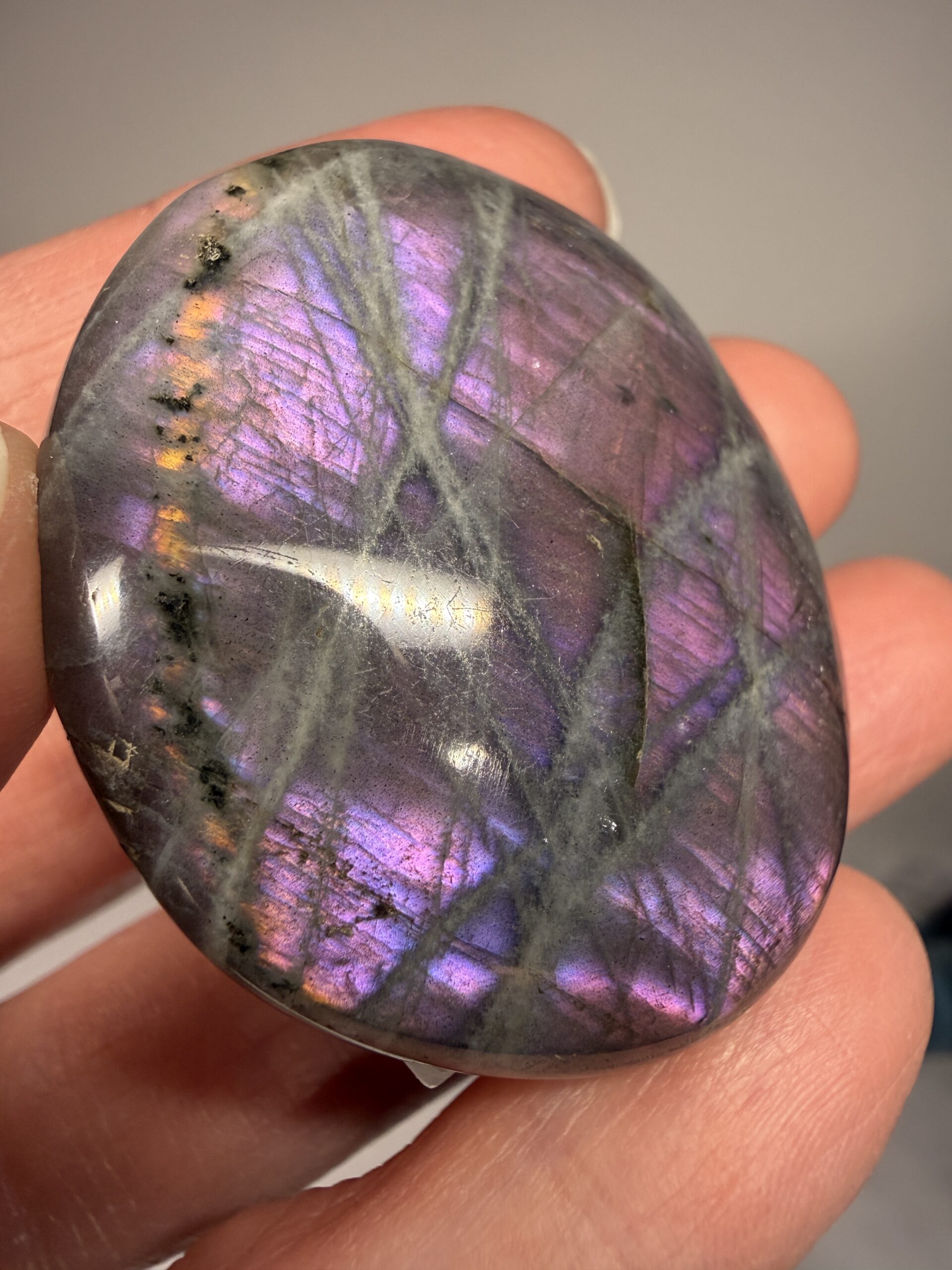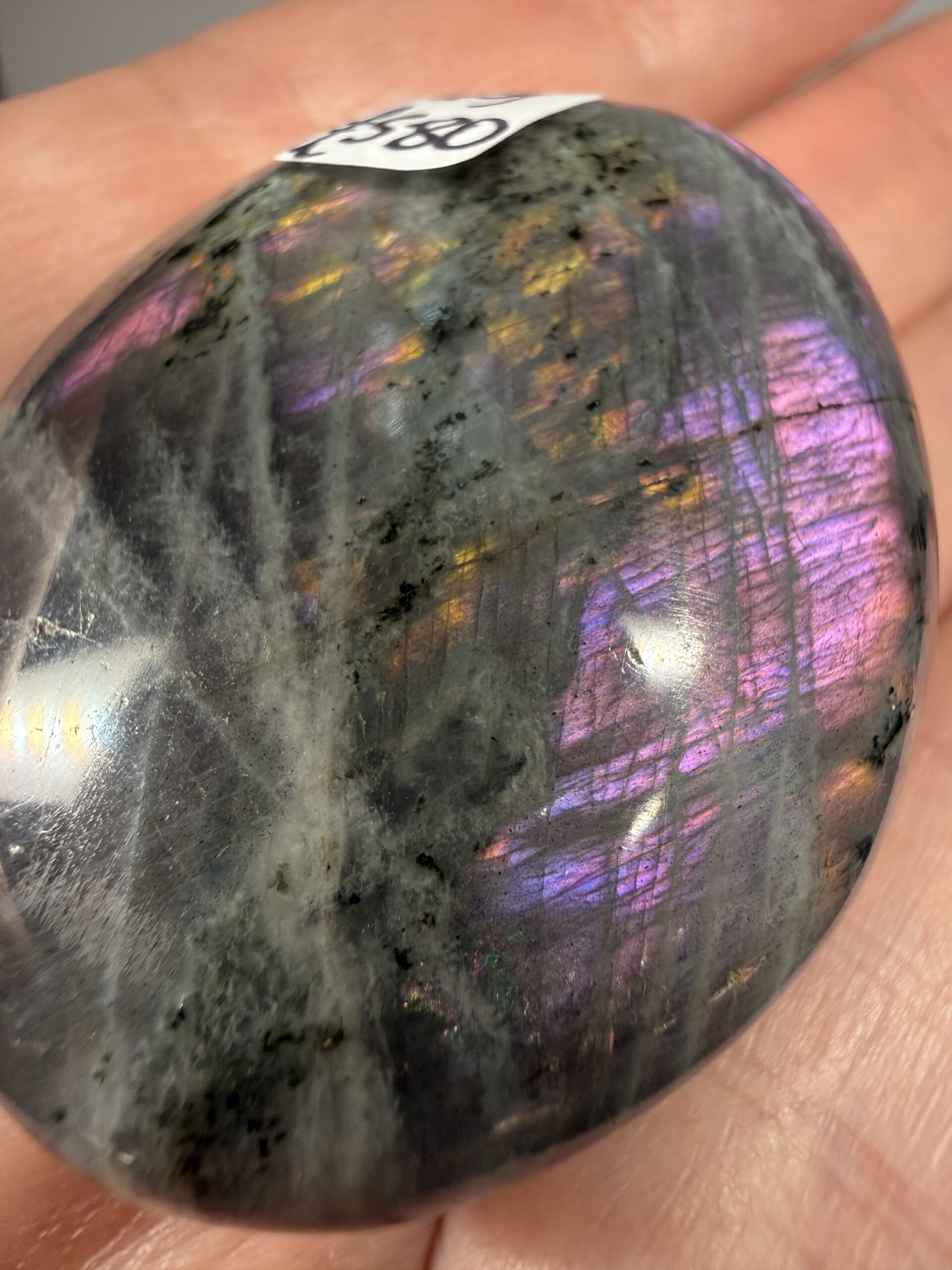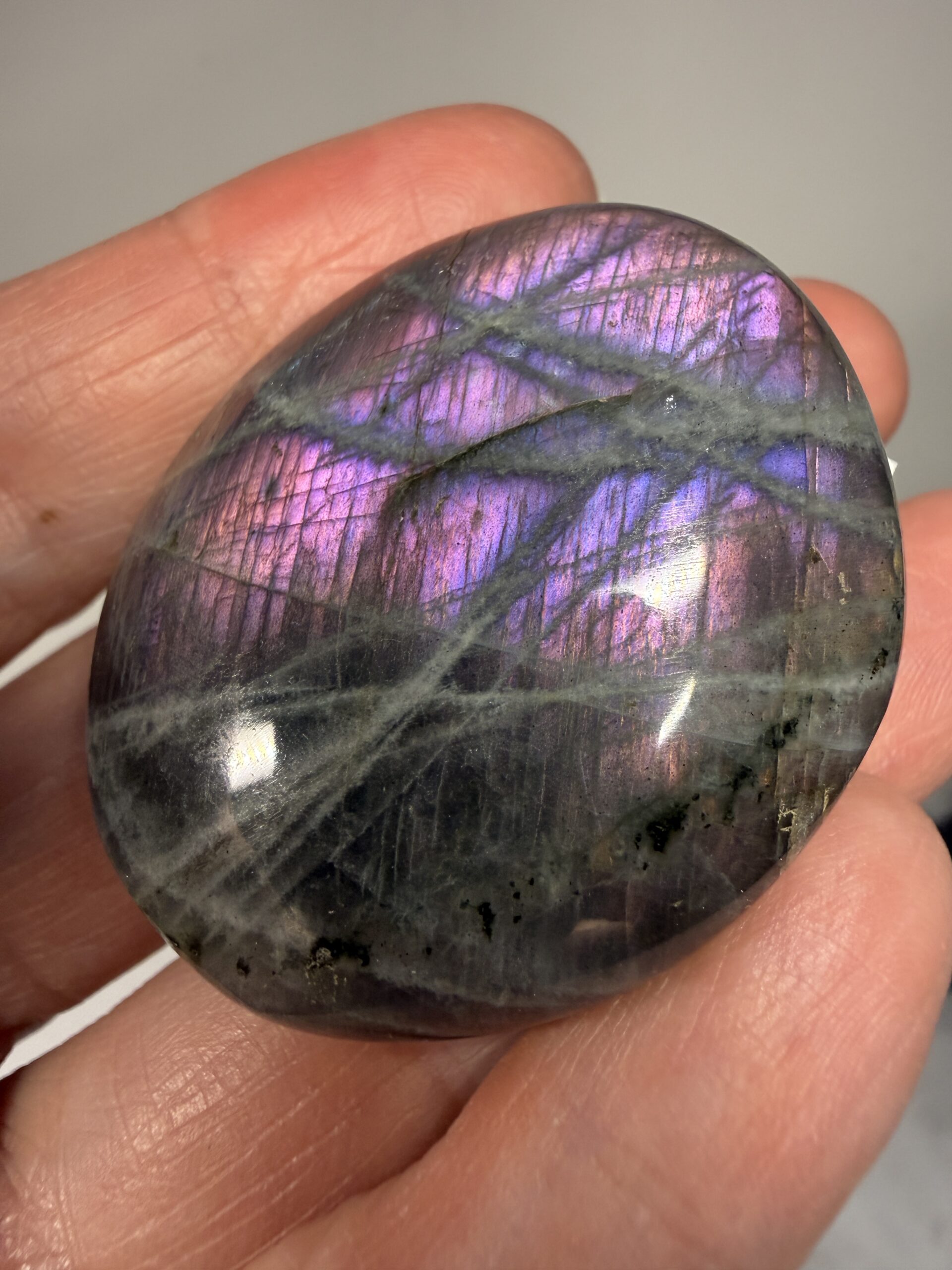 Beautiful labradorite palm stone with purple/pink hues.