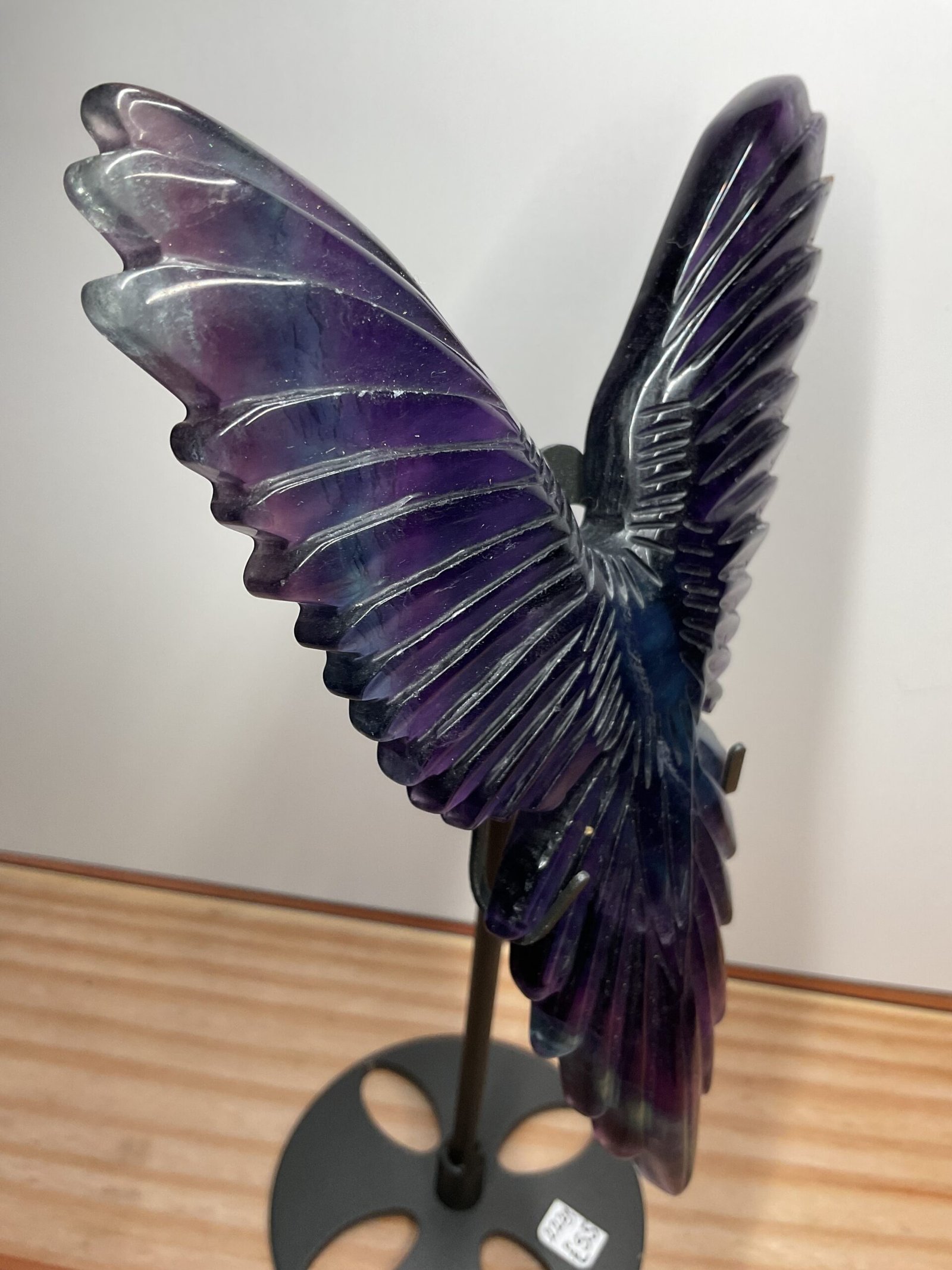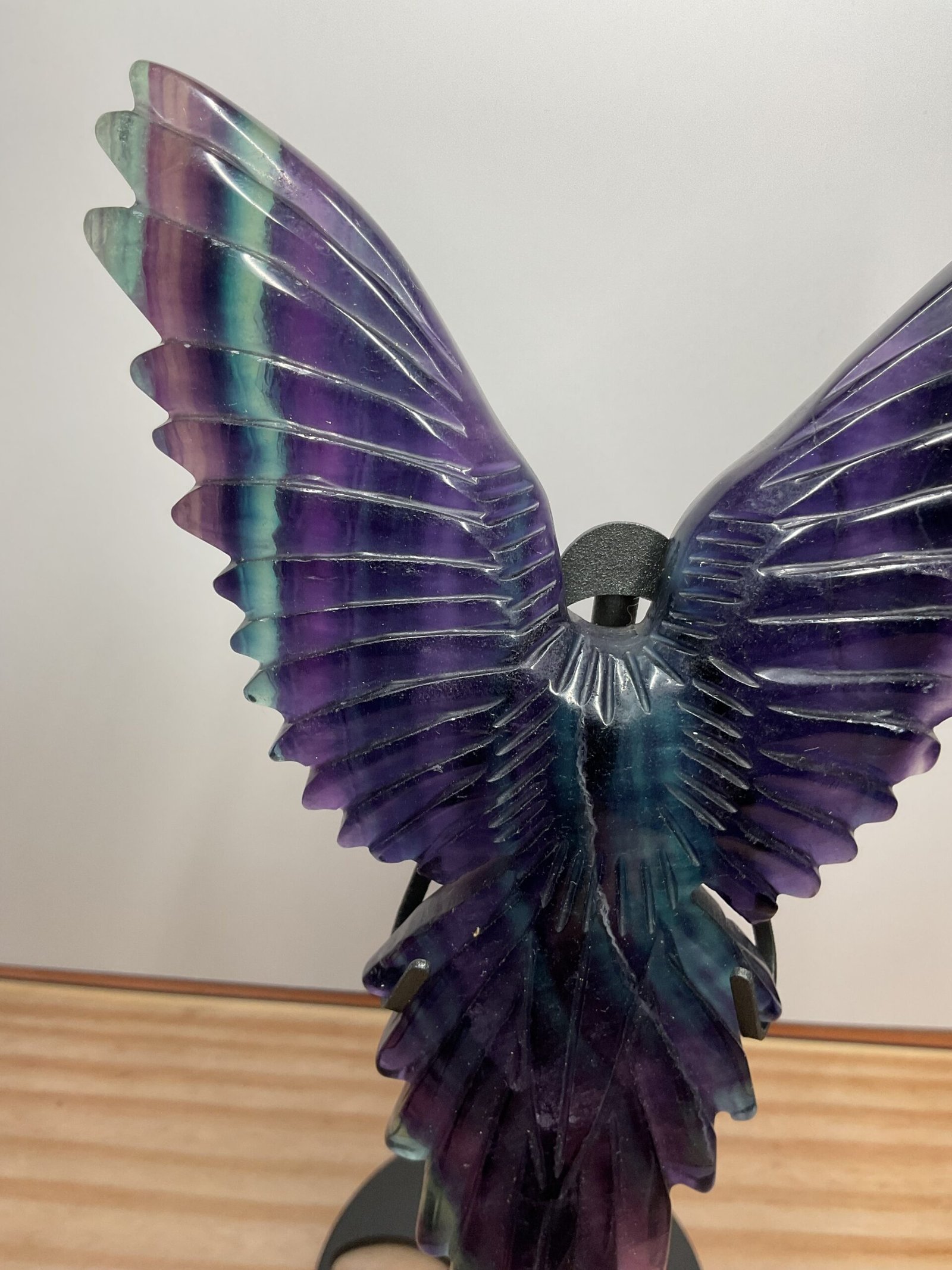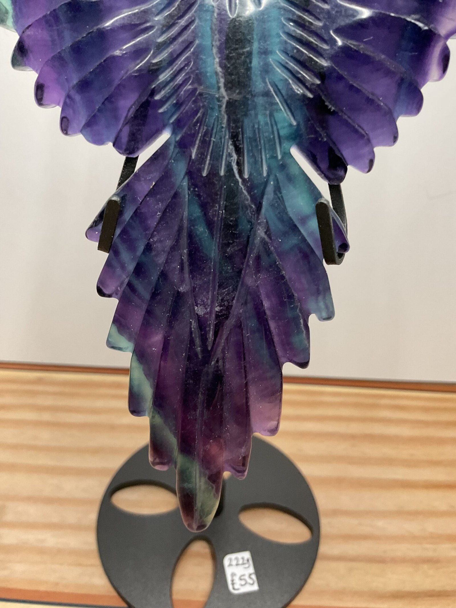 A beautifully carved rainbow fluorite bird, possibly Raven, on a black stand.