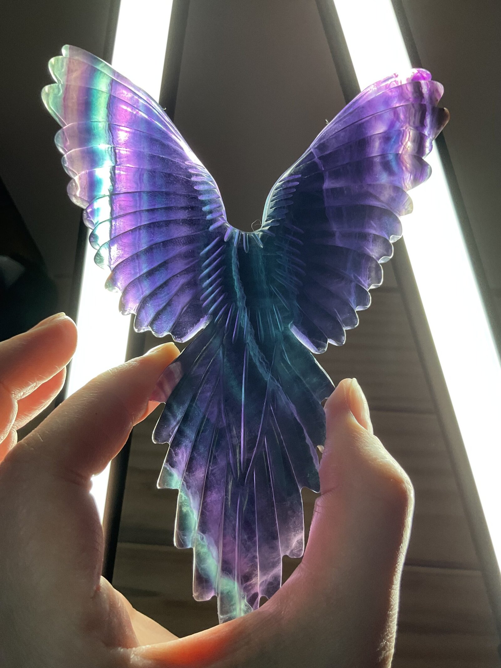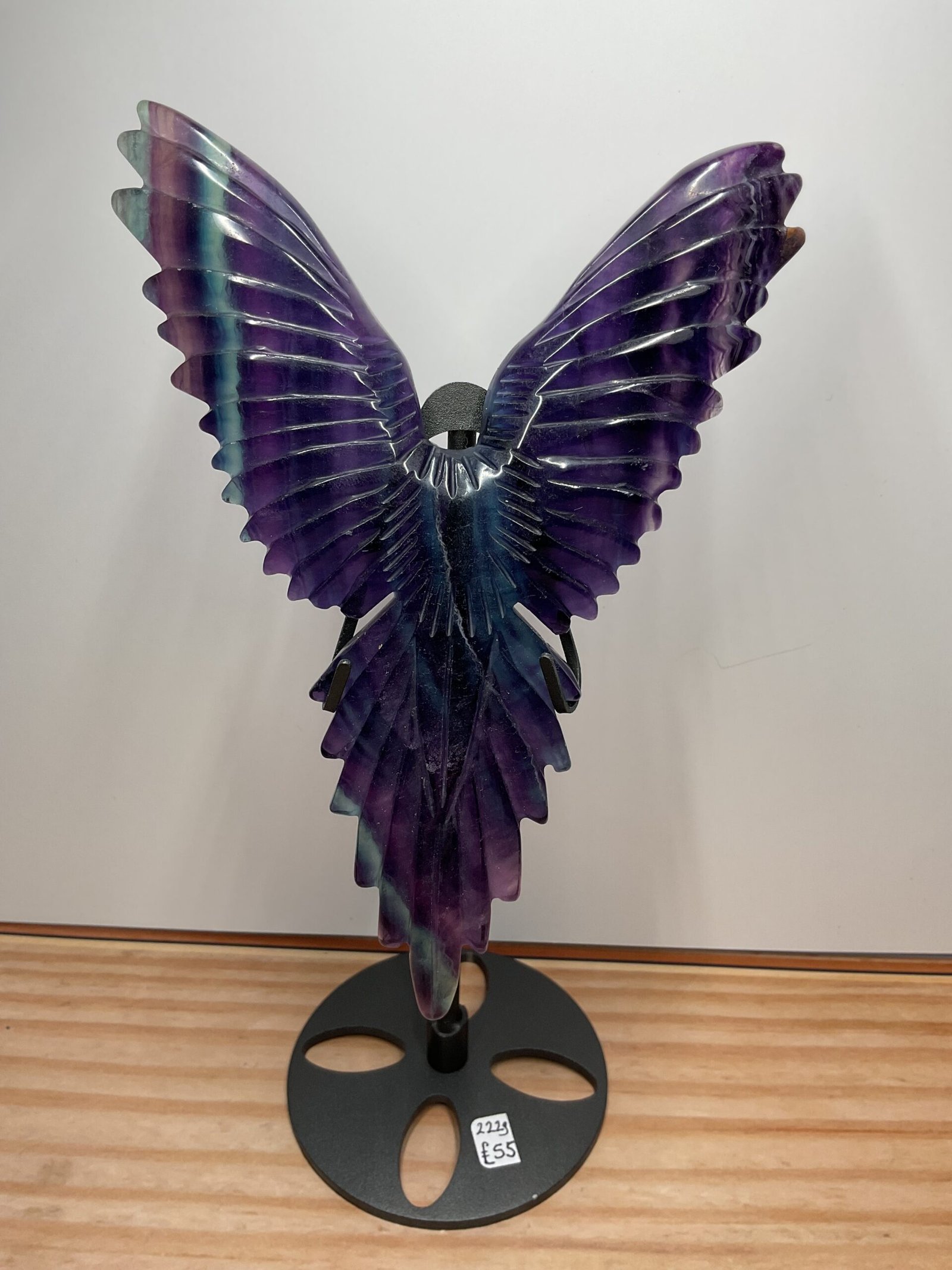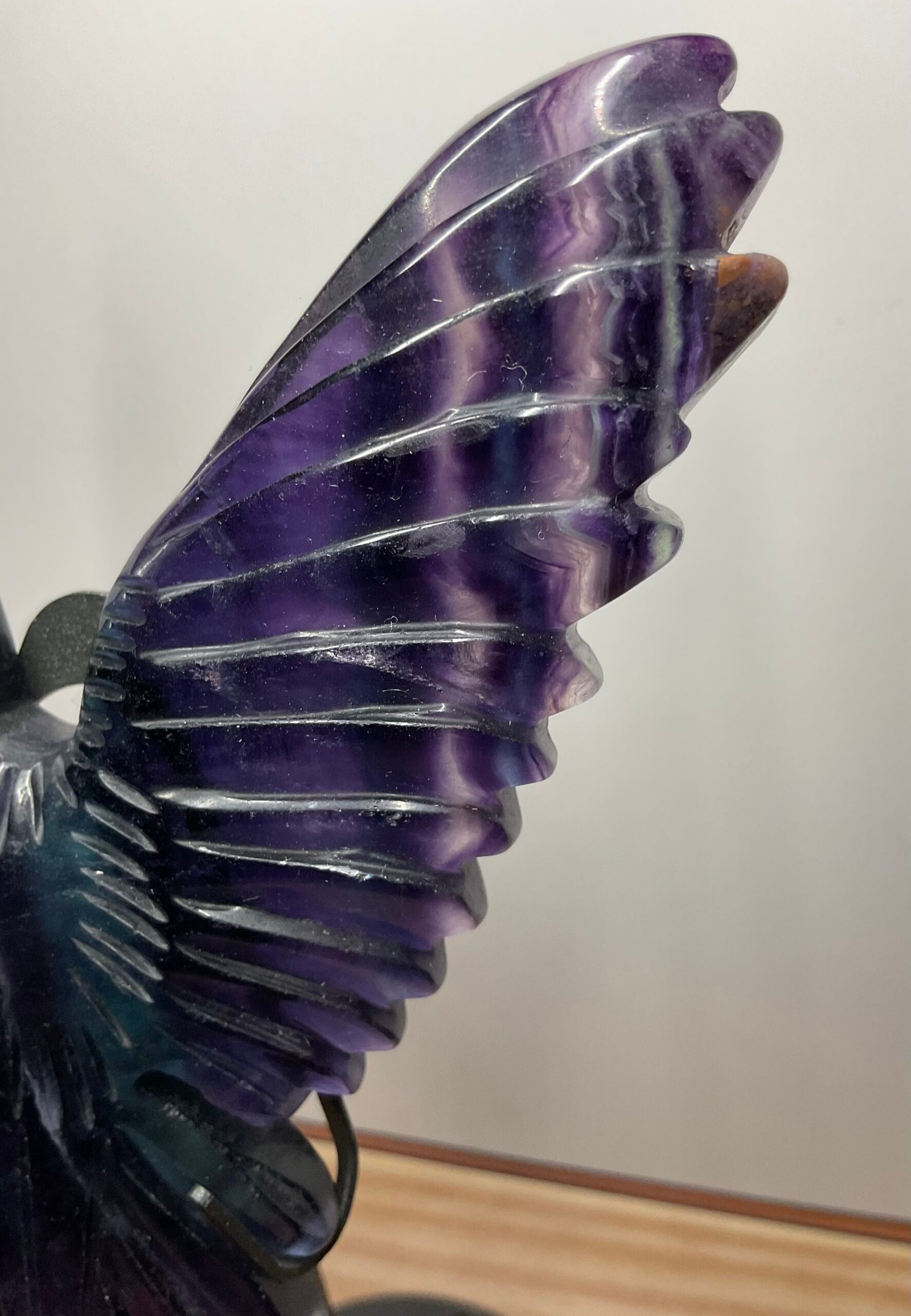 A beautifully carved rainbow fluorite bird, possibly Raven, on a black stand.