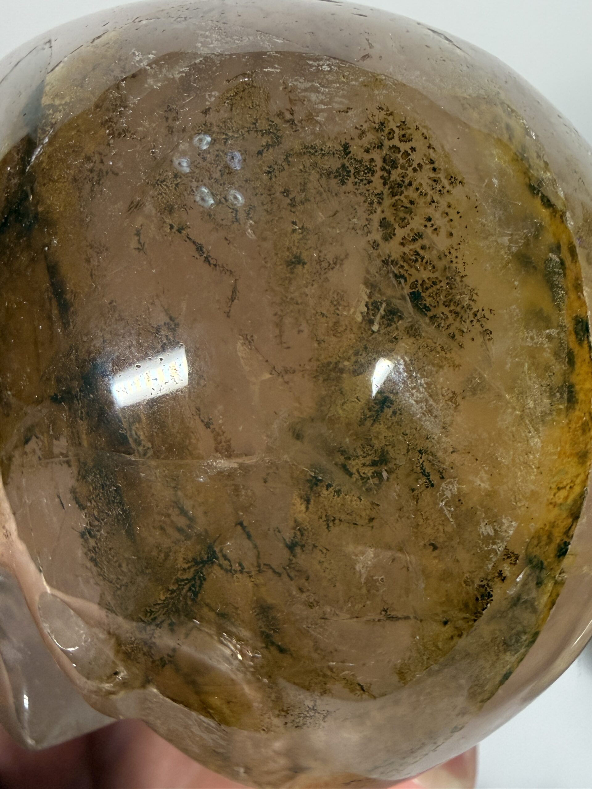 High quality, rare rose quartz with dendritic golden healer skull carving. Beautifully carved with wonderful dendritic inclusions.