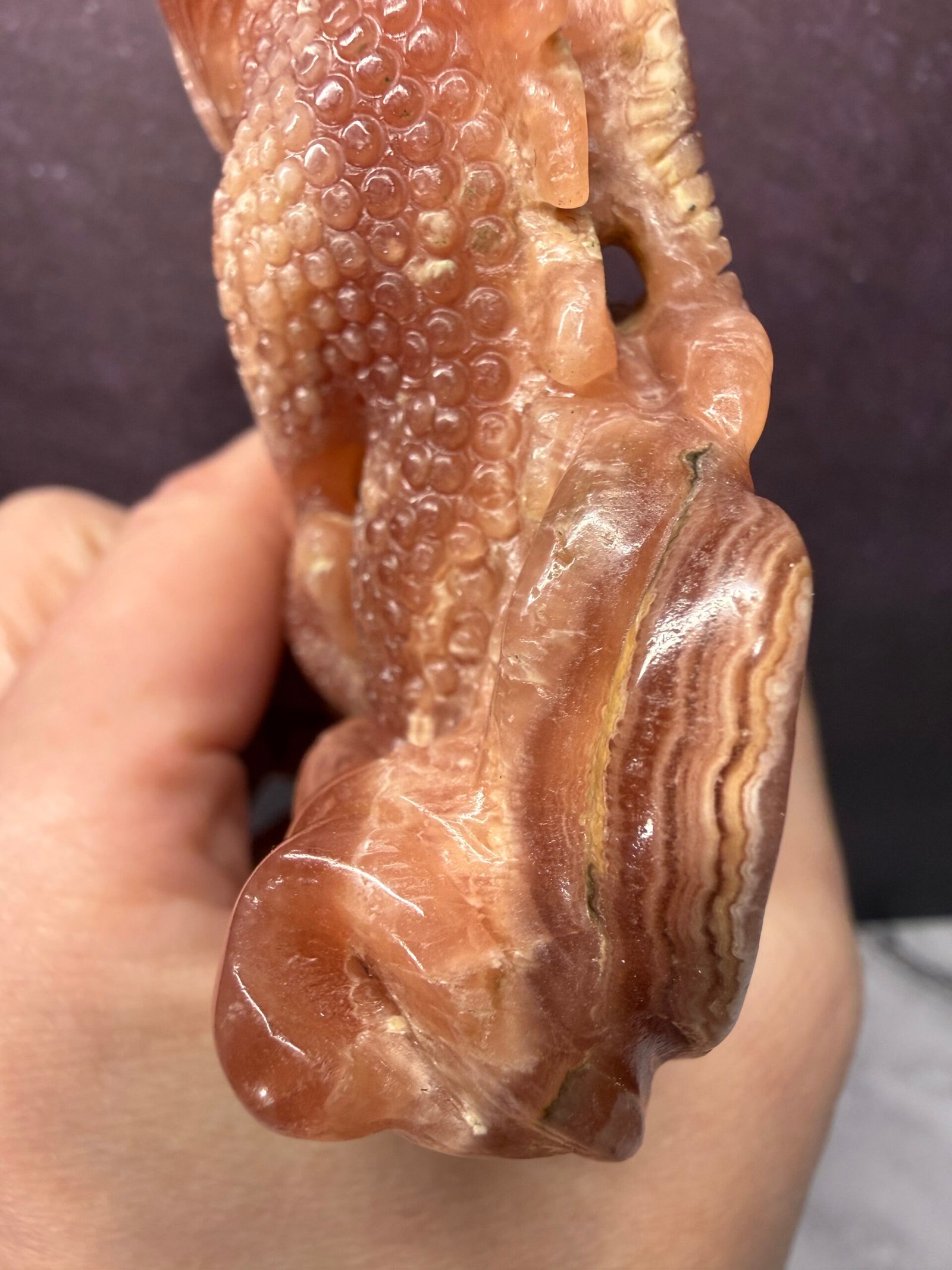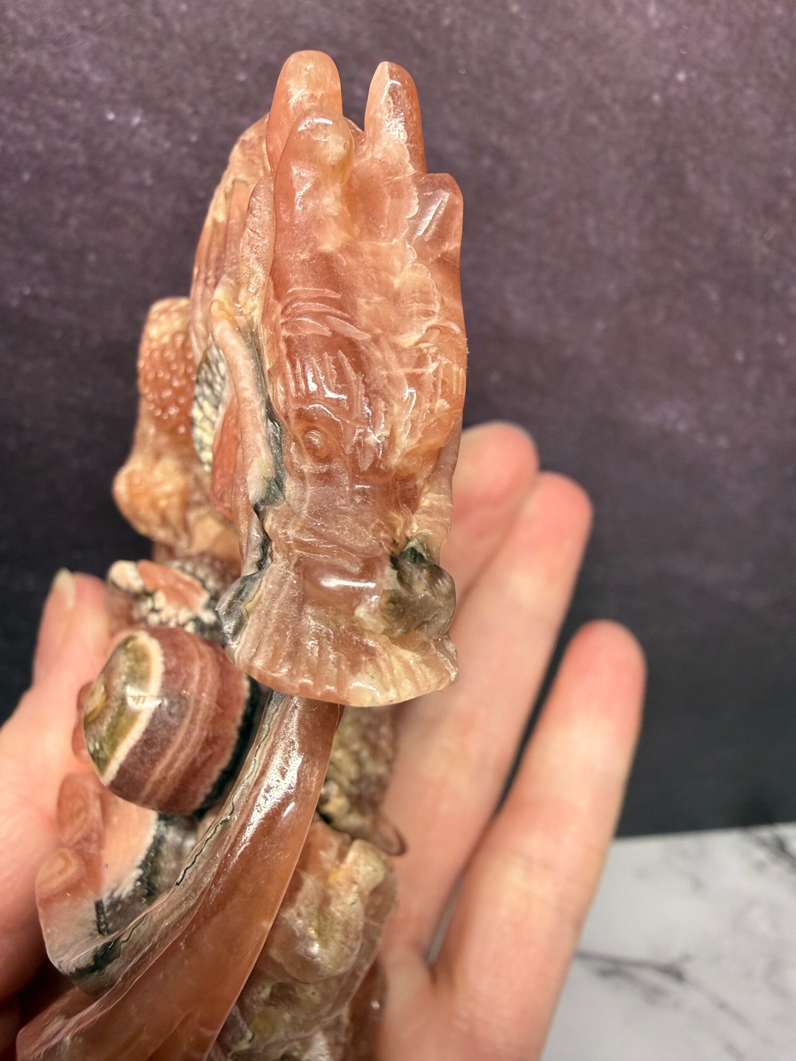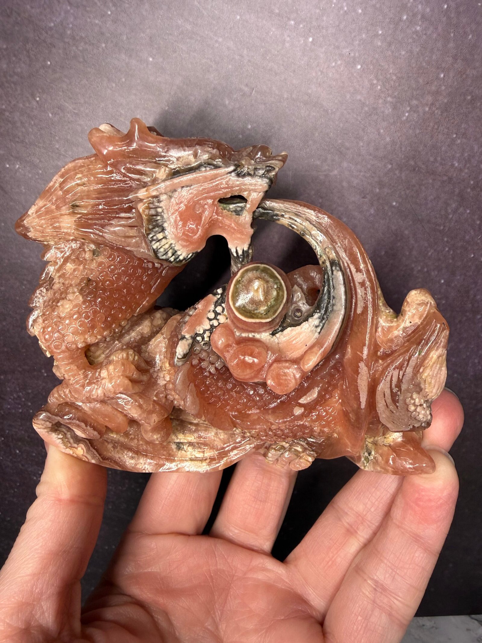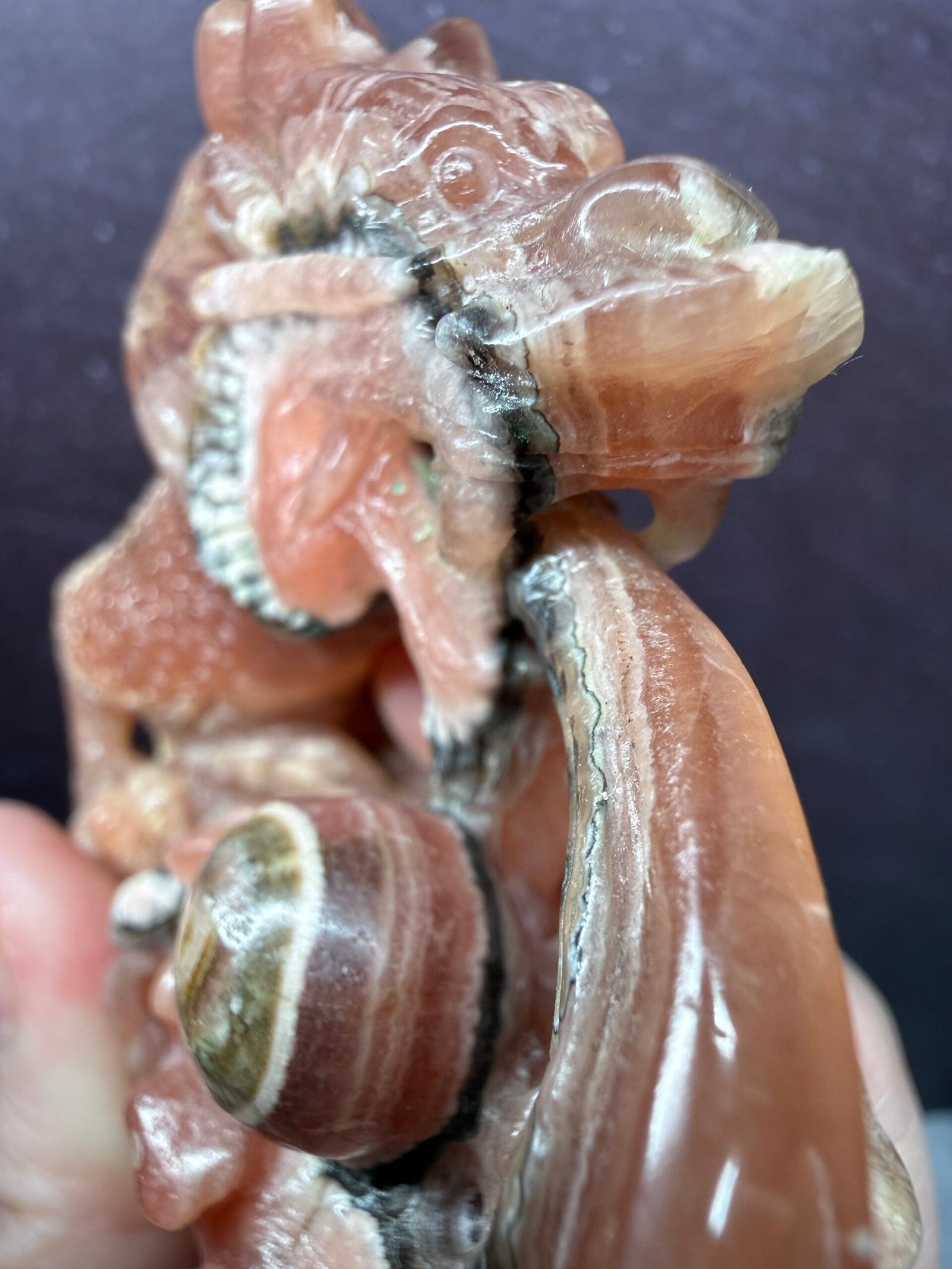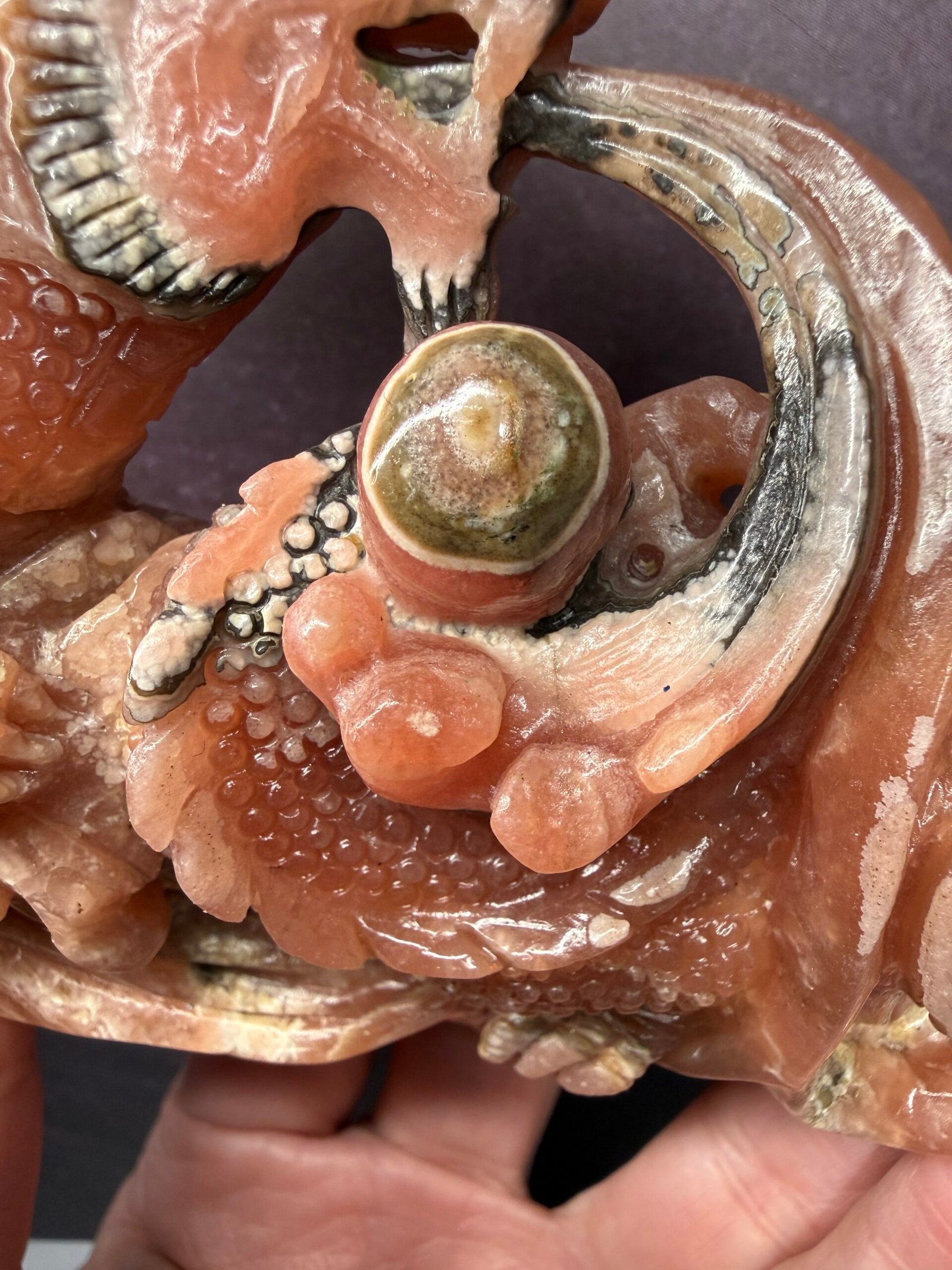 This hand carved Rhodochrosite dragon has wonderful detail and colour. The carver has worked with the colours and patterning of their material and created a show stopping carving.