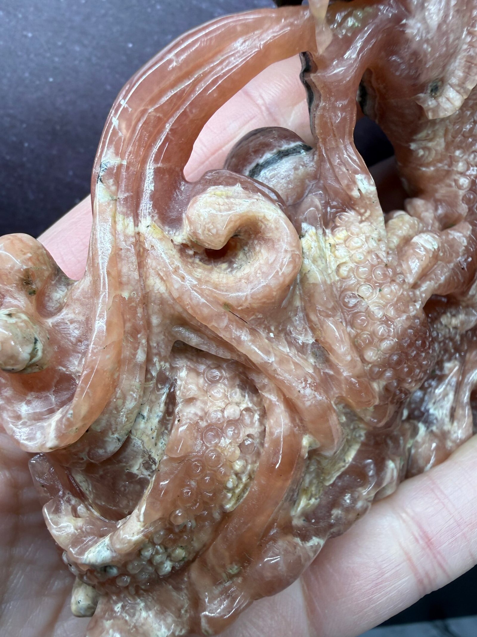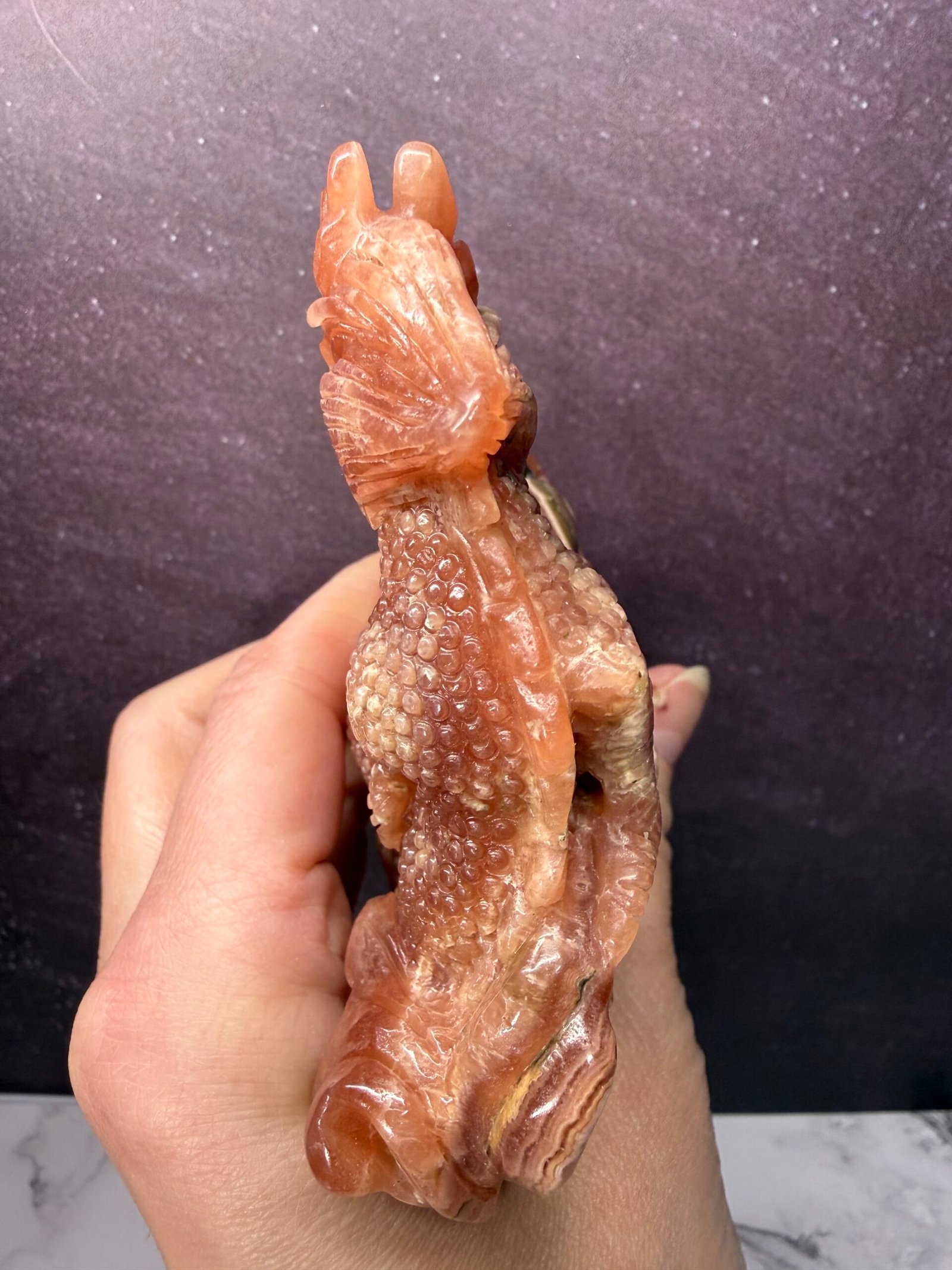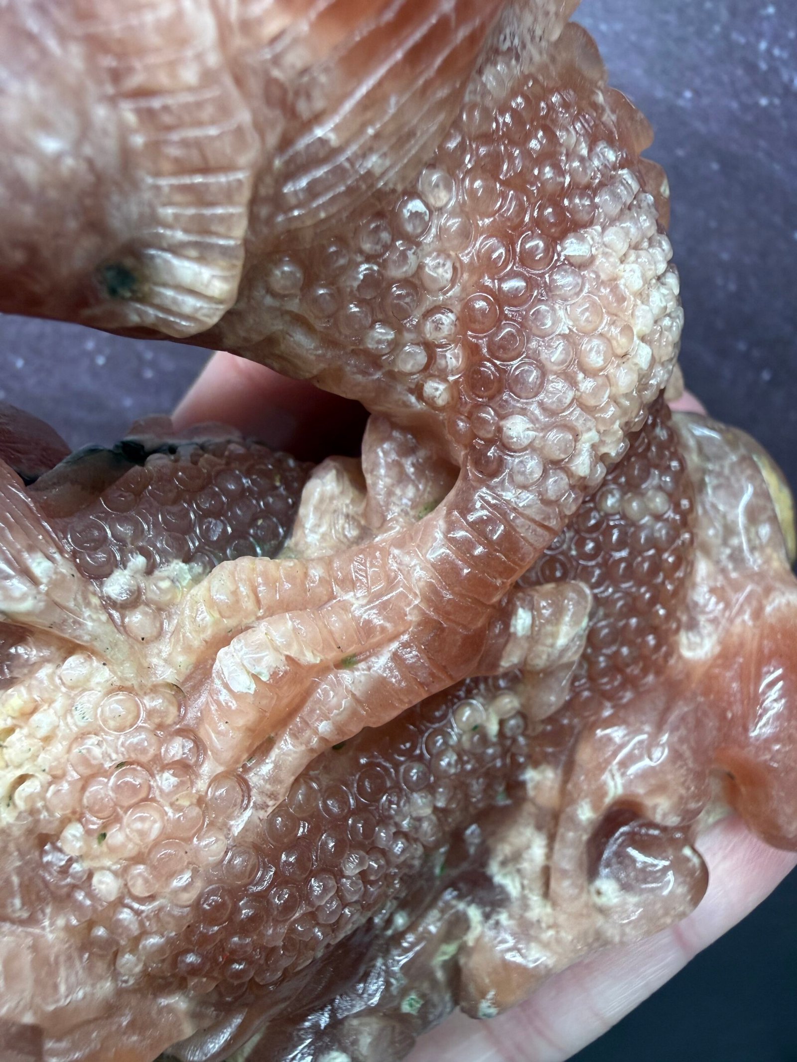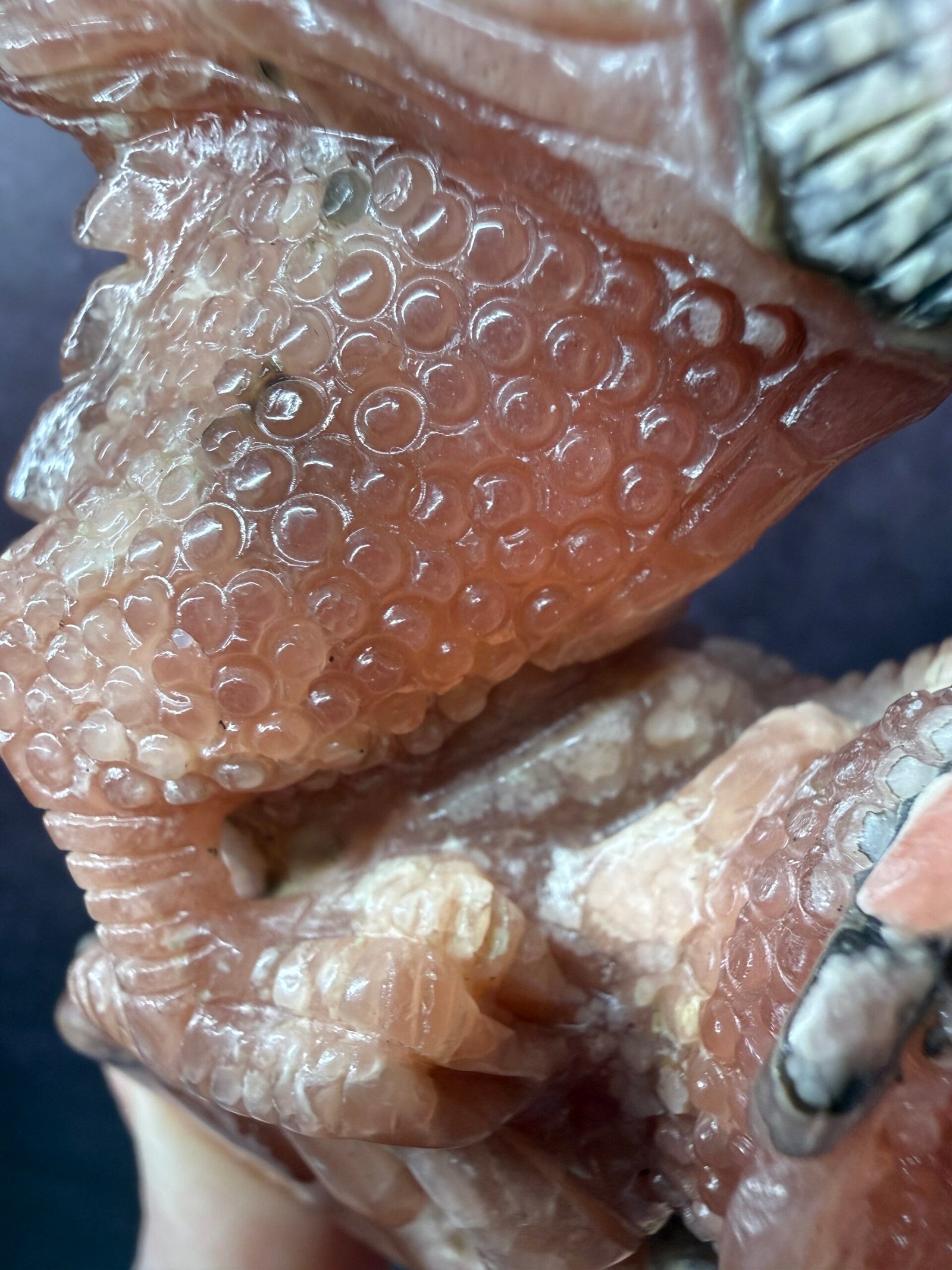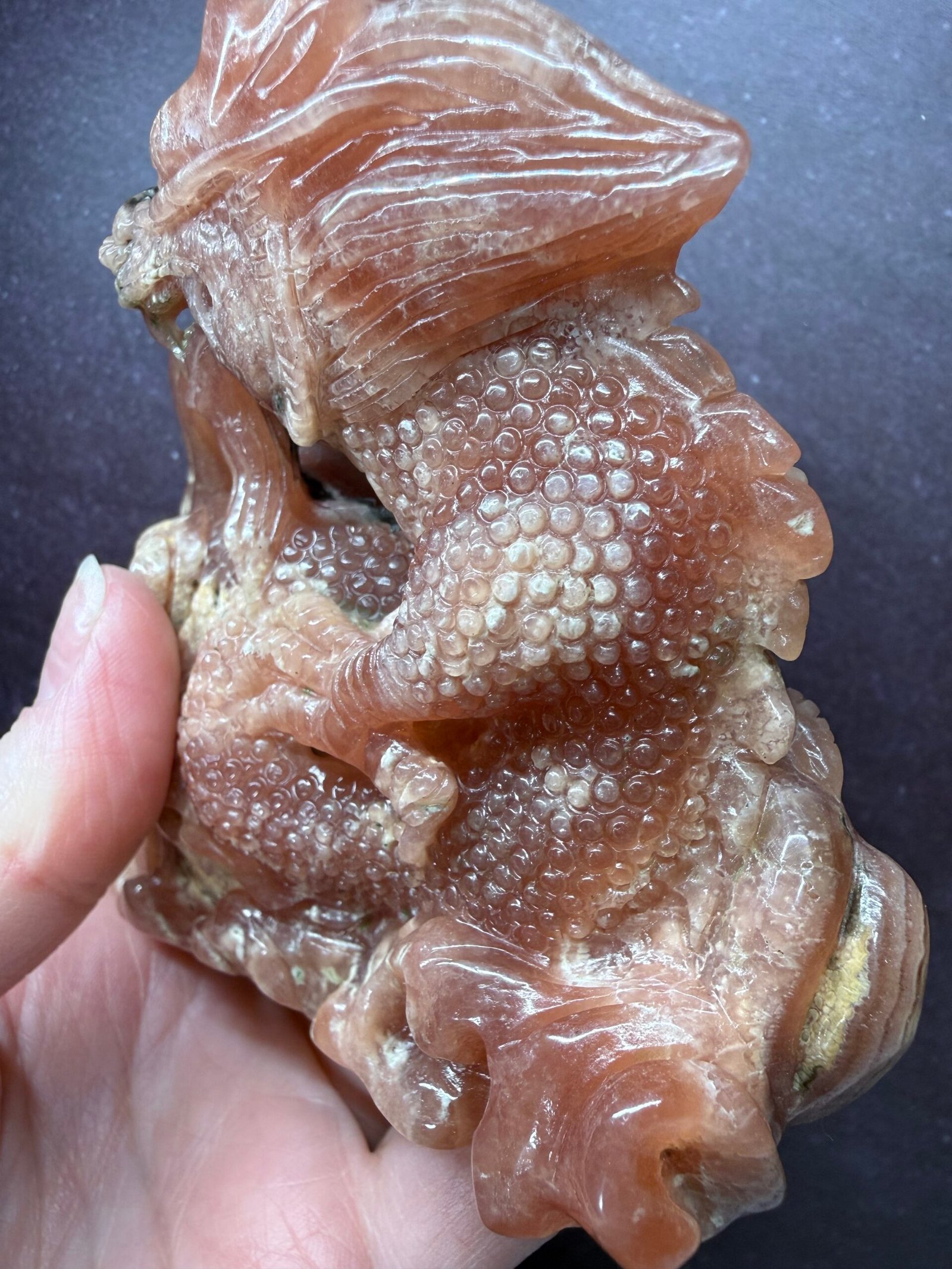 This hand carved Rhodochrosite dragon has wonderful detail and colour. The carver has worked with the colours and patterning of their material and created a show stopping carving.