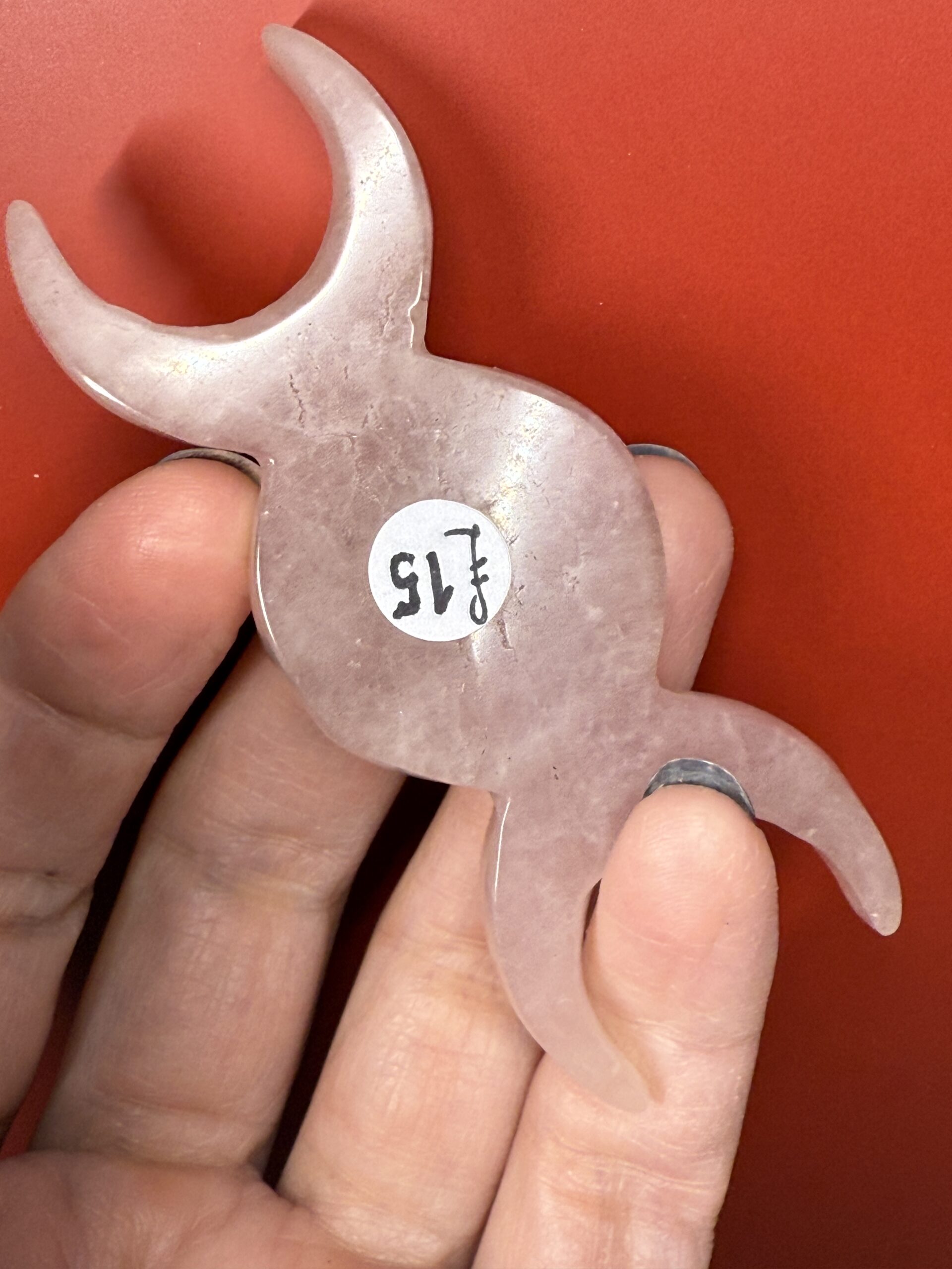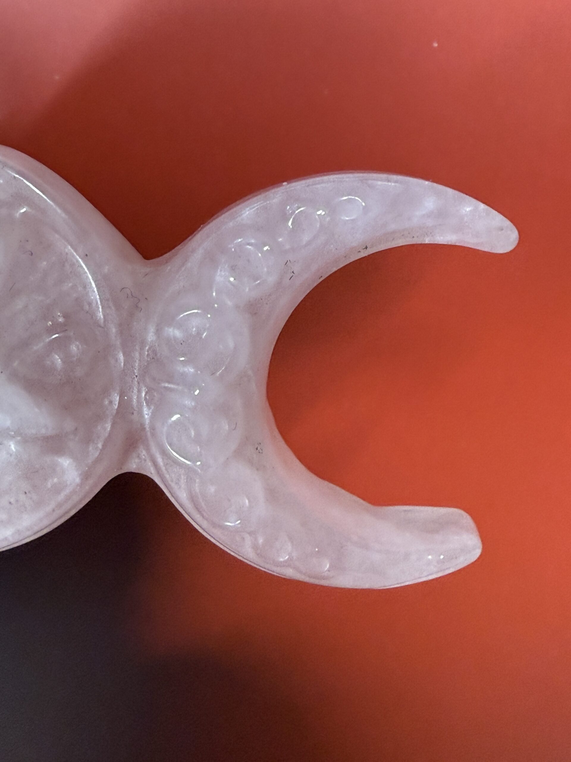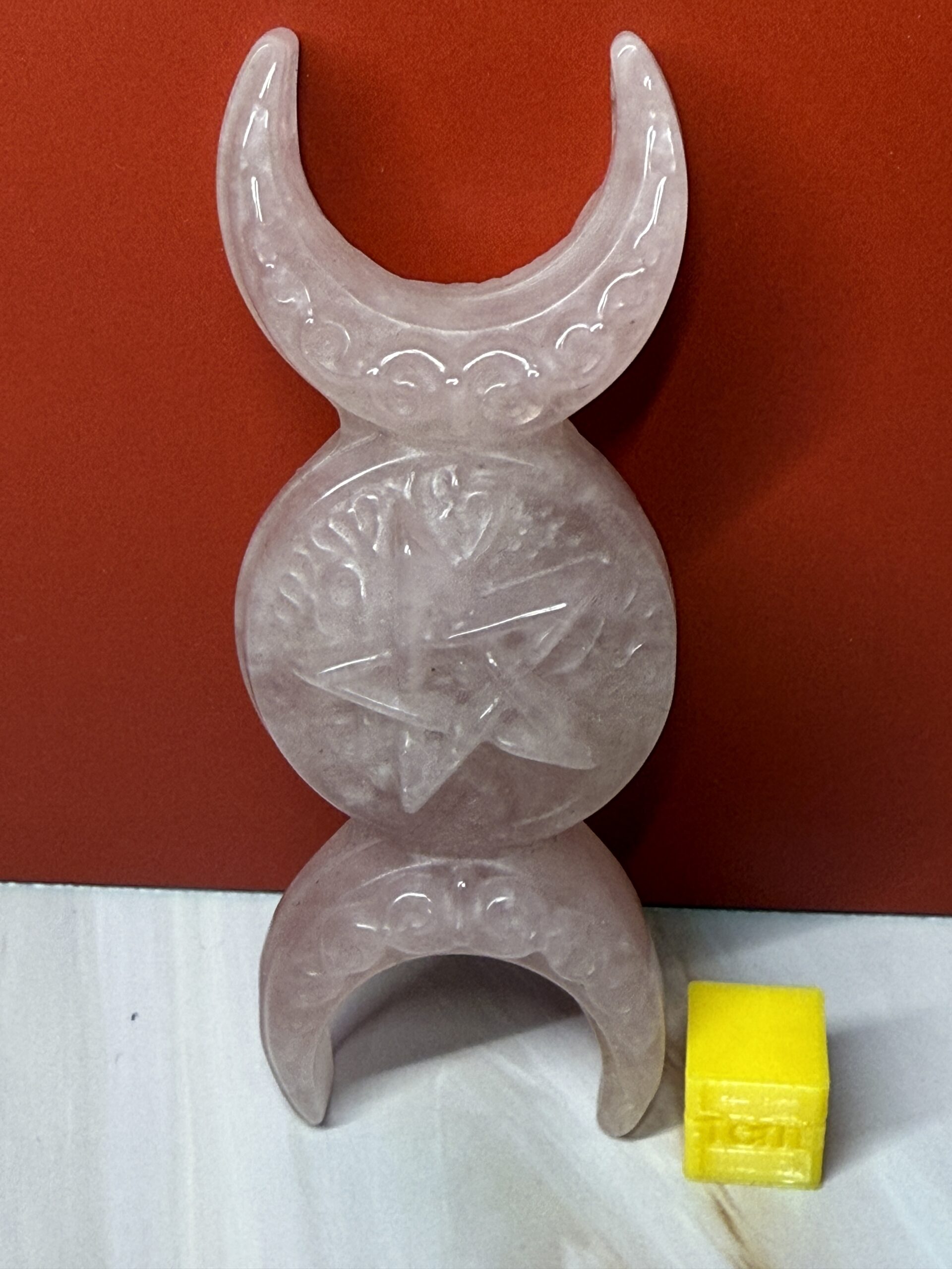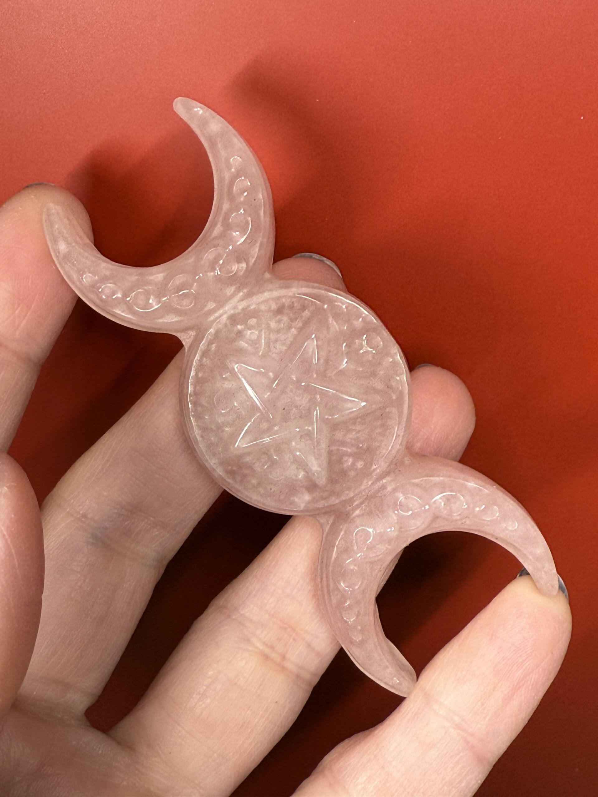 Beautifully detailed Rose Carving of the triple moons. A pentagram carving in the full moon and Celtic knot work on the waning and waxing.