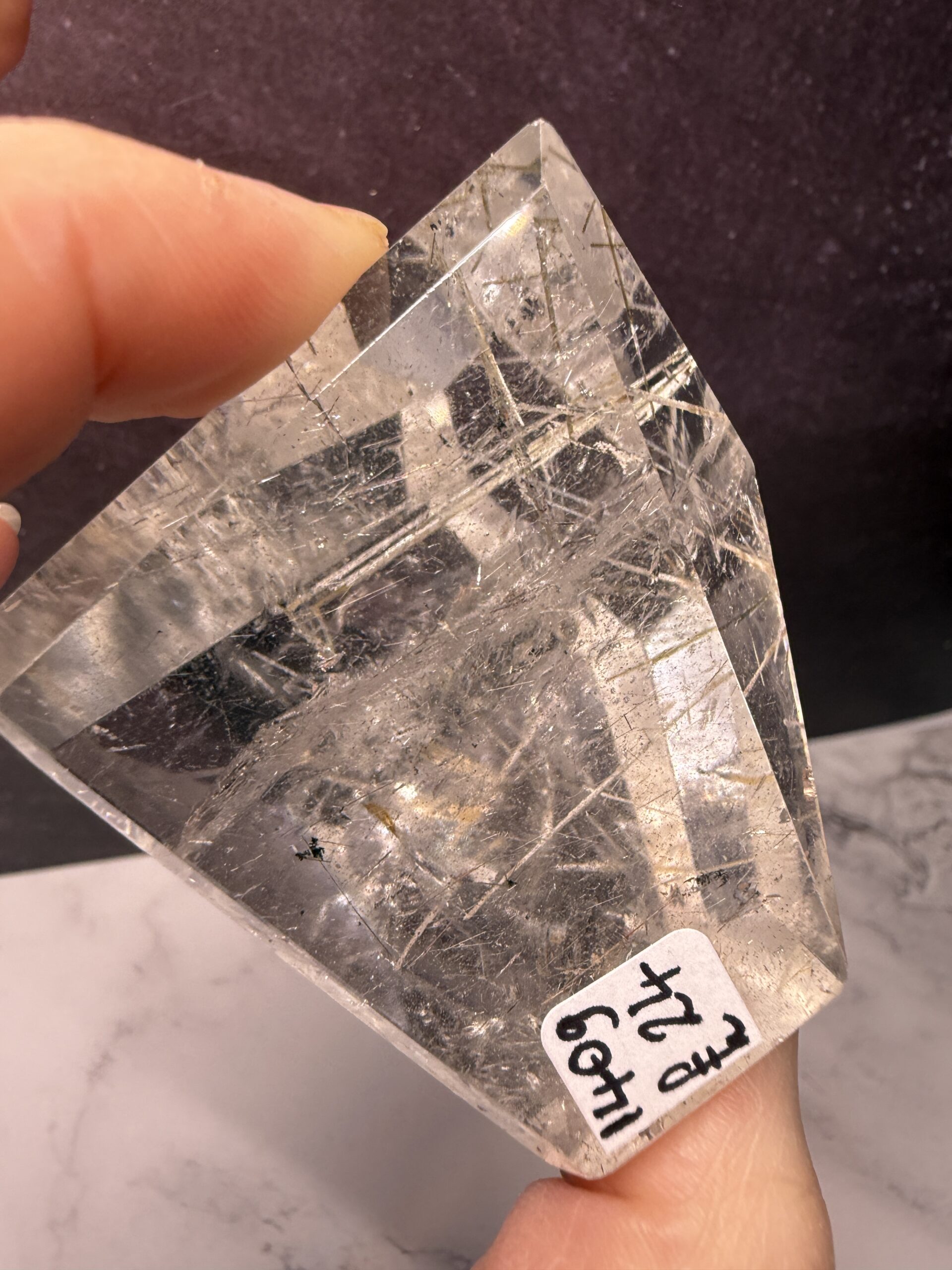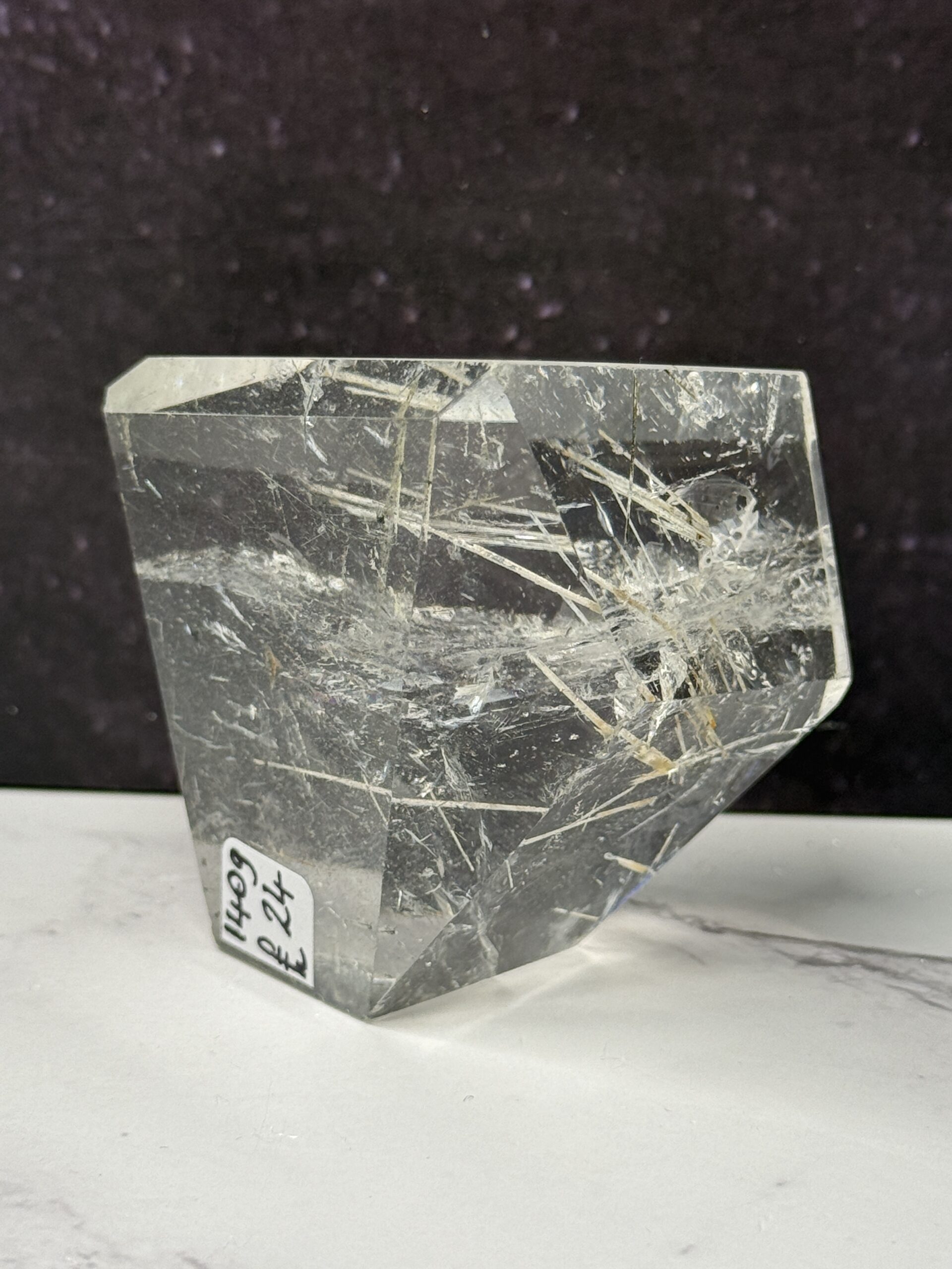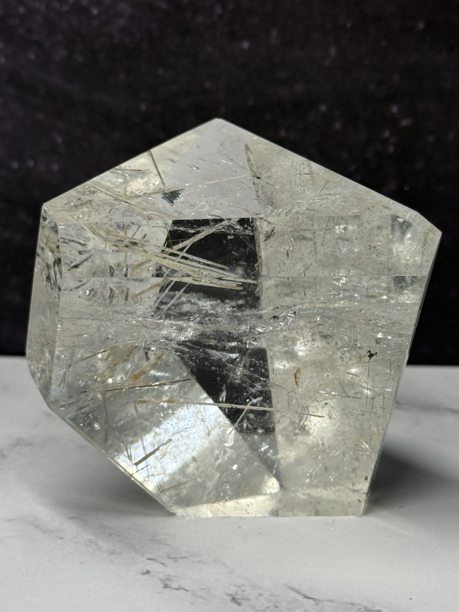 This beautifully clear Quartz Freeform has unusual white rutile inclusions.