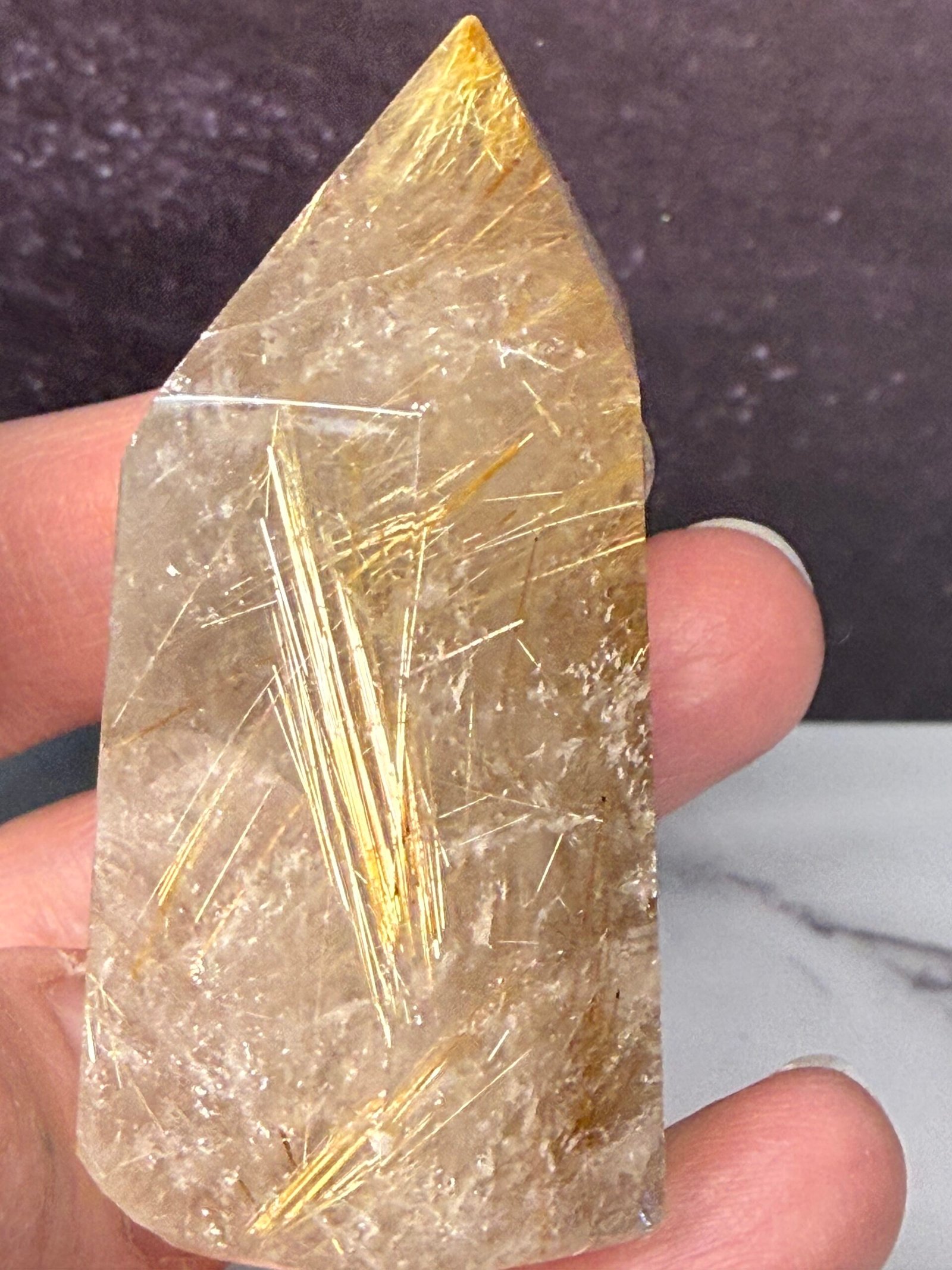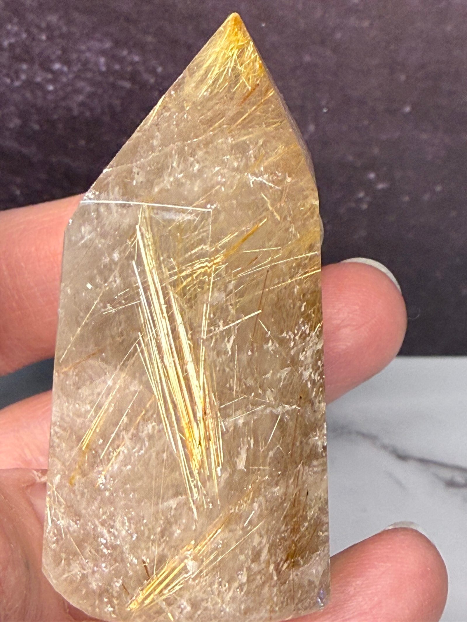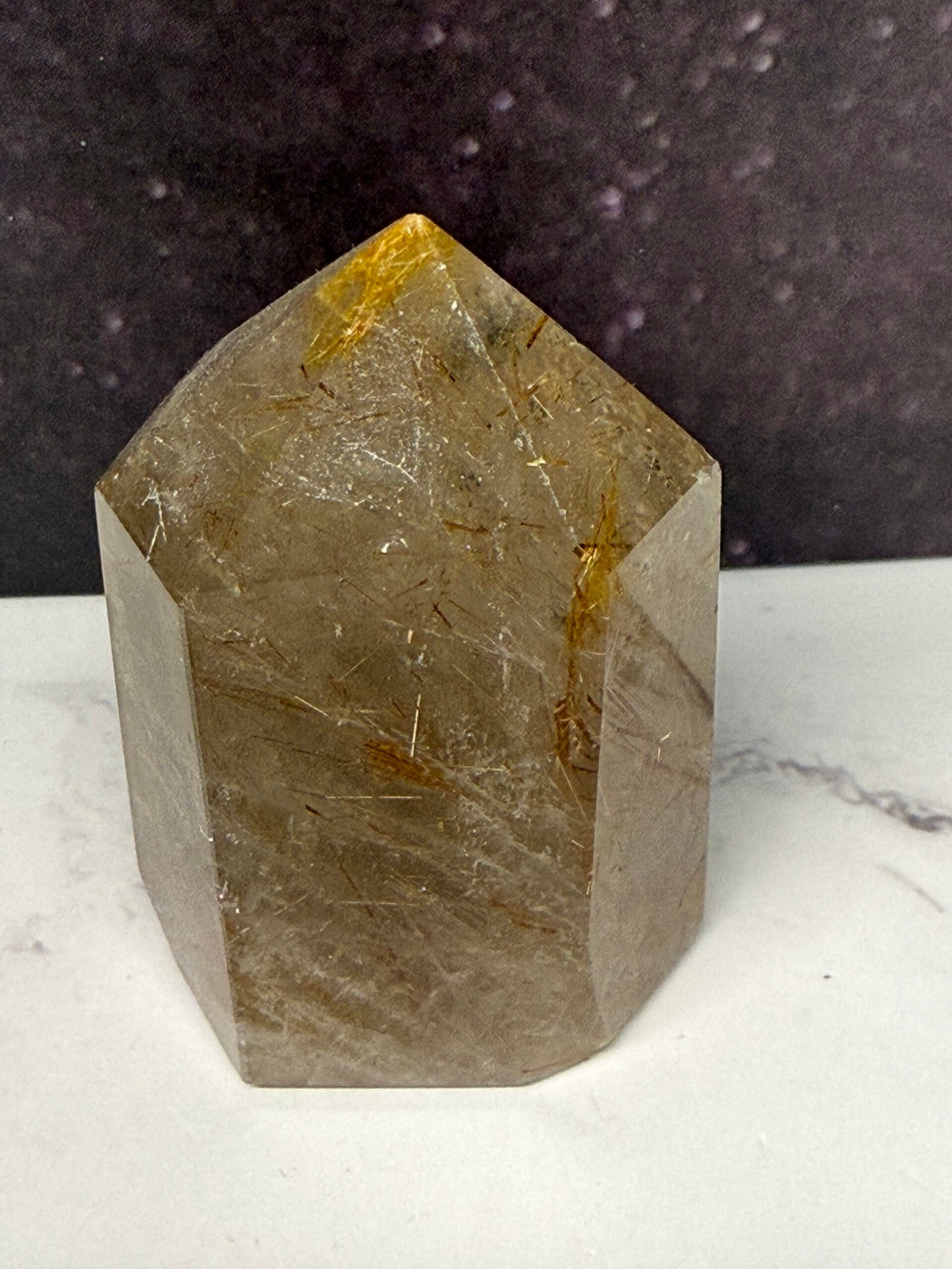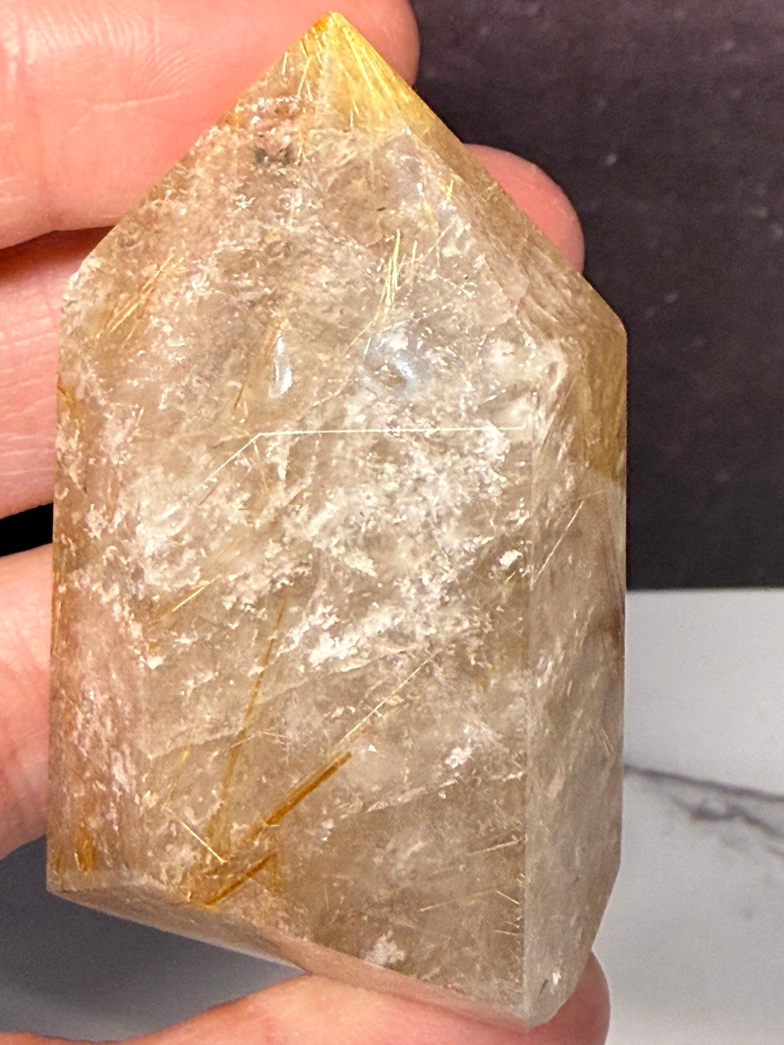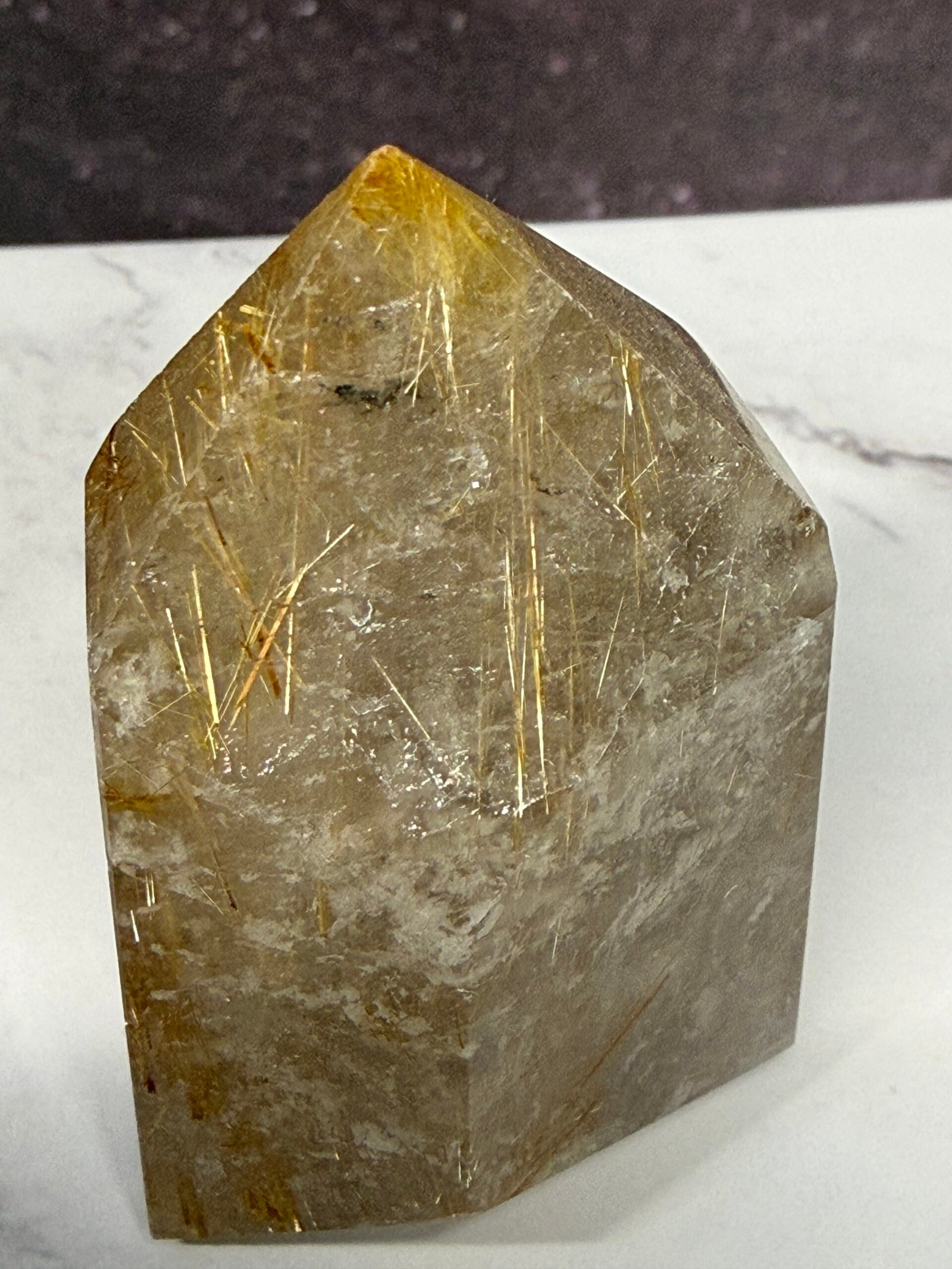Rutilated Quartz has a high vibration and aligns all the chakras. It promotes spiritual growth and attunes one to their Divine Purpose. It is very programmable and can be used to magnify the energy of any intention or affirmation. It accelerates the manifestation process and enhances intuition, psychic opening, and consciousness expansion. It allows one to release fear and anxiety related to childhood memories.