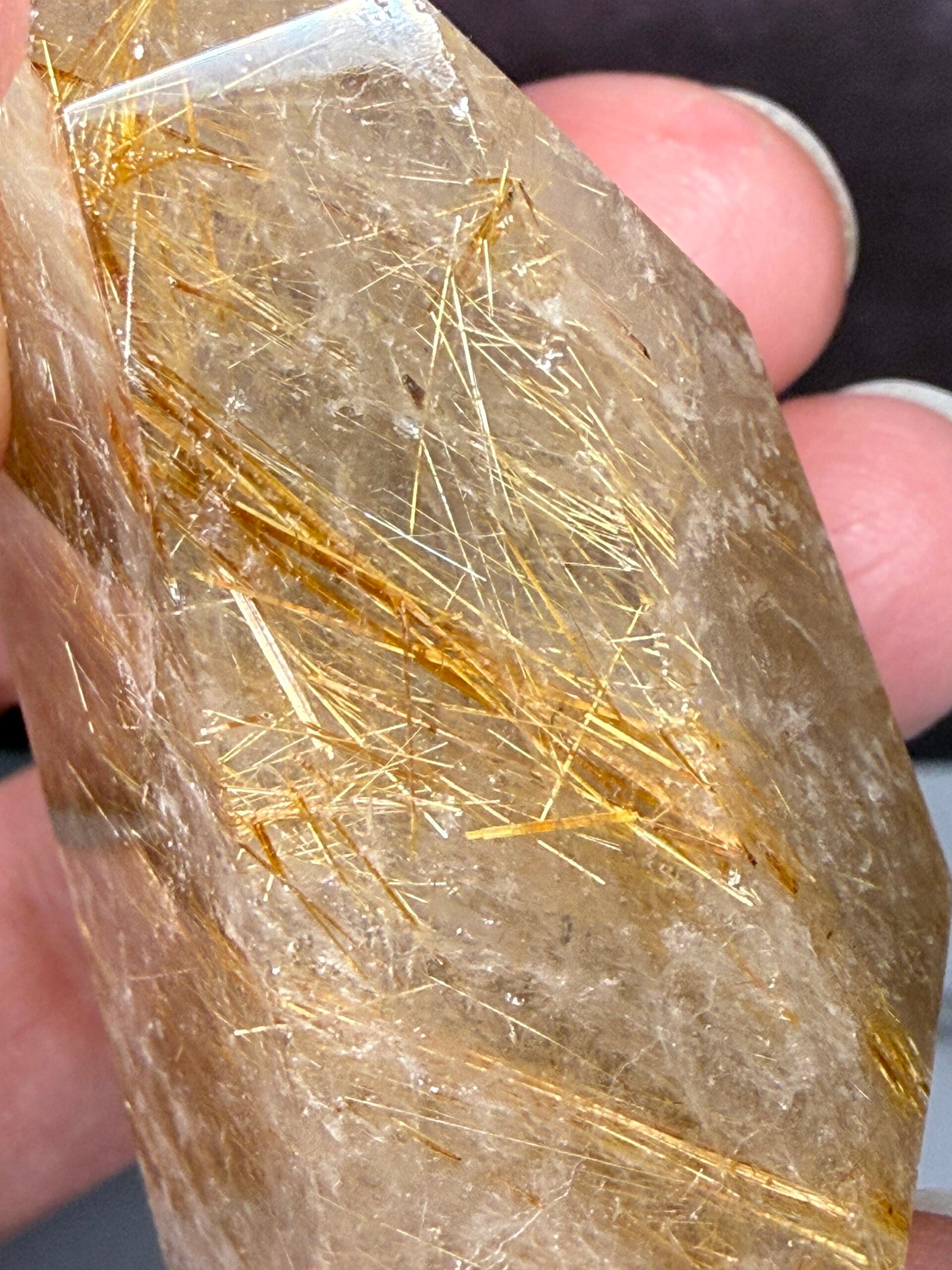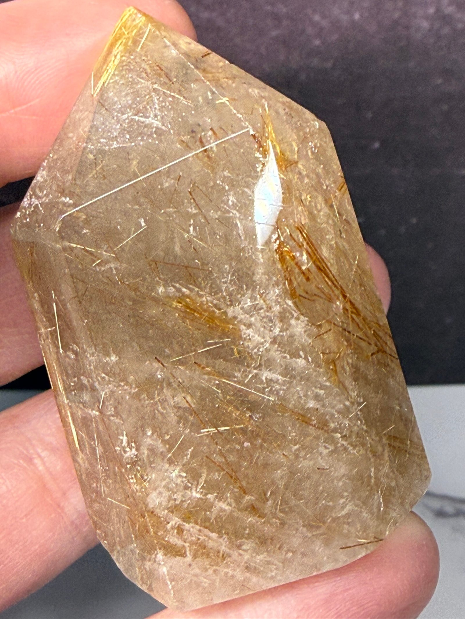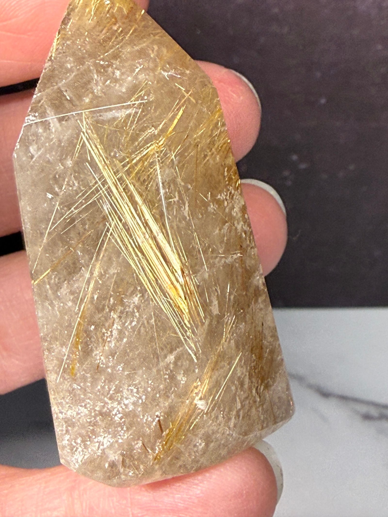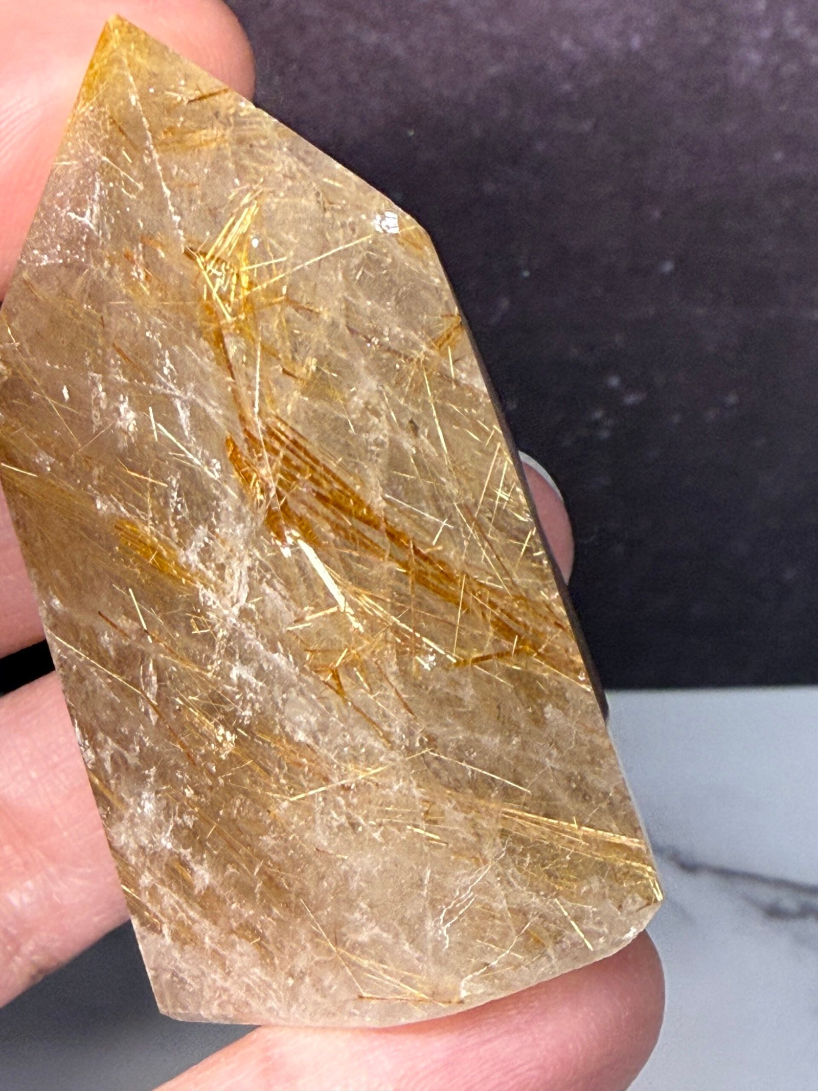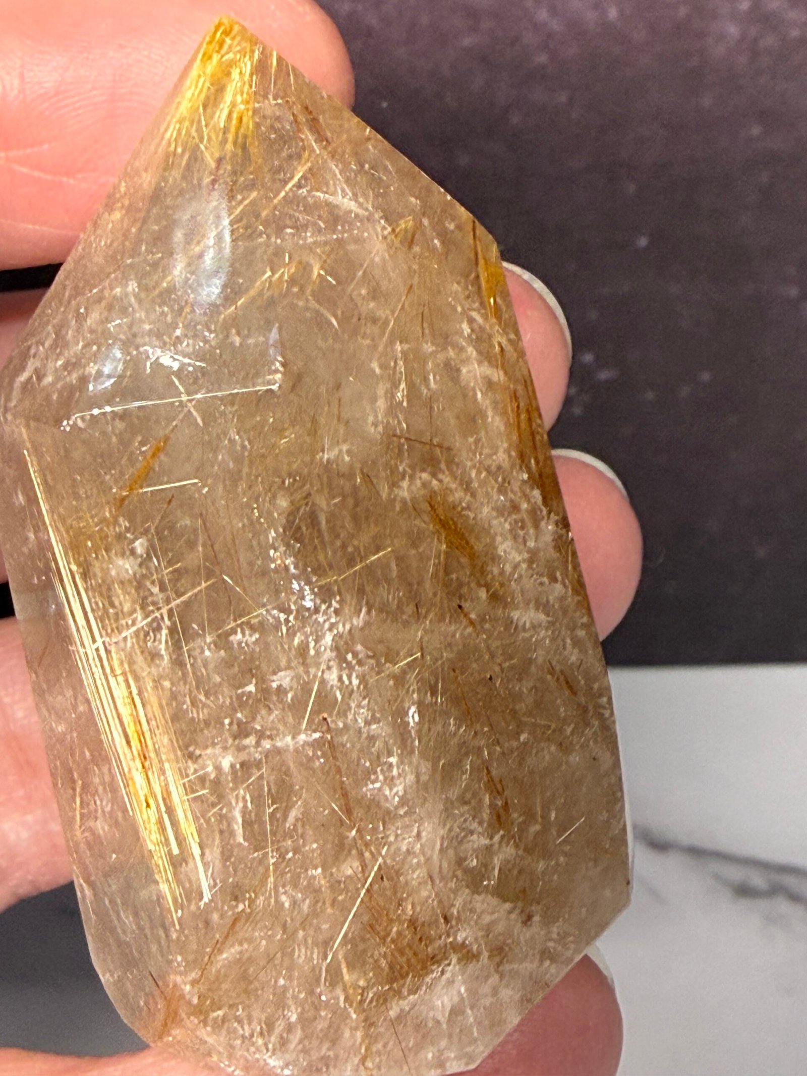 Rutilated Quartz has a high vibration and aligns all the chakras. It promotes spiritual growth and attunes one to their Divine Purpose. It is very programmable and can be used to magnify the energy of any intention or affirmation. It accelerates the manifestation process and enhances intuition, psychic opening, and consciousness expansion. It allows one to release fear and anxiety related to childhood memories.