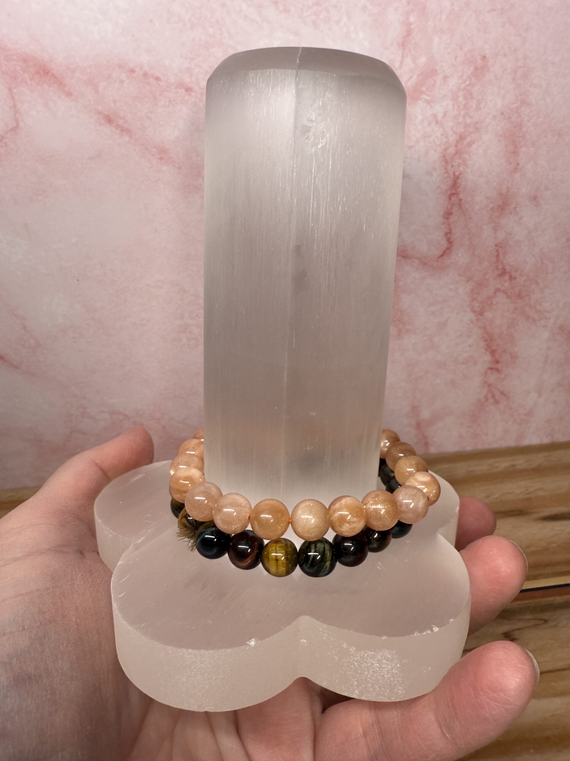 This handy satin spar (often mislabelled as Selenite which is from the same family but a slower growing and more expensive material- both have similar metaphysical properties) bracelet holder is ideal for cleansing your bracelets, ready to wear the next day.