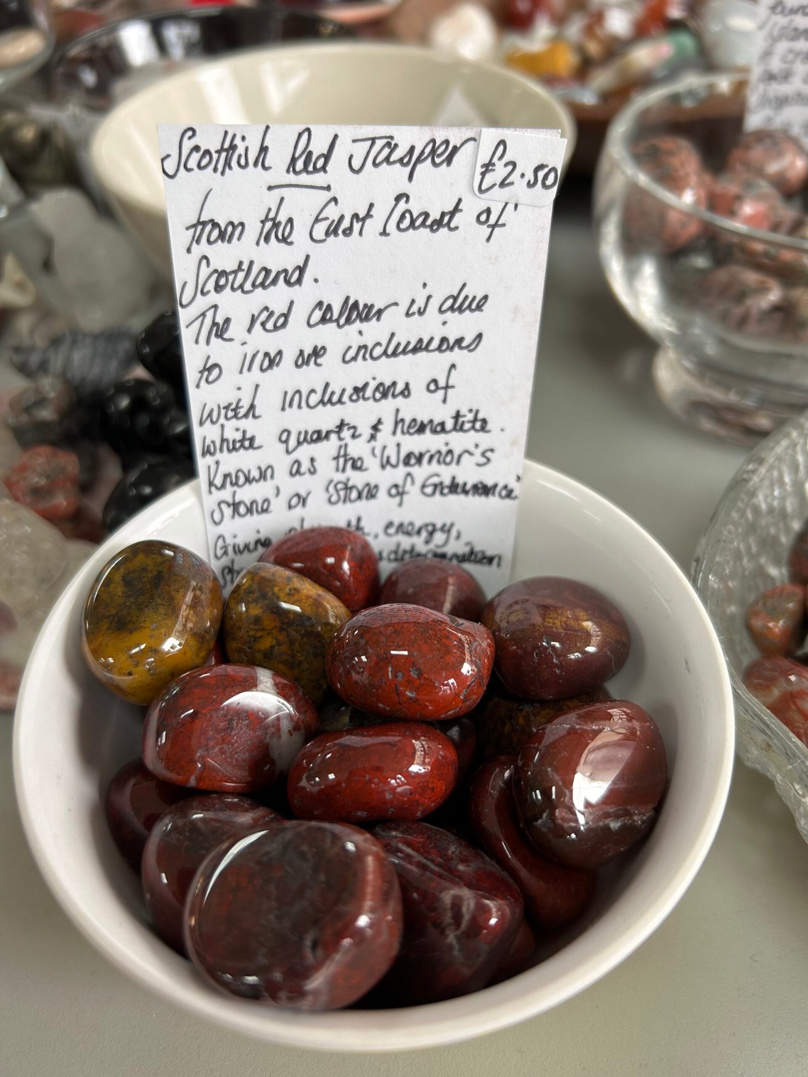 Scotlands native Red Jasper comes from the east coast of Scotland. The common red colour is due to natural iron ore inclusions, but sometimes it is also yellow, brown or green in colour, and very rarely, blue. Scottish Red Jasper are a mixture of red jasper, white quartz and hematite. Red Jasper is thought to increase strength, energy, stamina, focus and determination. Particularly here in Scotland, it was known as ‘the warrior’s stone’ or ‘stone of endurance’ and was used for controlling and grounding.