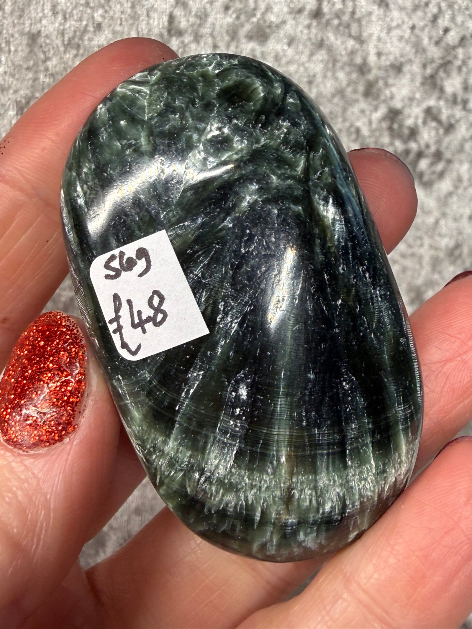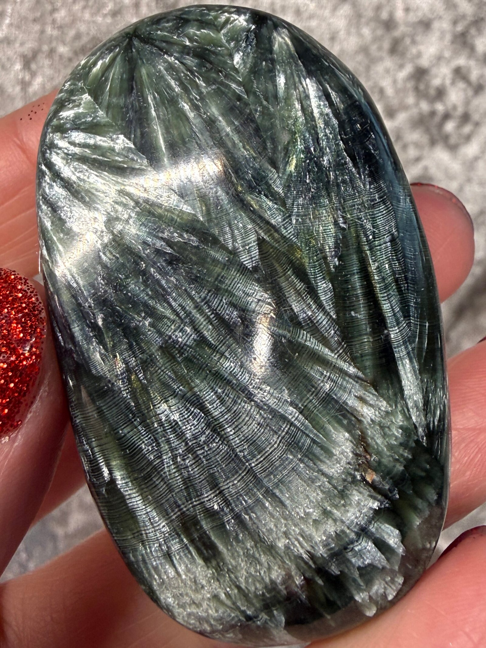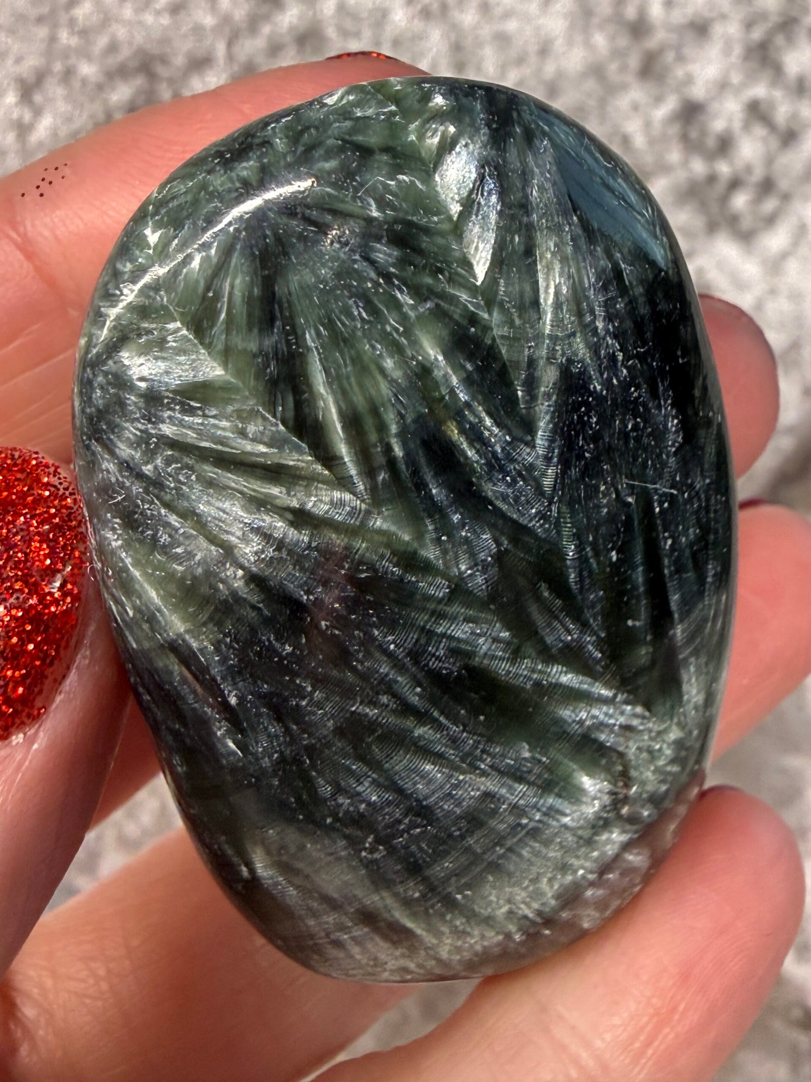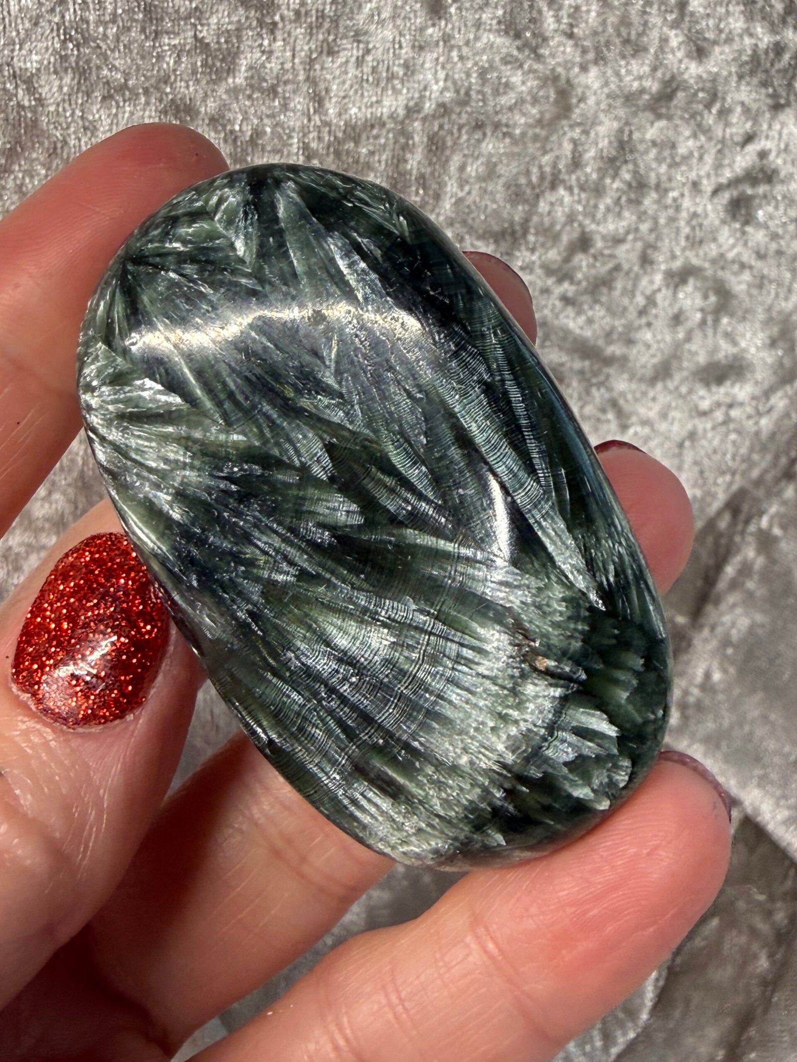 Seraphinite derives its name from Seraphim, the highest order of angels. Its unique white markings resemble angel wings. It holds a great deal of spiritual energy and facilitates contact with the angelic realm, the Divine Feminine, and nature spirits. It realigns the entire chakra system, clears blockages in the meridians, and promotes feelings of wholeness.