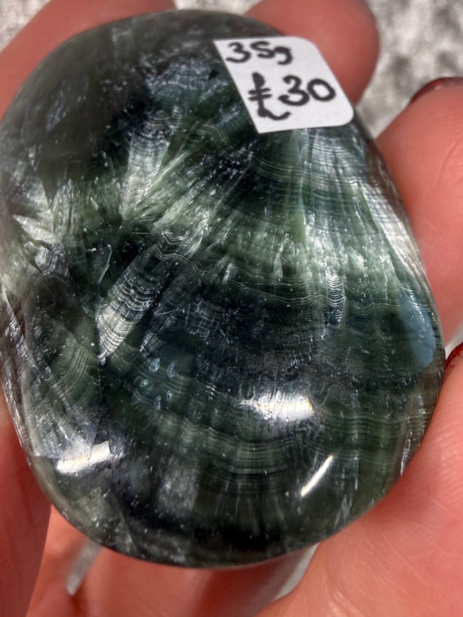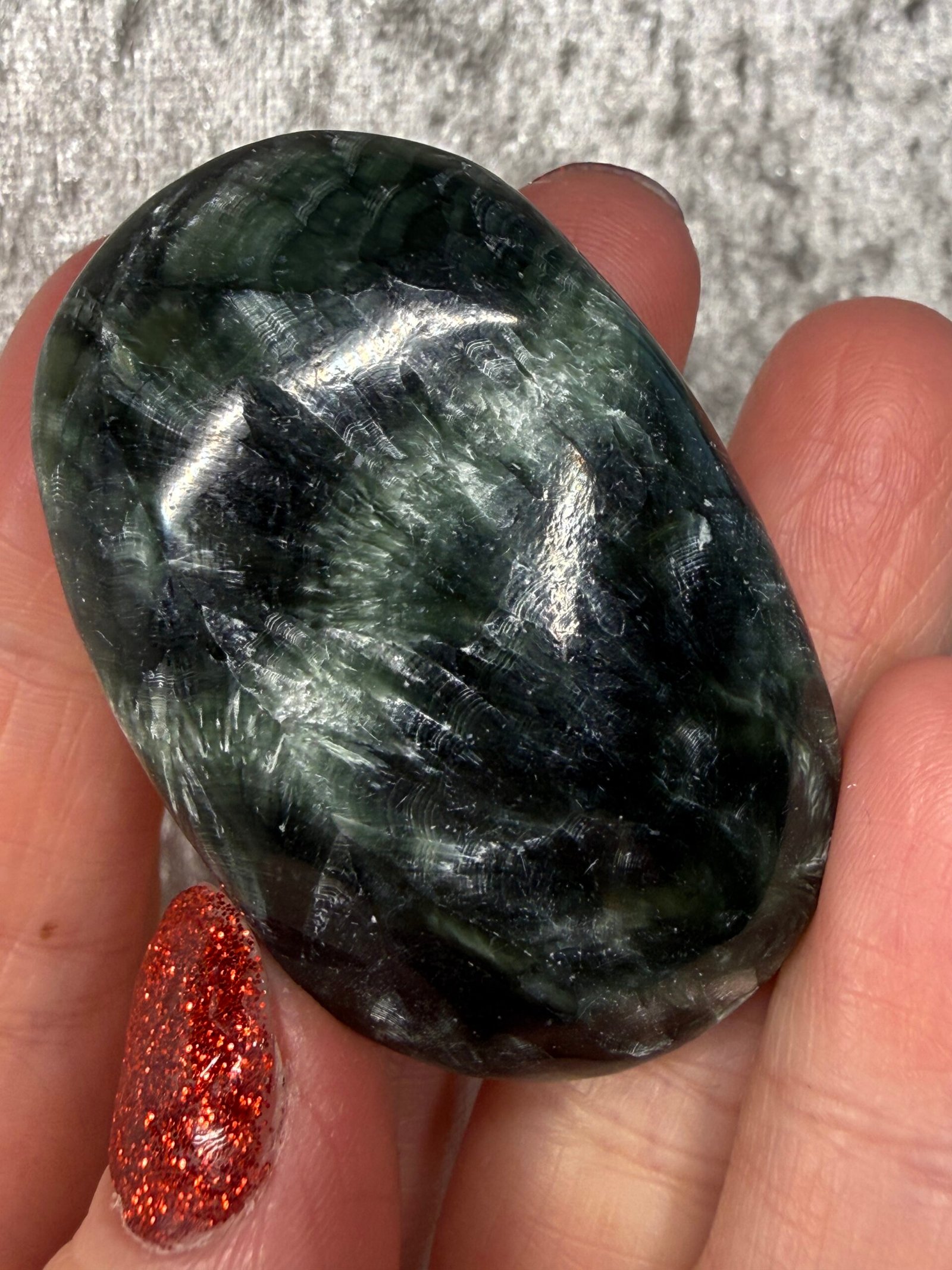 Seraphinite derives its name from Seraphim, the highest order of angels. Its unique white markings resemble angel wings. It holds a great deal of spiritual energy and facilitates contact with the angelic realm, the Divine Feminine, and nature spirits. It realigns the entire chakra system, clears blockages in the meridians, and promotes feelings of wholeness.