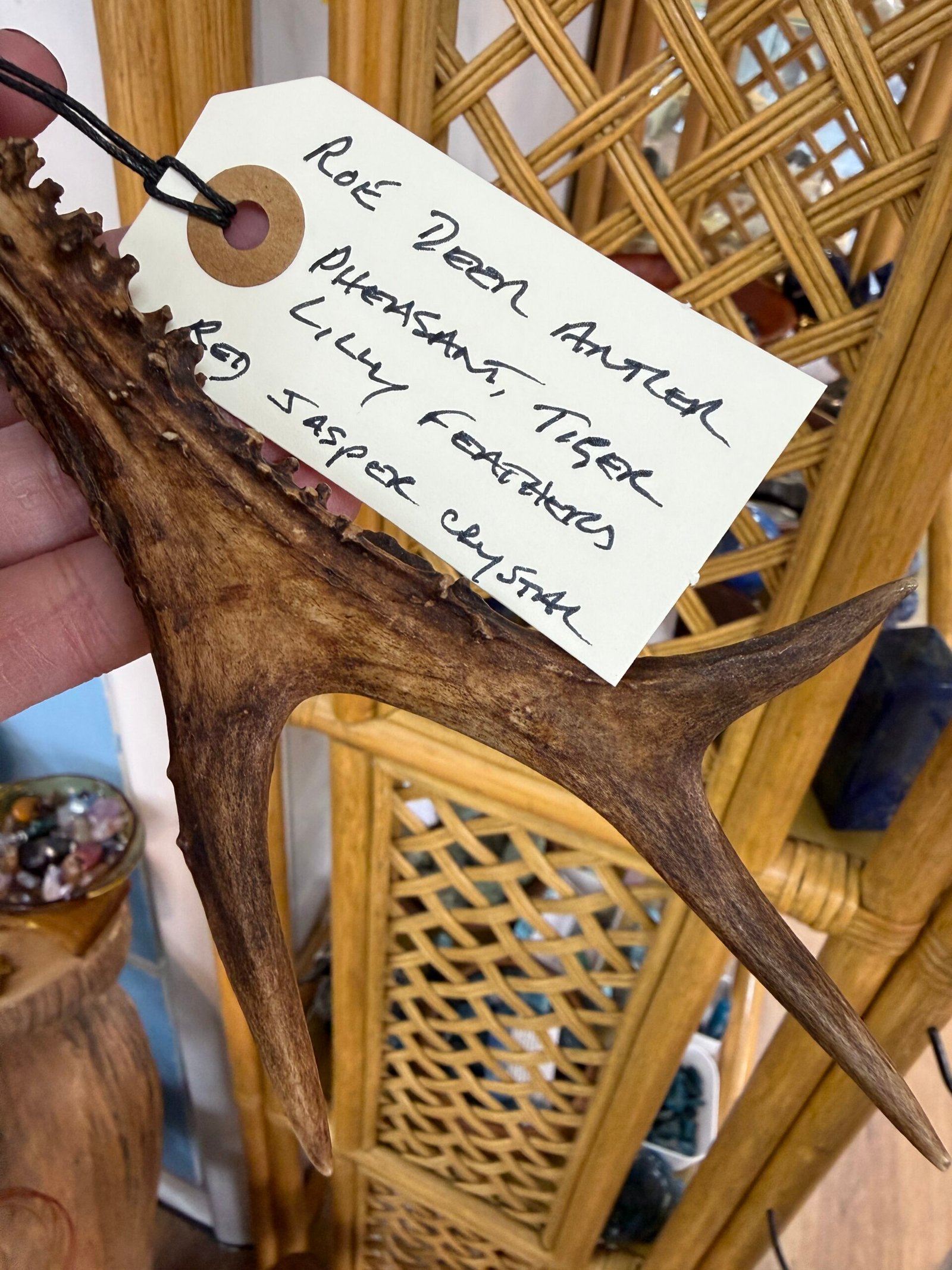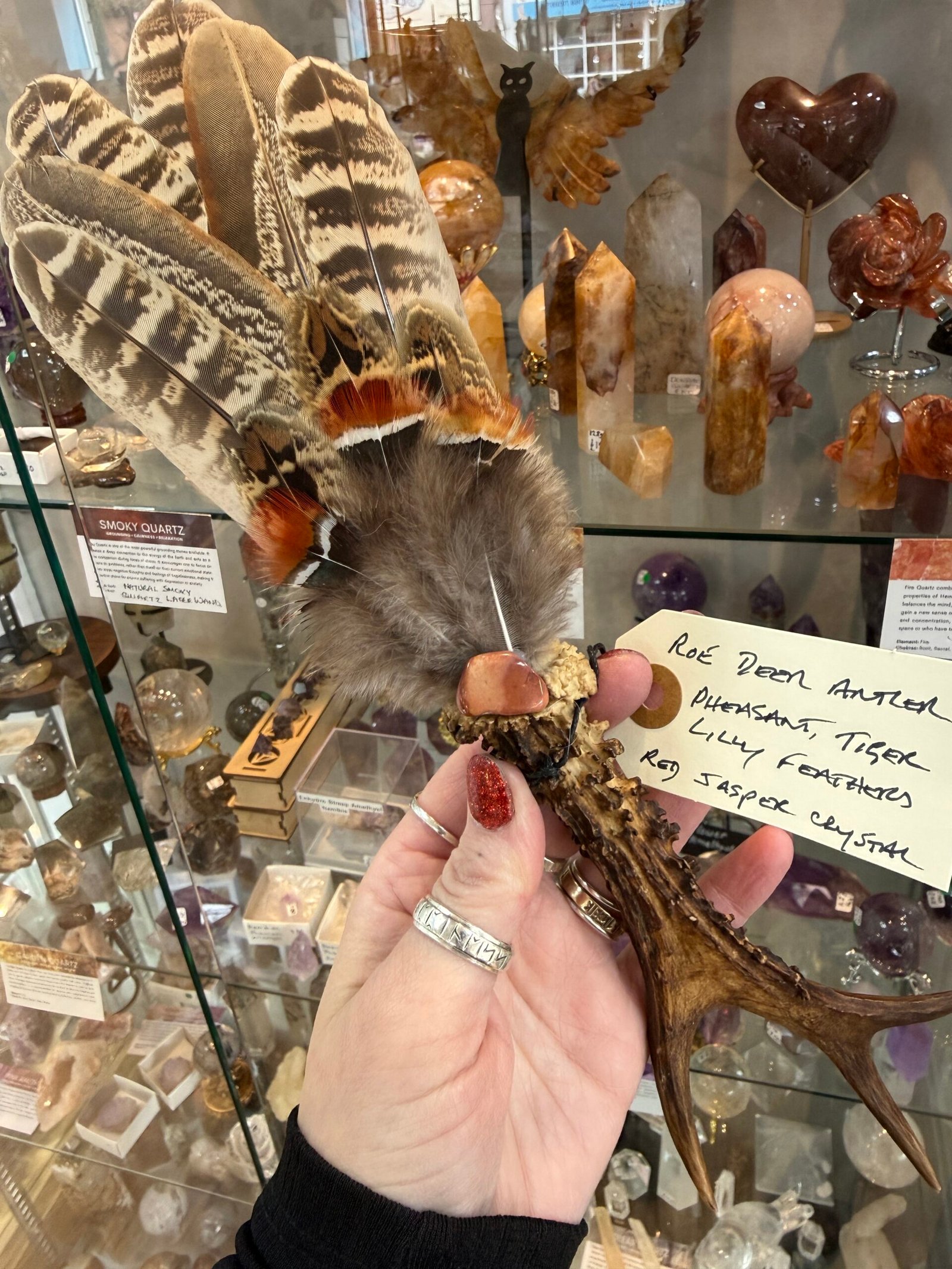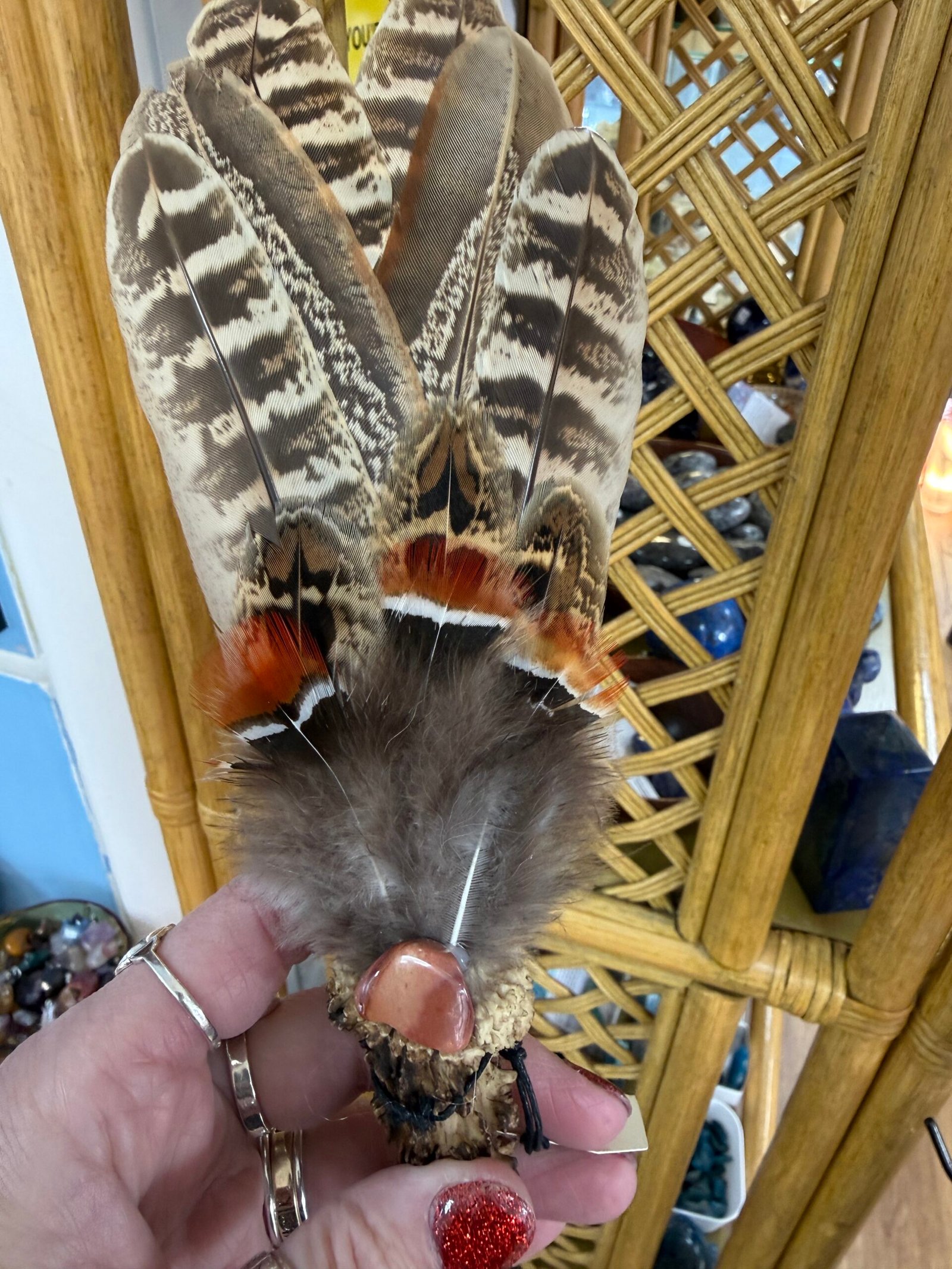 This fan is handmade with a Roe Deer antler handle, pheasant and tiger lily feathers and finished off with a red jasper crystal.