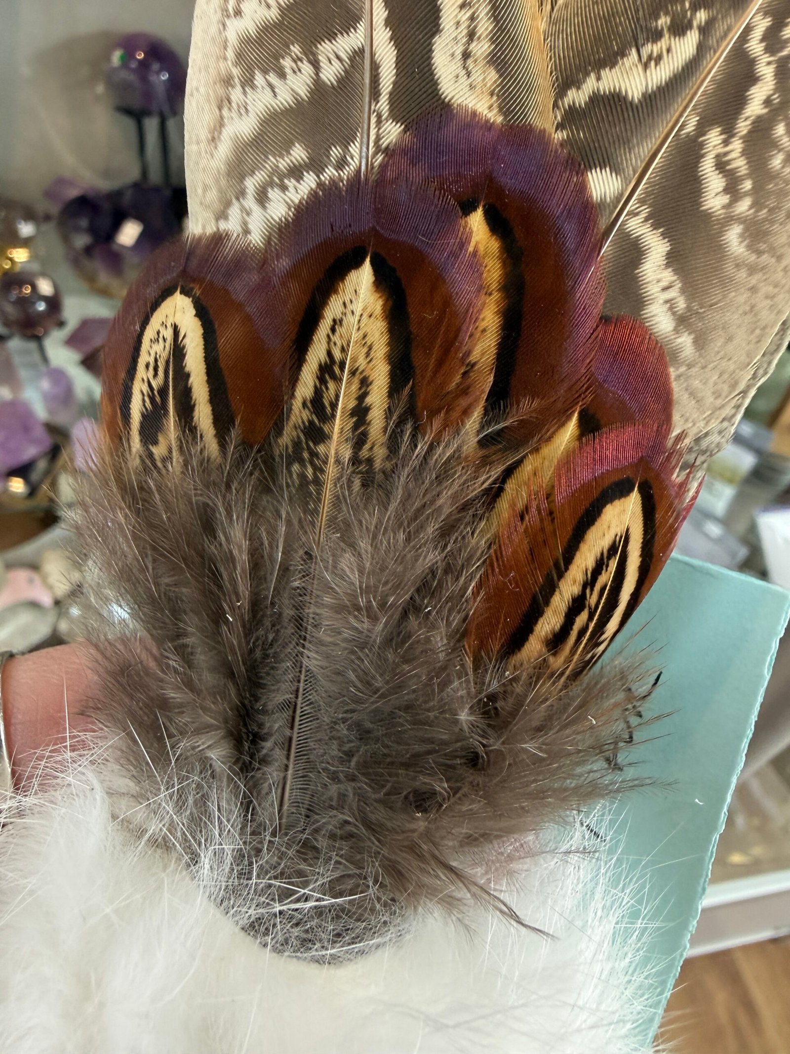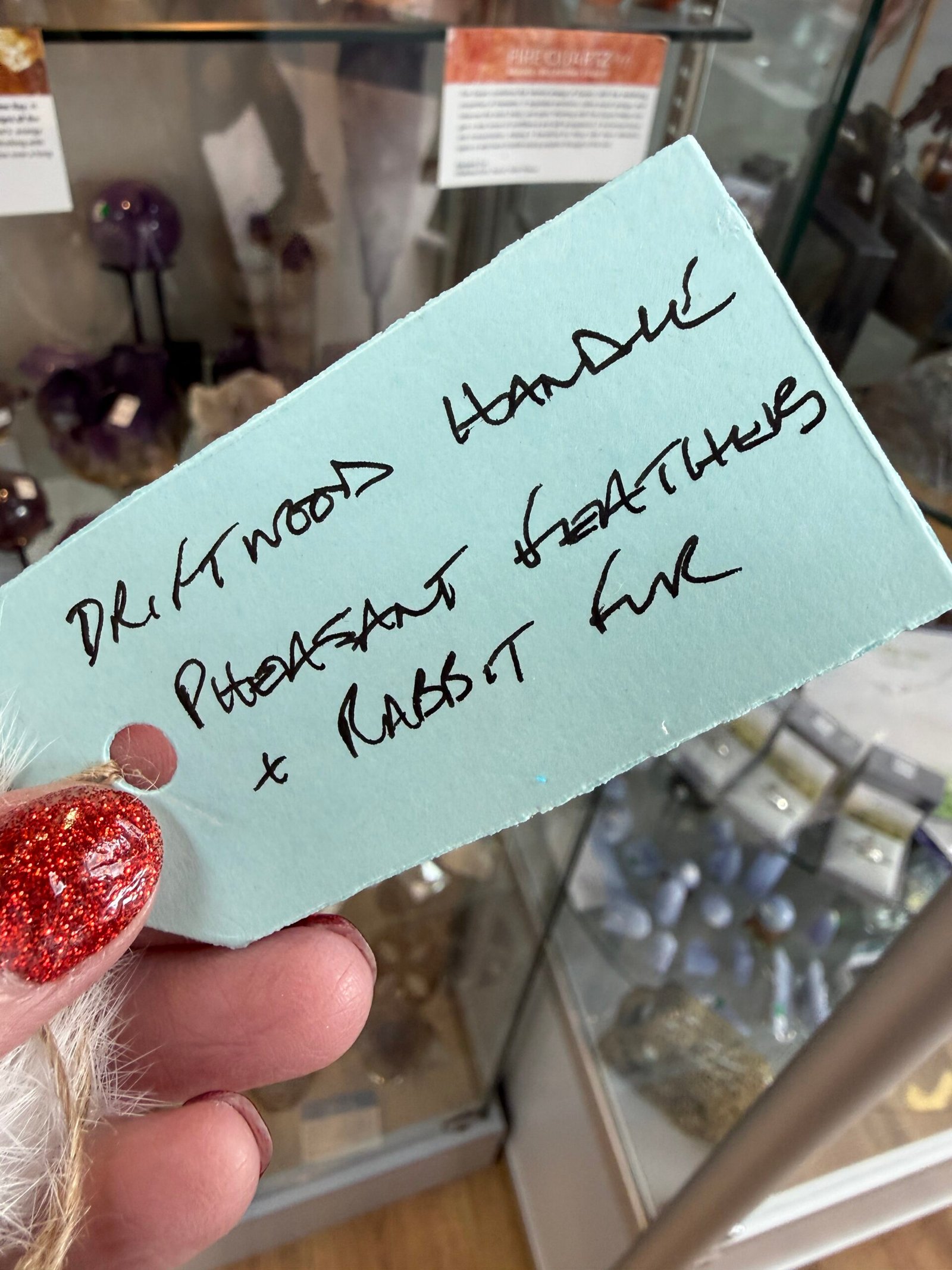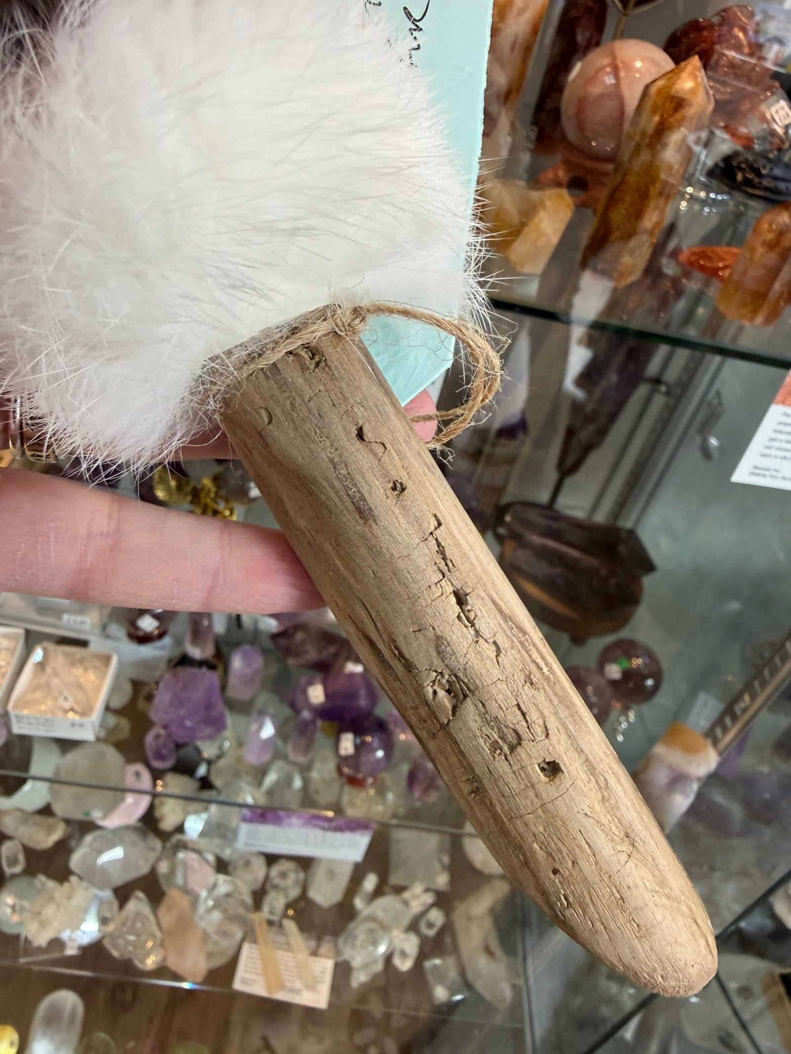 This fan is handmade with a driftwood handle, pheasant feathers and finished off with a cuff of recycled rabbit fur.