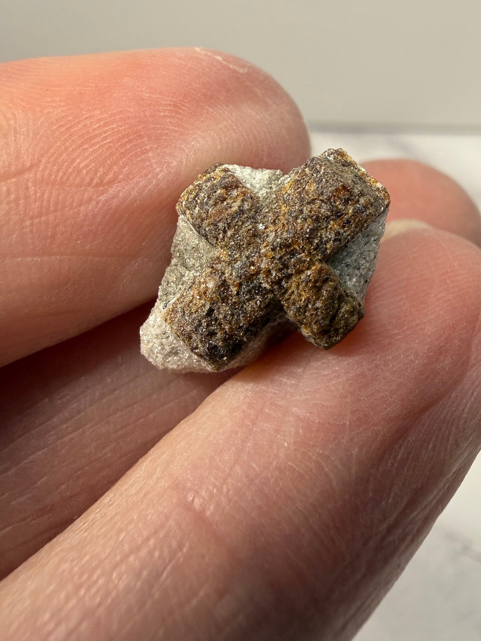 Staurolite, also known as Fairy stone or Fairy Cross, is a nesosilicate mineral that naturally occurs in cross shapes (cruciform). The minerals usually cross at a 60 or 90 degree angle, with some specimens representing a perfect perpendicular cross. Staurolite’s genetic makeup is very complex, containing aluminum, zinc, magnesium and iron.