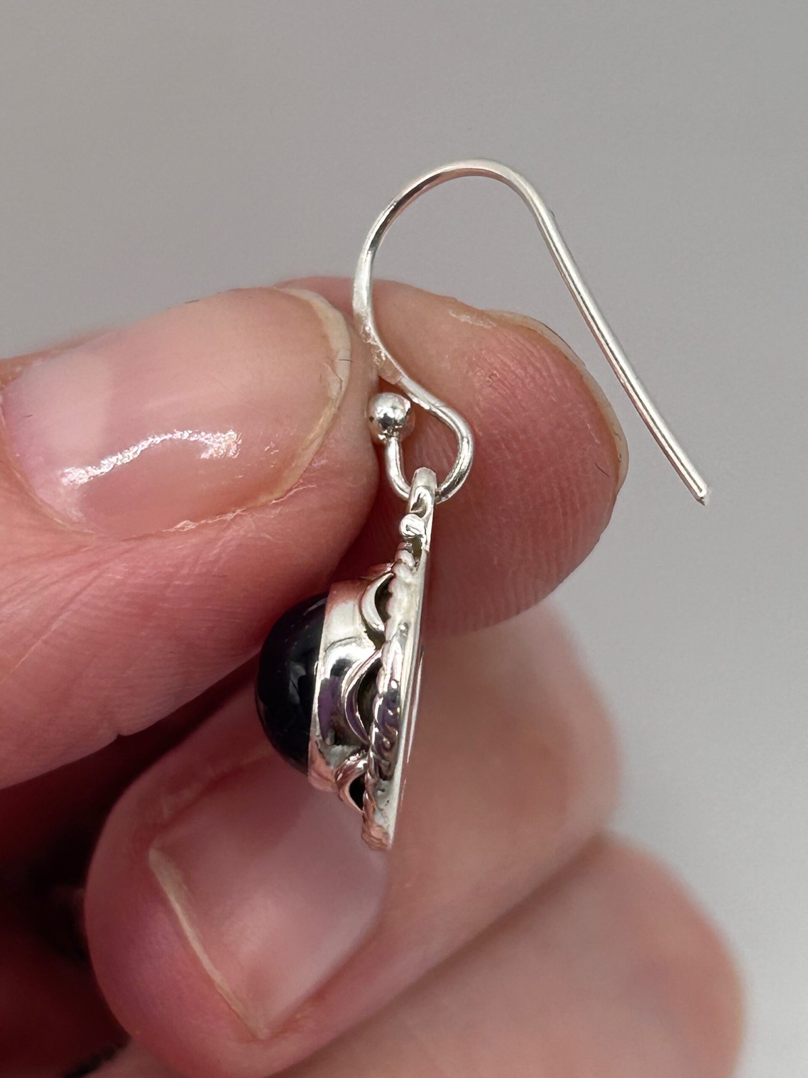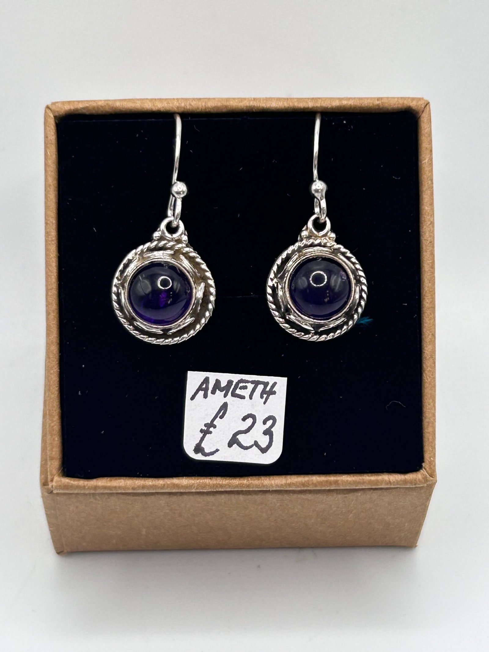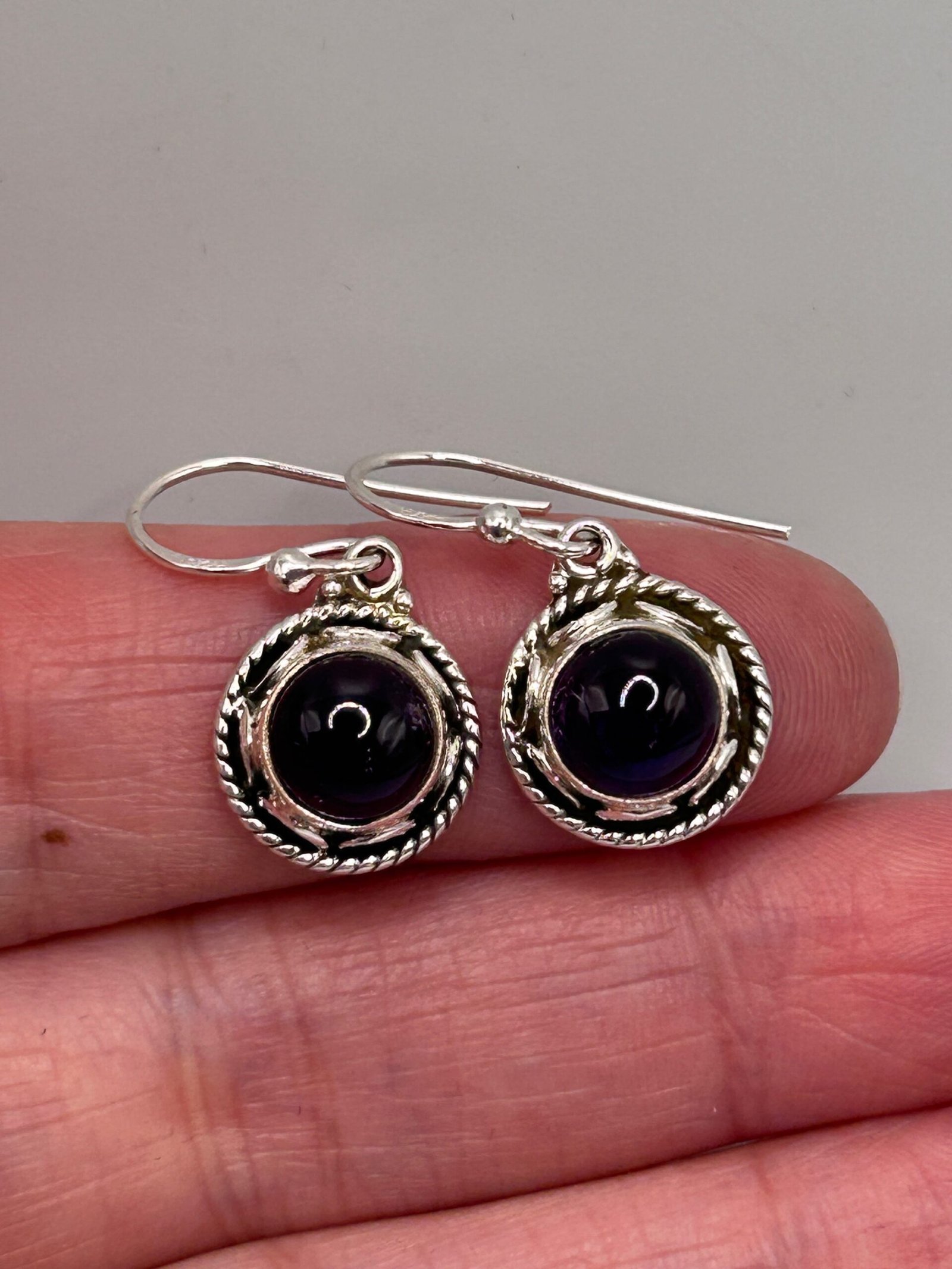 925 Sterling Silver drop earrings with amethyst cabochons.