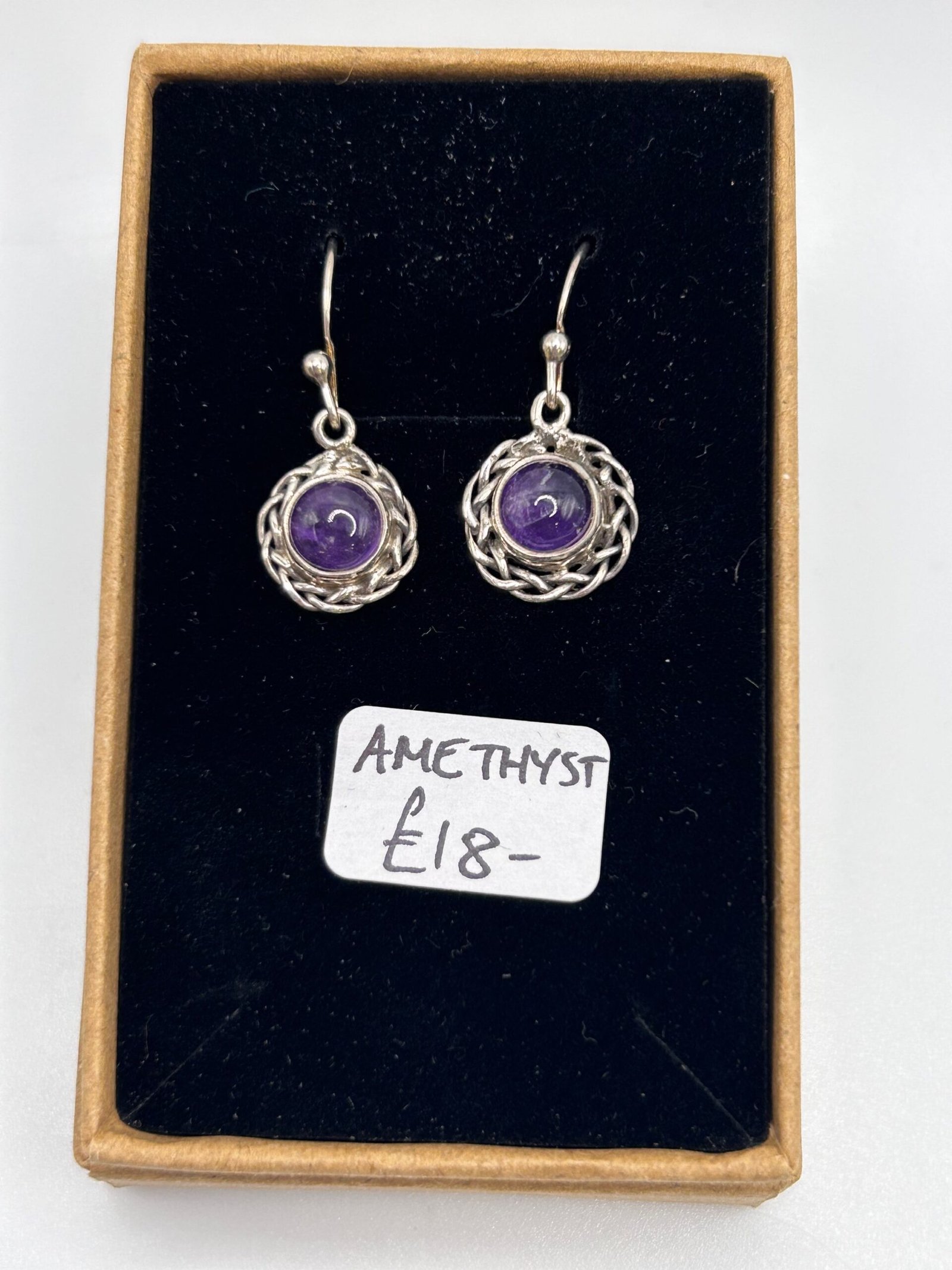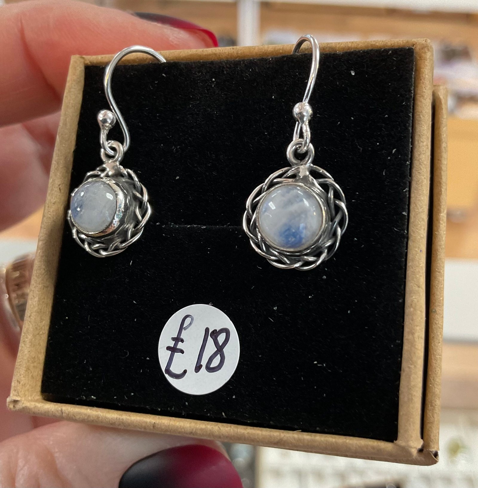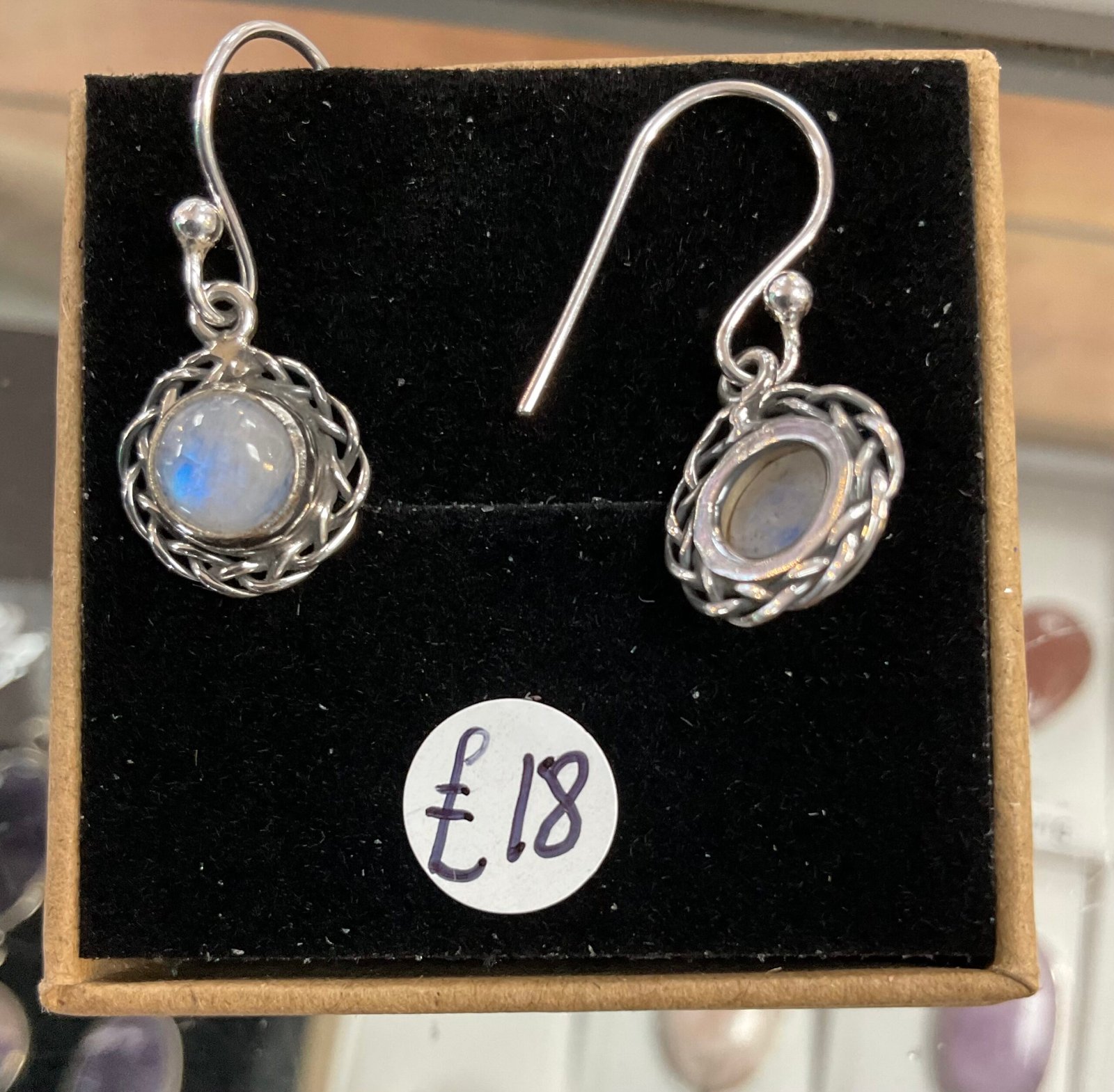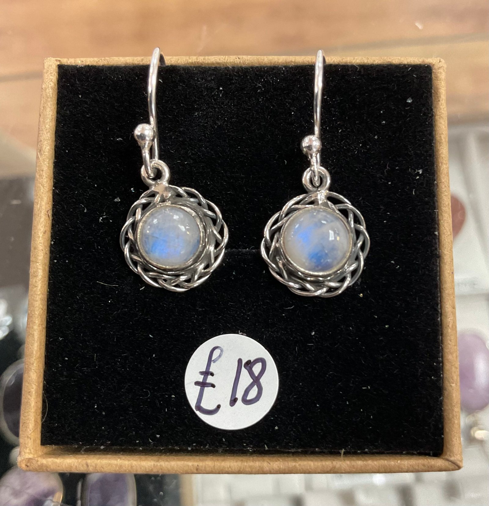 925 Sterling Silver earrings with beautiful Rainbow Moonstone cabochons surrounded by a lovely Celtic knot. These are drop earrings.
