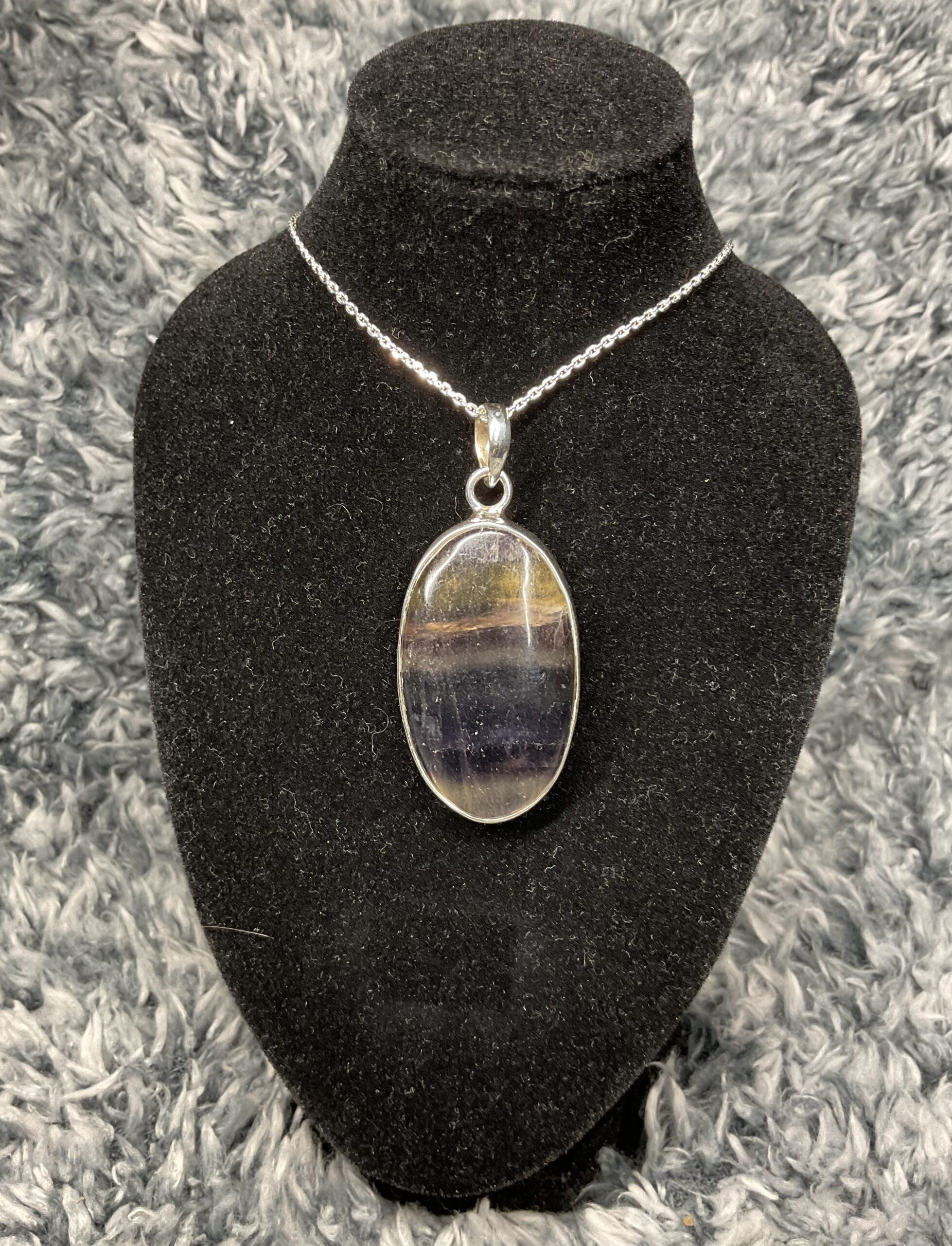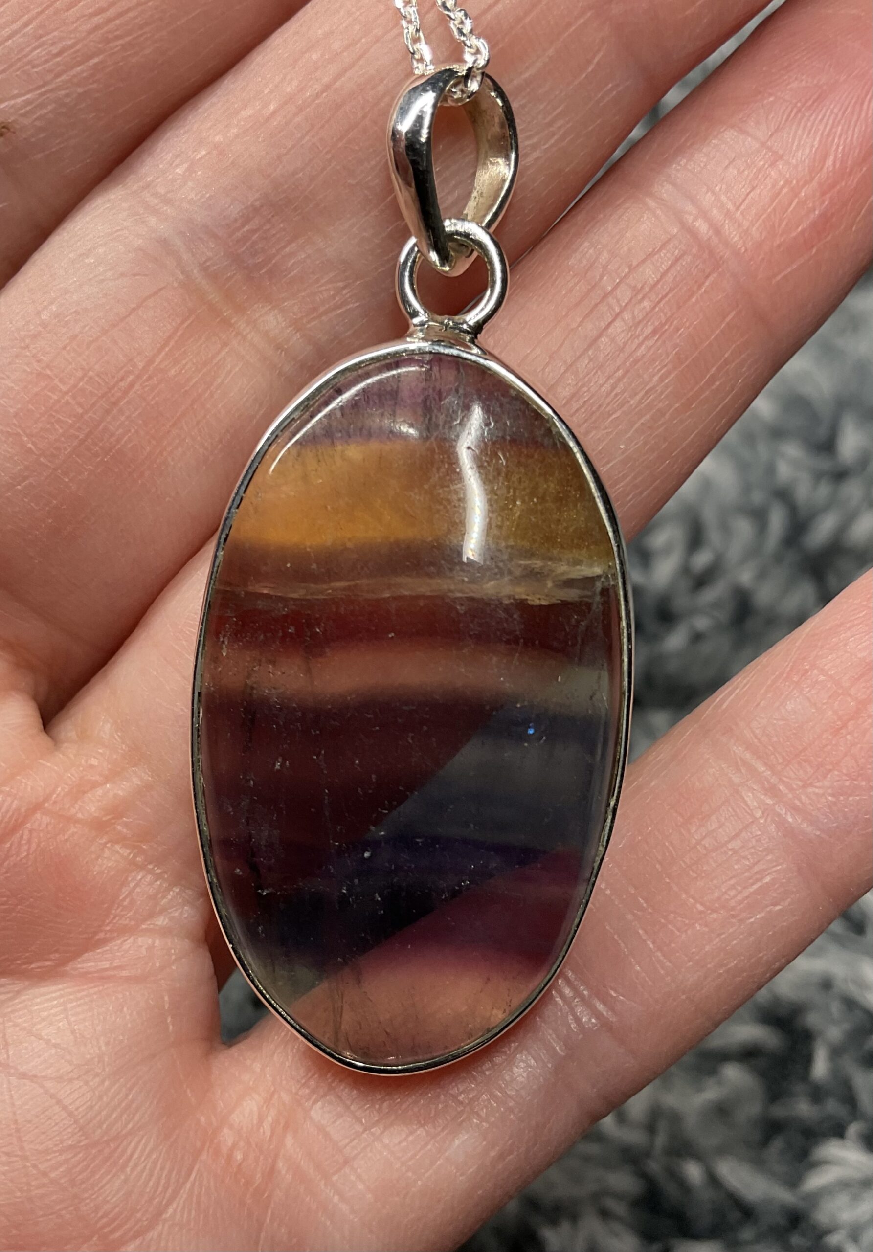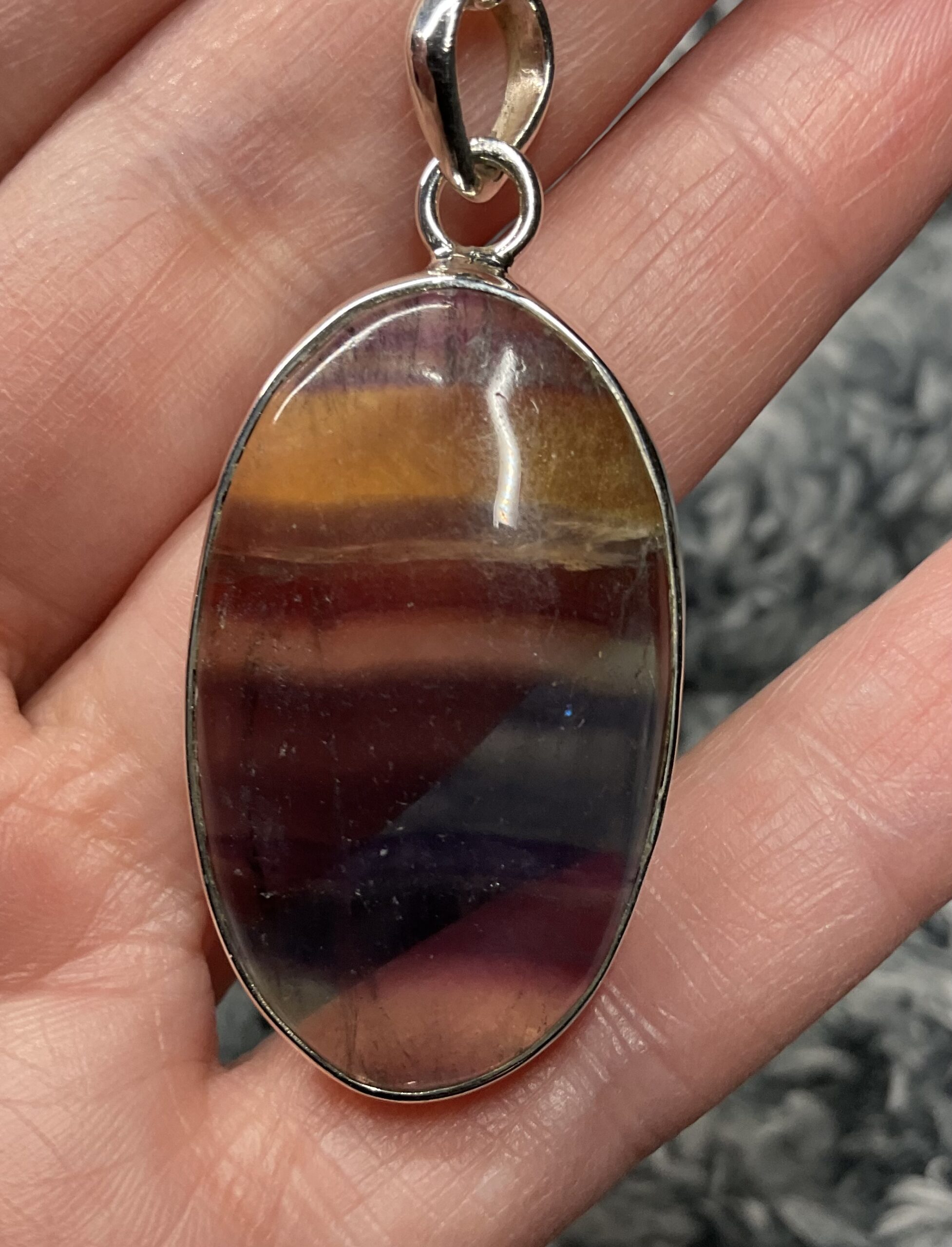 Beautiful colourful banded fluorite cabochon set in handmade sterling silver simple oval setting.
