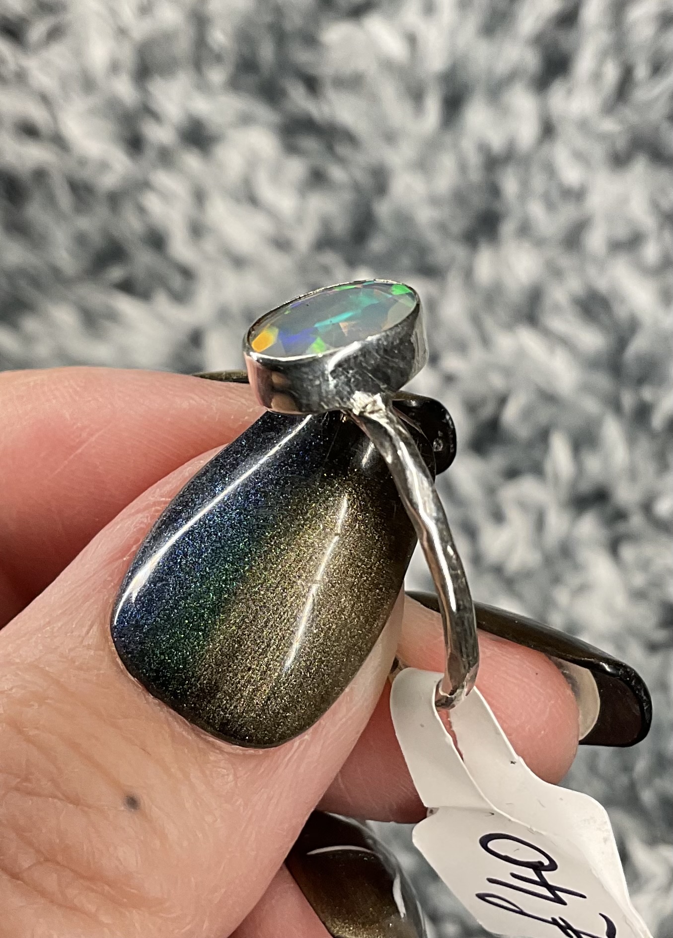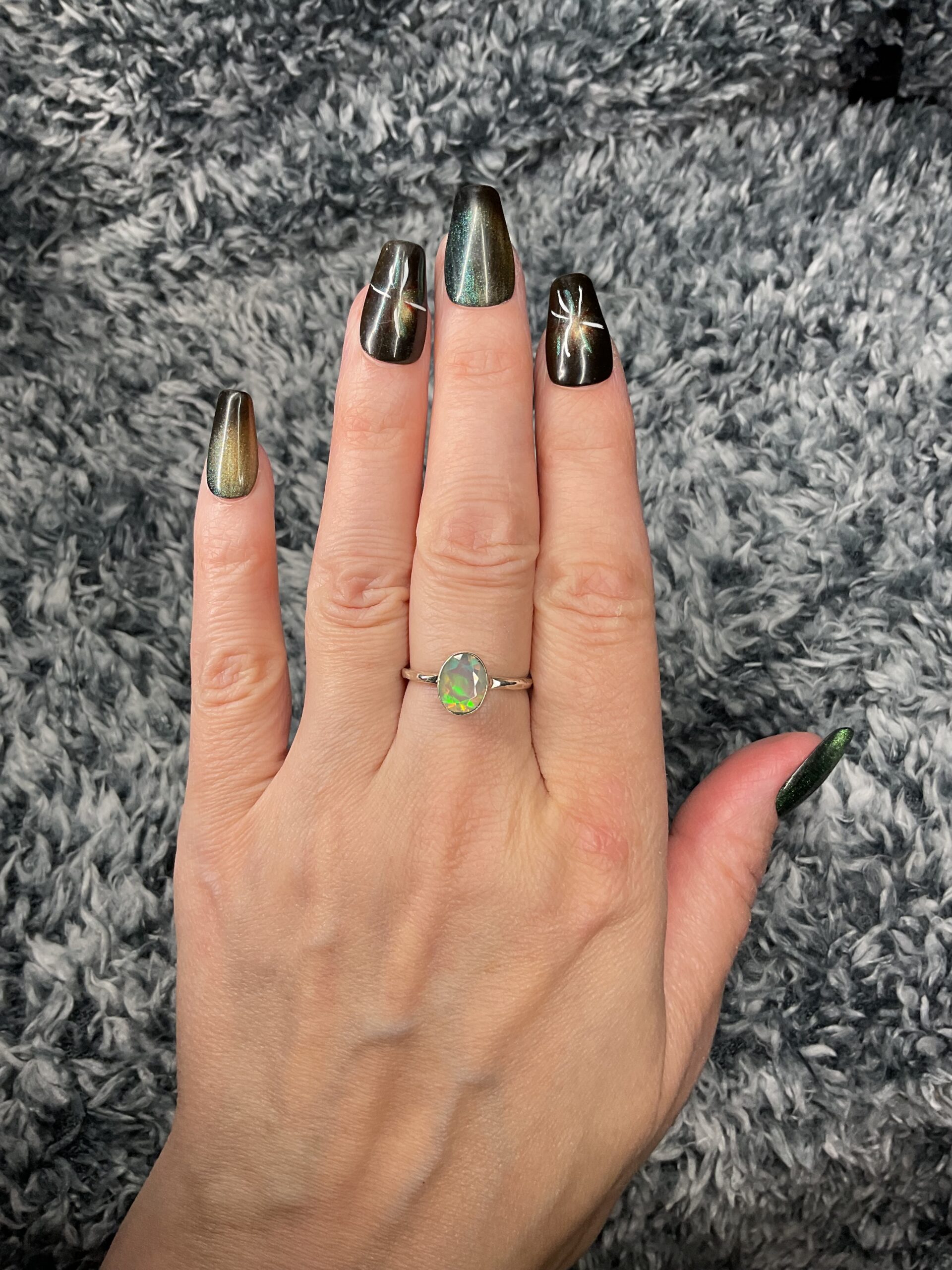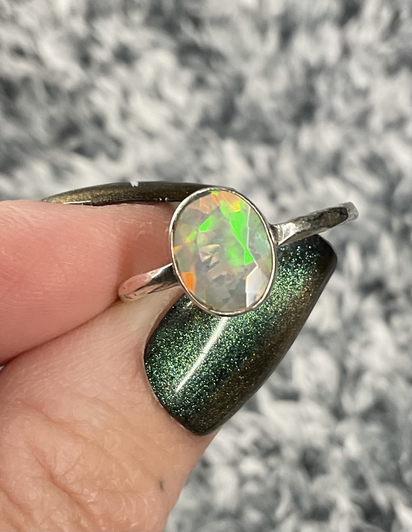 A stunning genuine faceted Welo Opal with stunning colour play, set in a sterling silver ring.