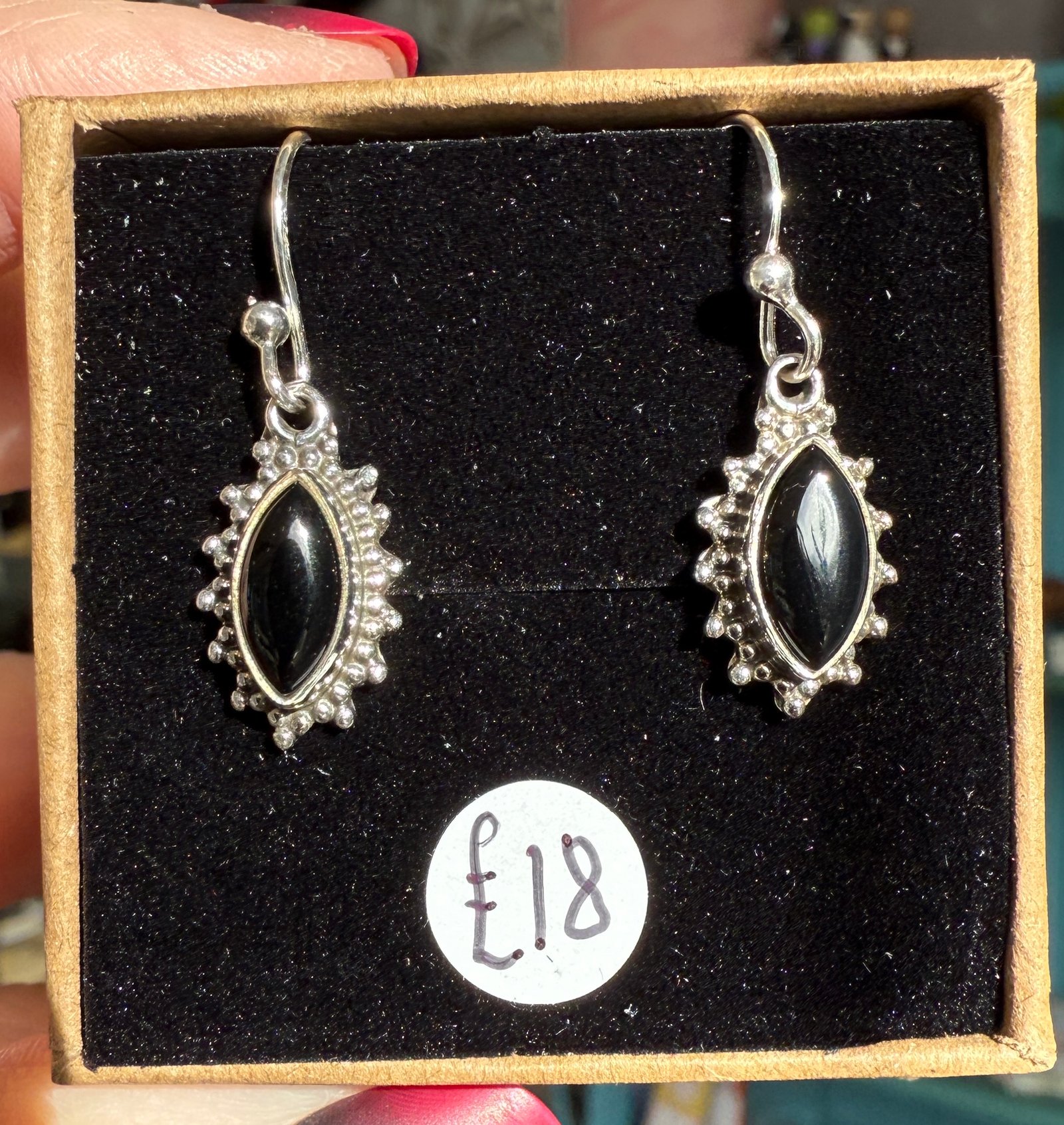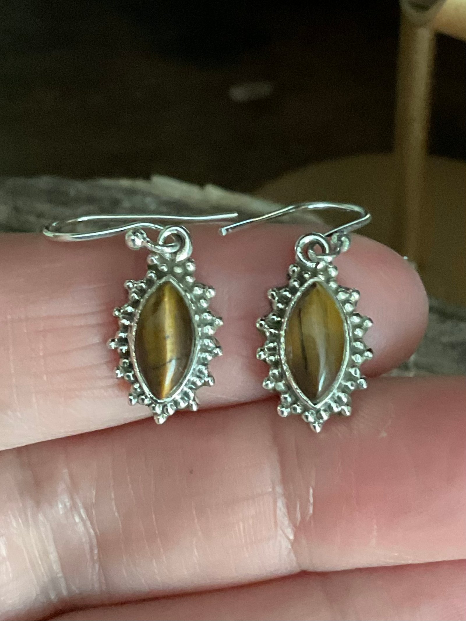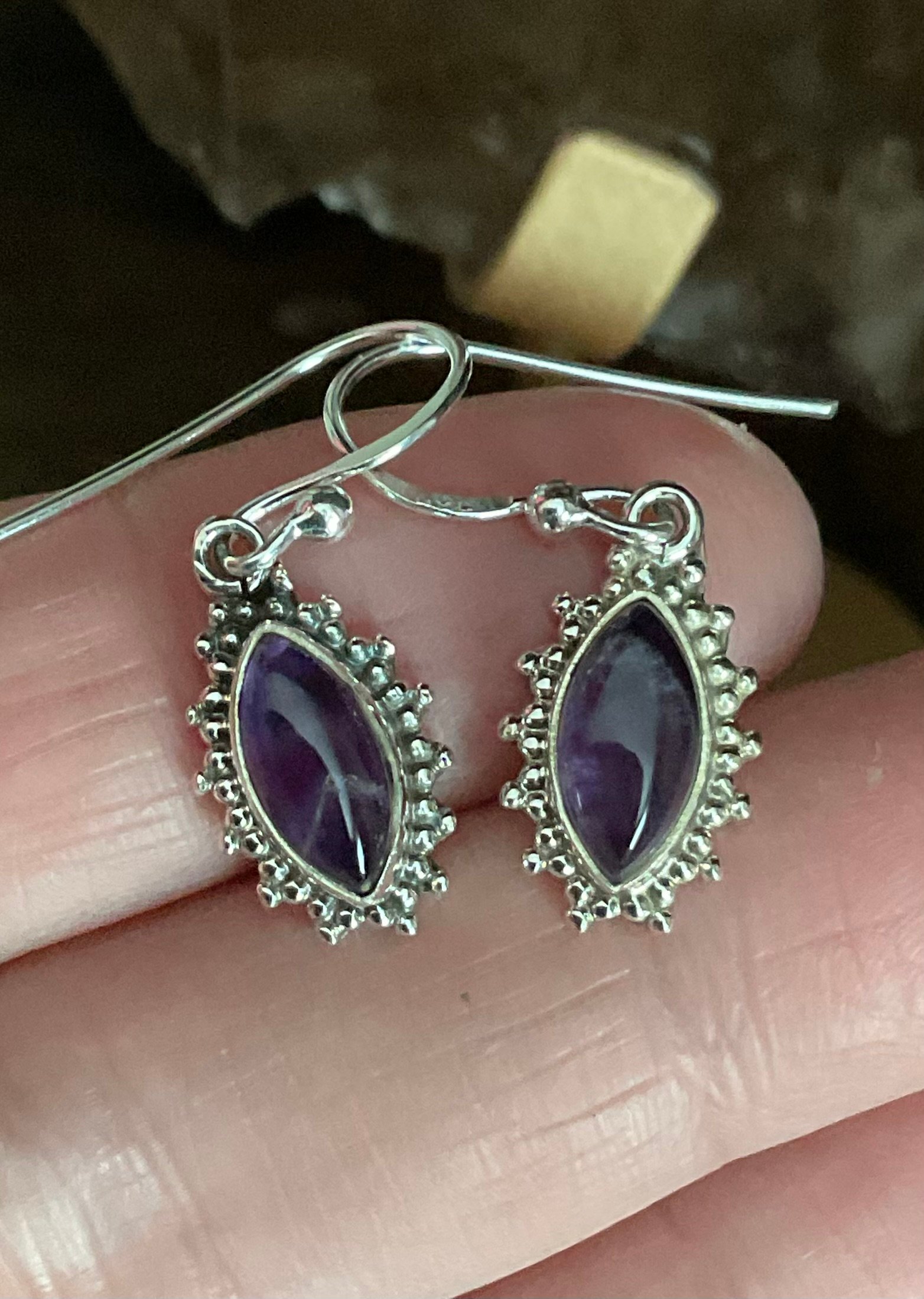 925 Sterling Silver drop earrings with beautiful gemstone cabochons, within beautiful ornate design.