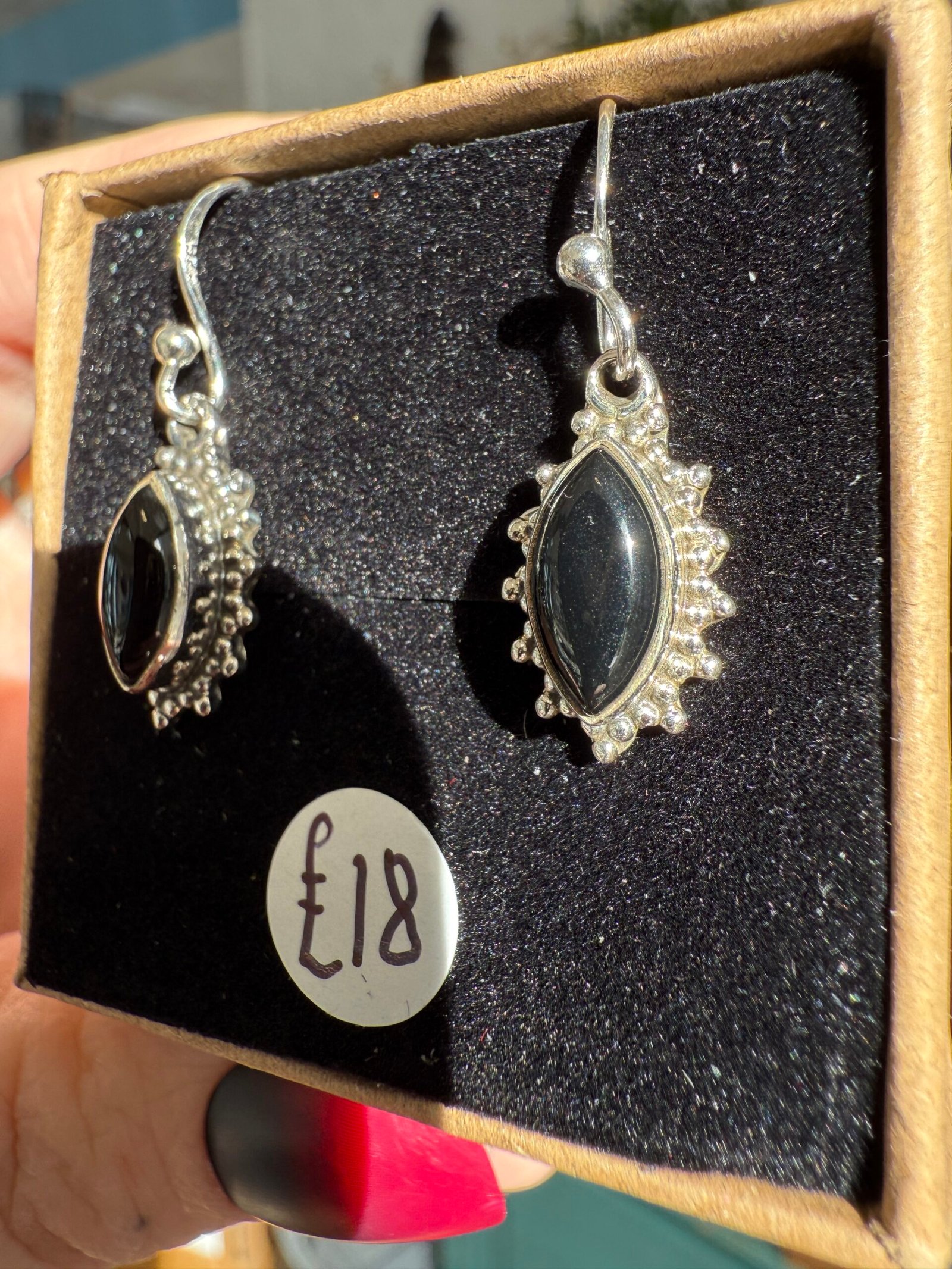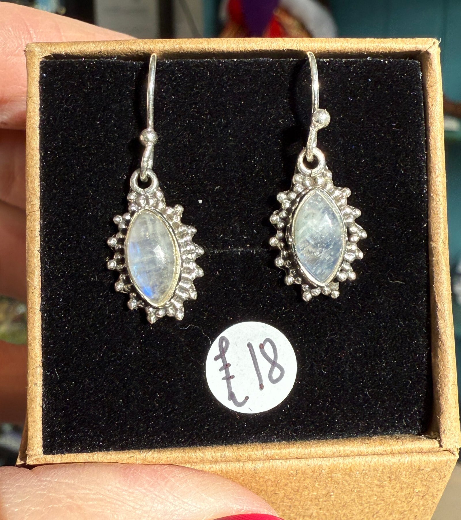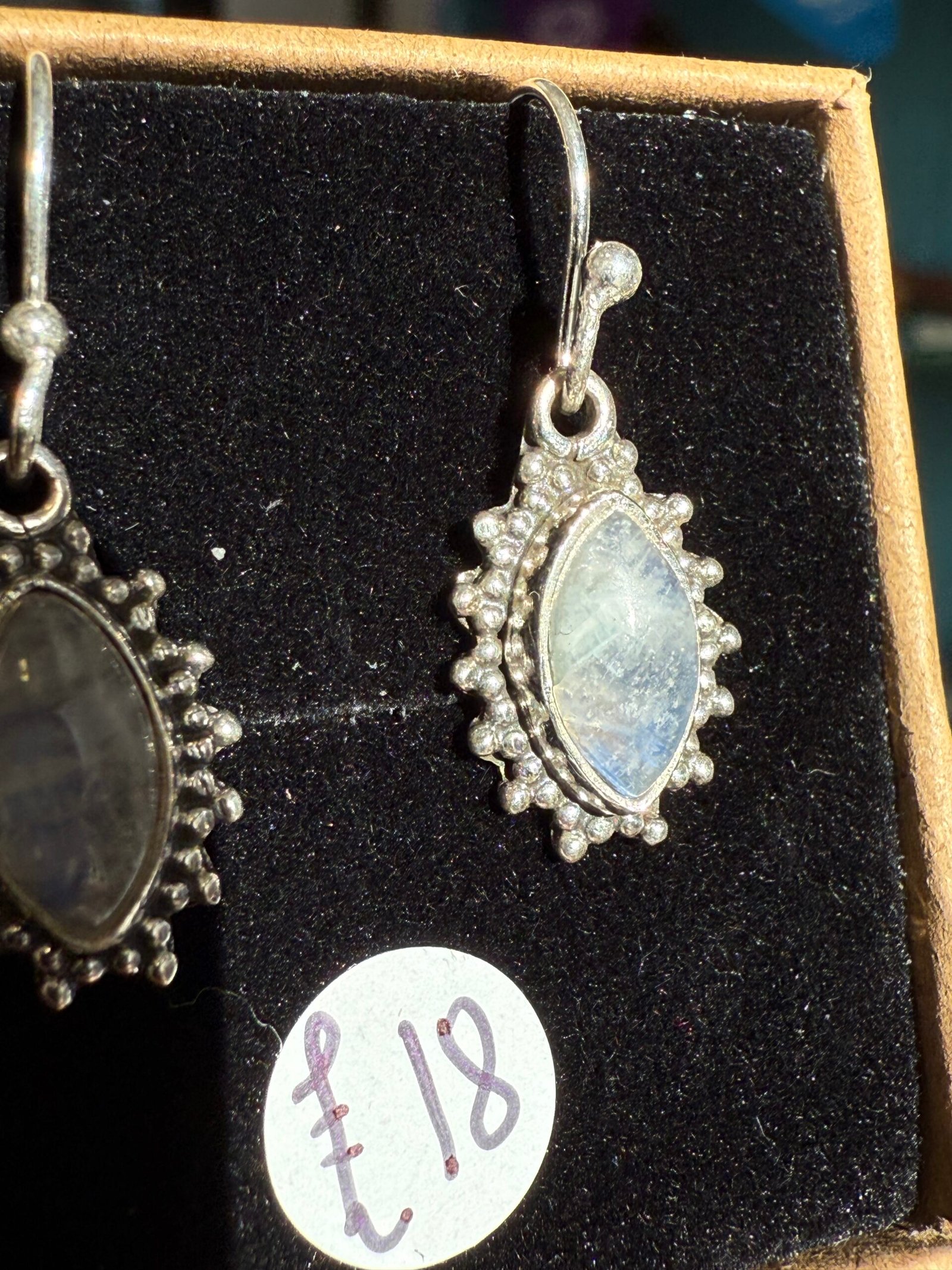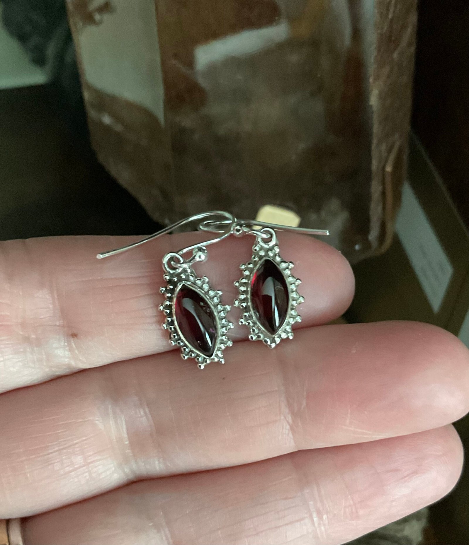 925 Sterling Silver drop earrings with beautiful gemstone cabochons, within beautiful ornate design.
