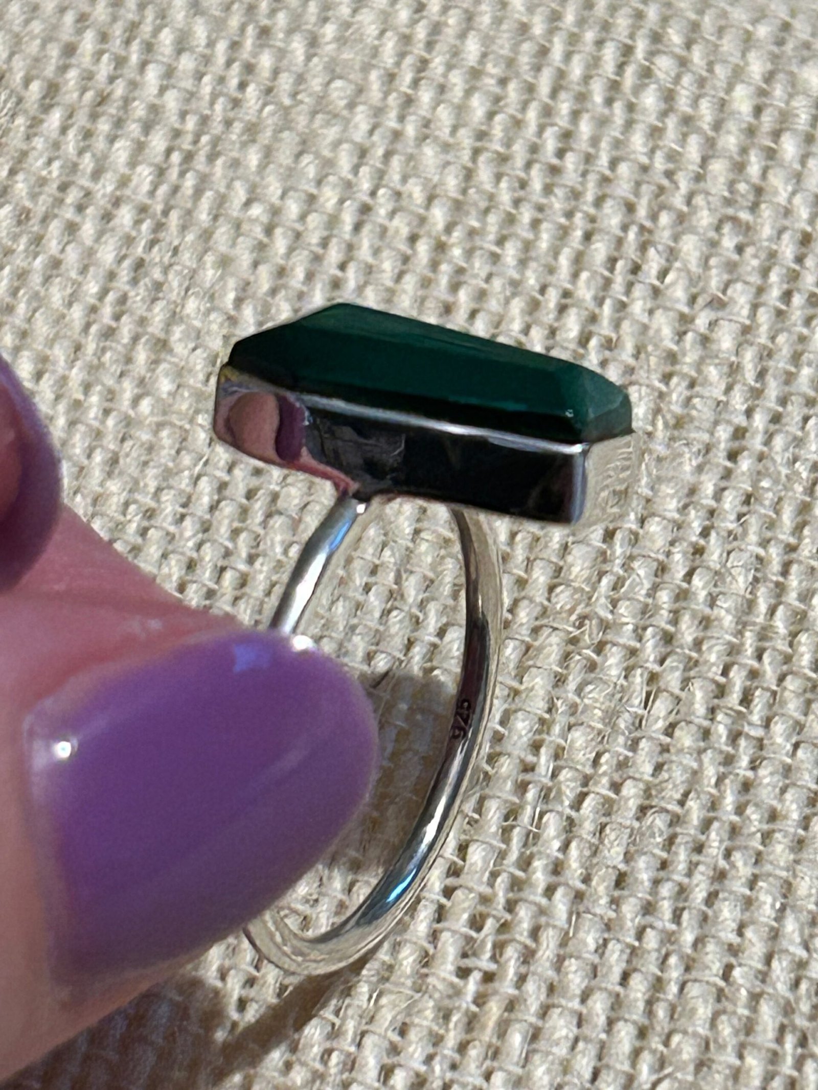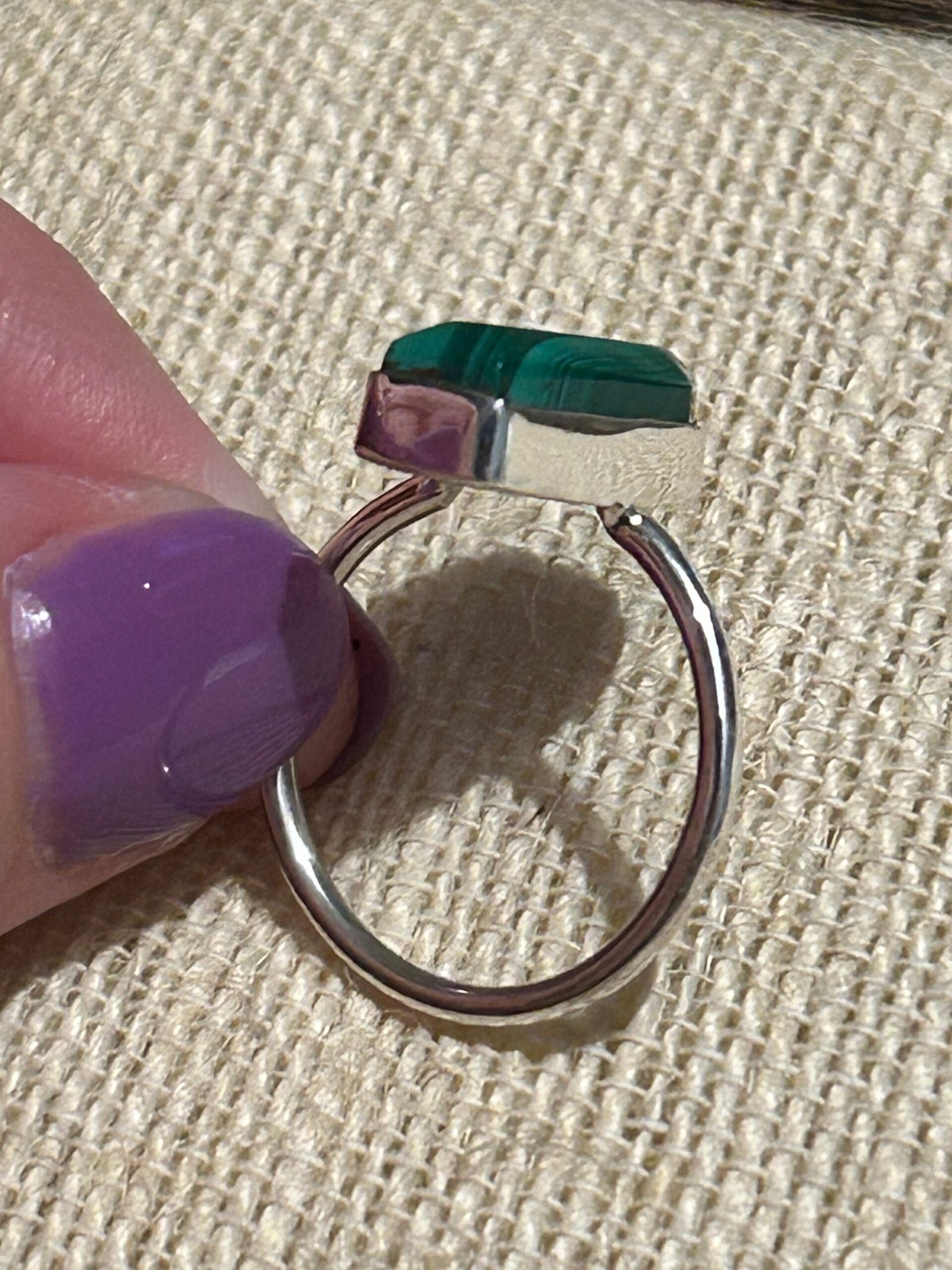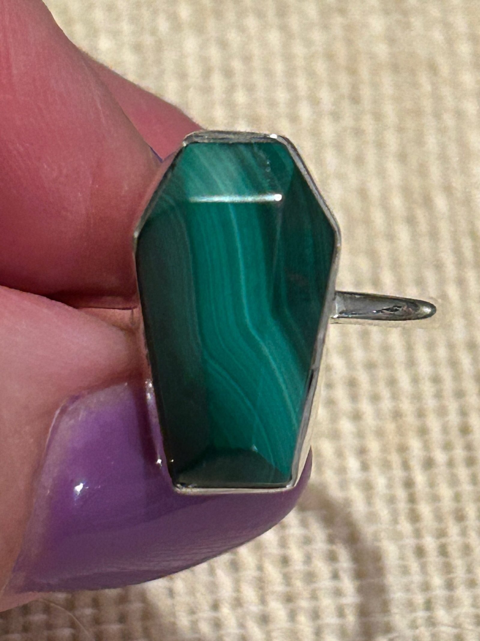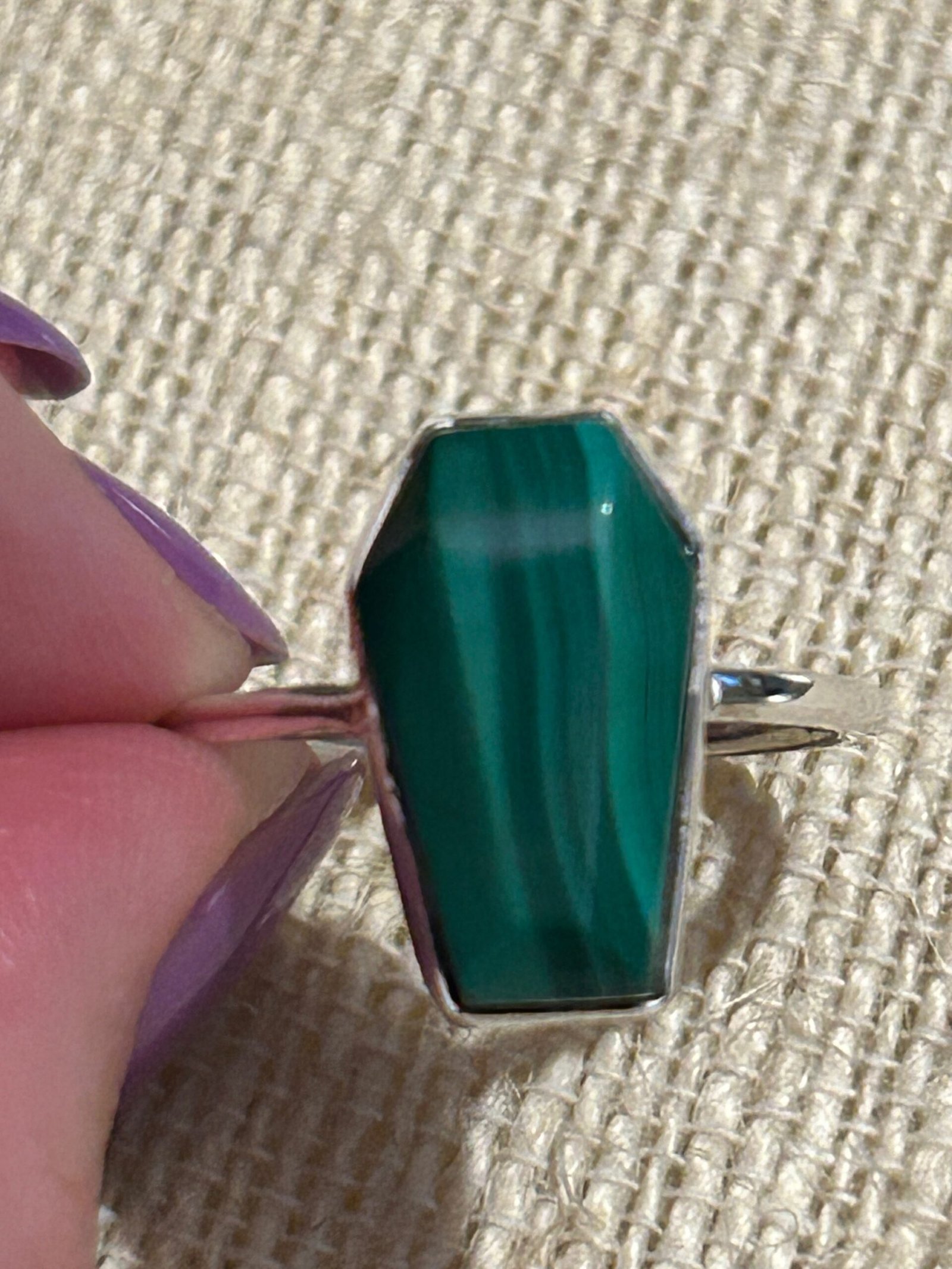 925 Sterling Silver ring set with genuine coffin shaped malachite cabochon.