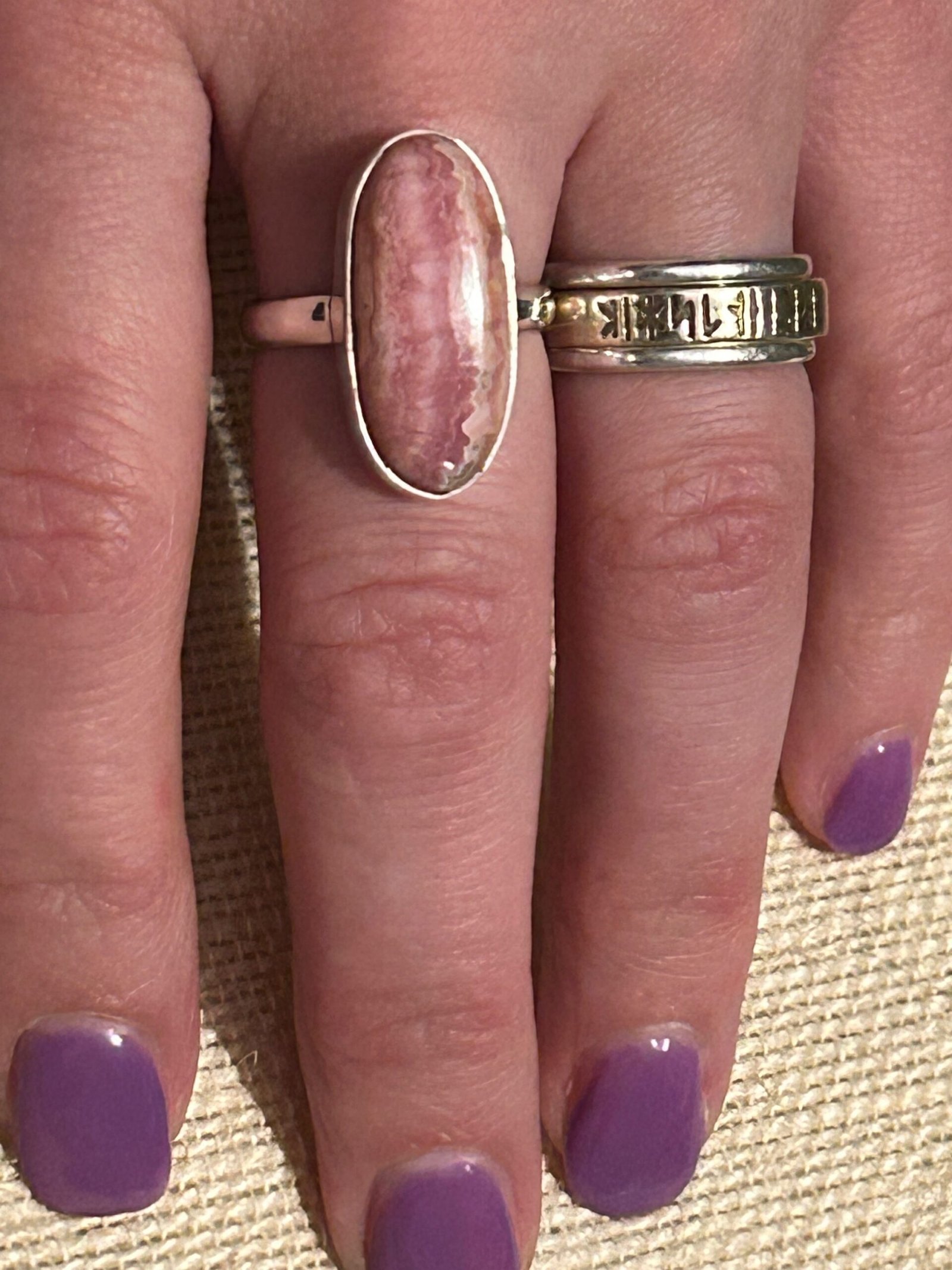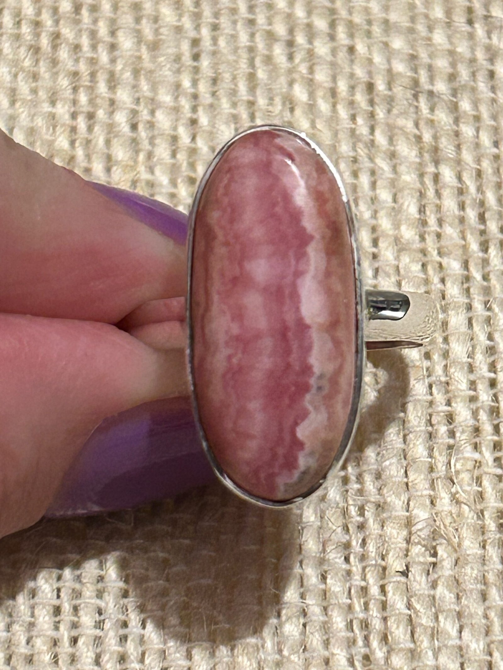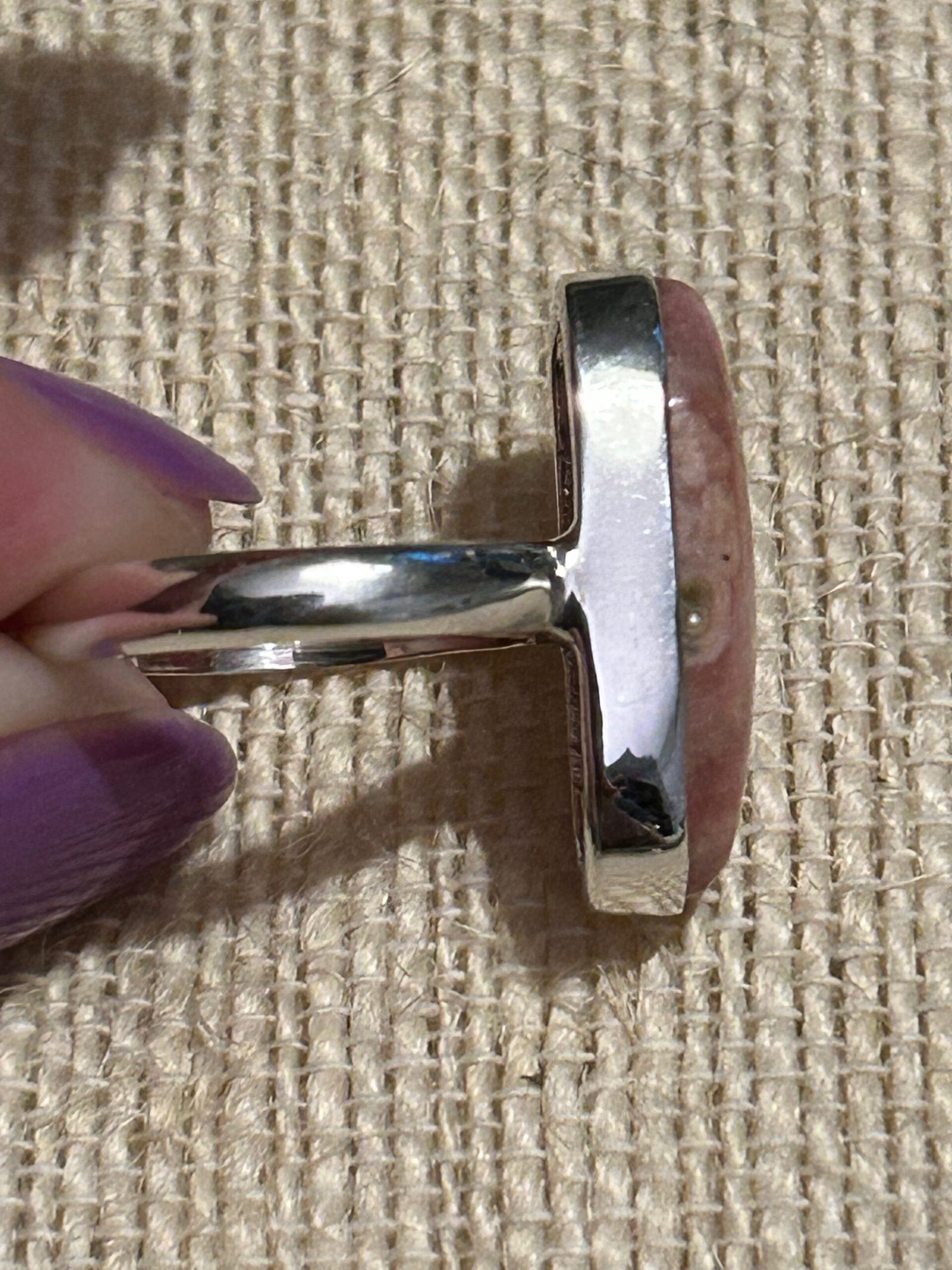 925 Sterling Silver ring set with a fabulous rhodochrosite cabochon.