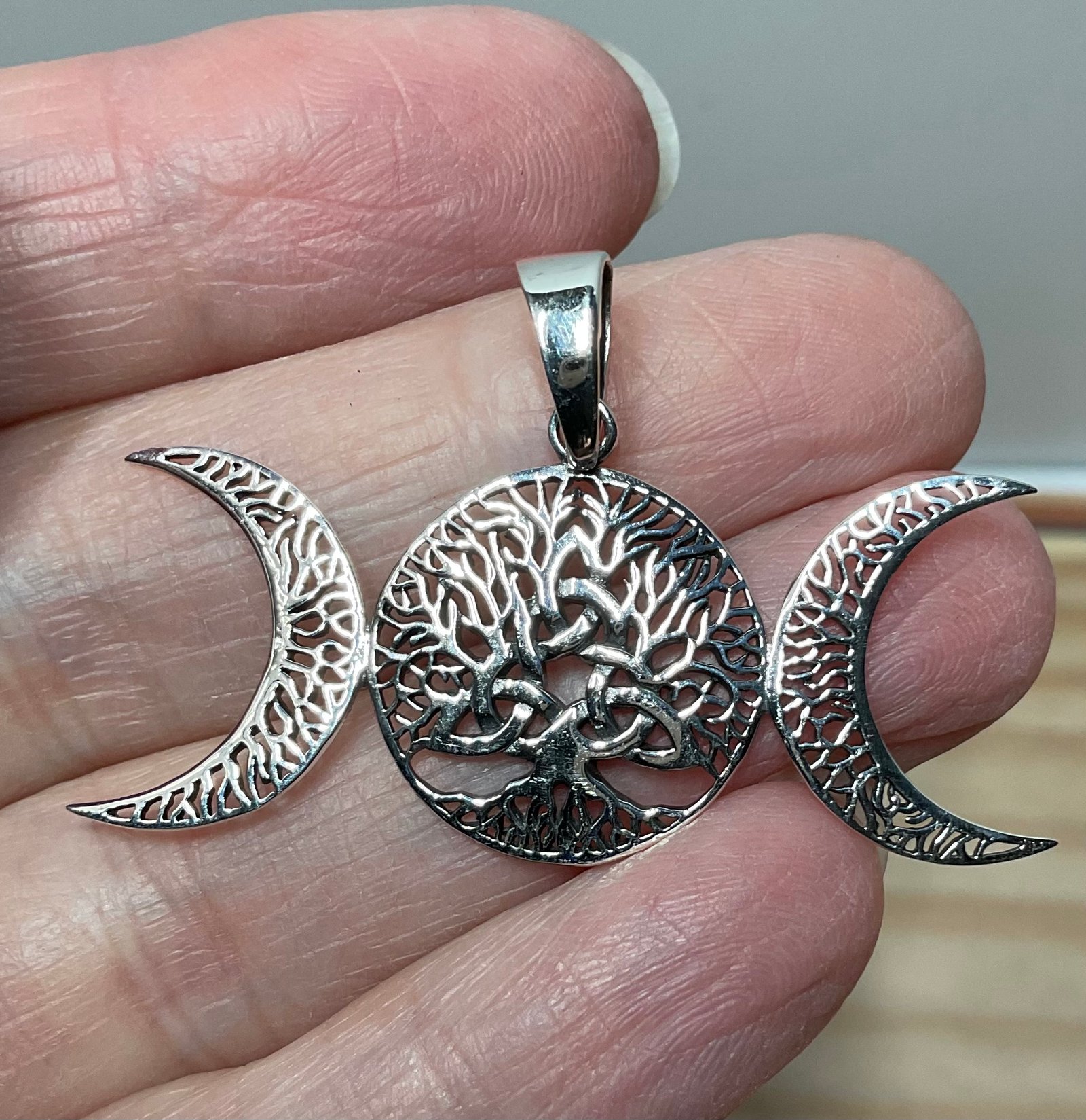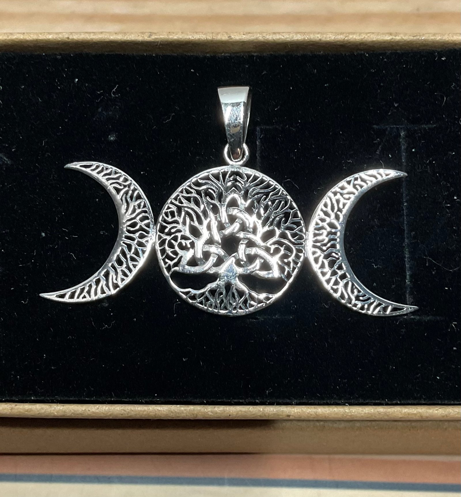 925 Sterling silver triple moon with tree of life and triquetra at the centre, in the full moon.
