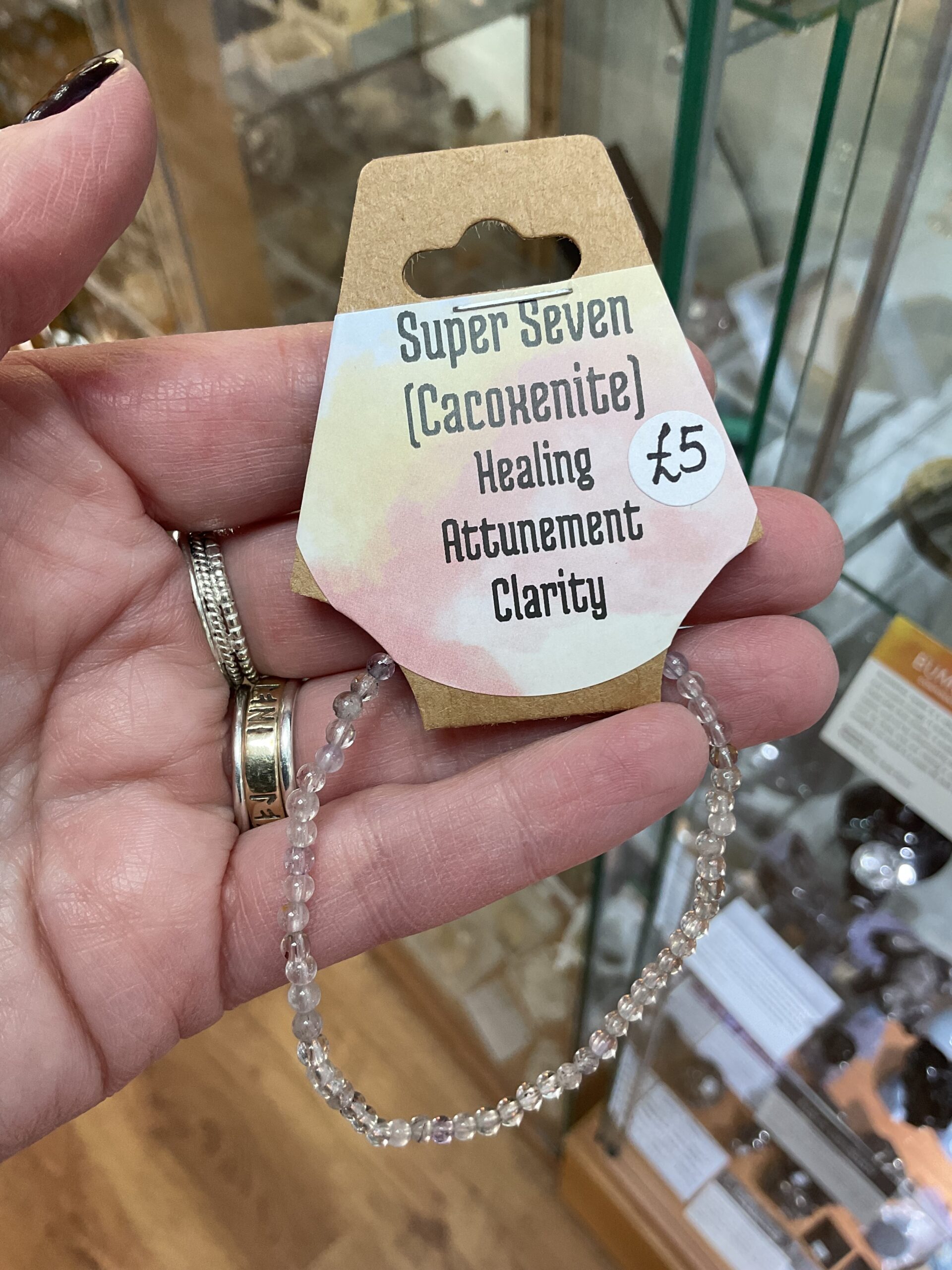 Super Seven is a rare mineral with seven crystals in one; Amethyst, Cacoxenite, Goethite, Lepidocrocite, Rutile, Smoky Quartz, and Quartz.